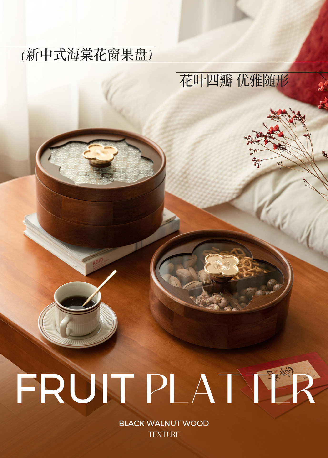 • 더블 레이어 라운드 베고니아 꽃과 과일 접시 - 네잎 클로버 손잡이 - 28cm