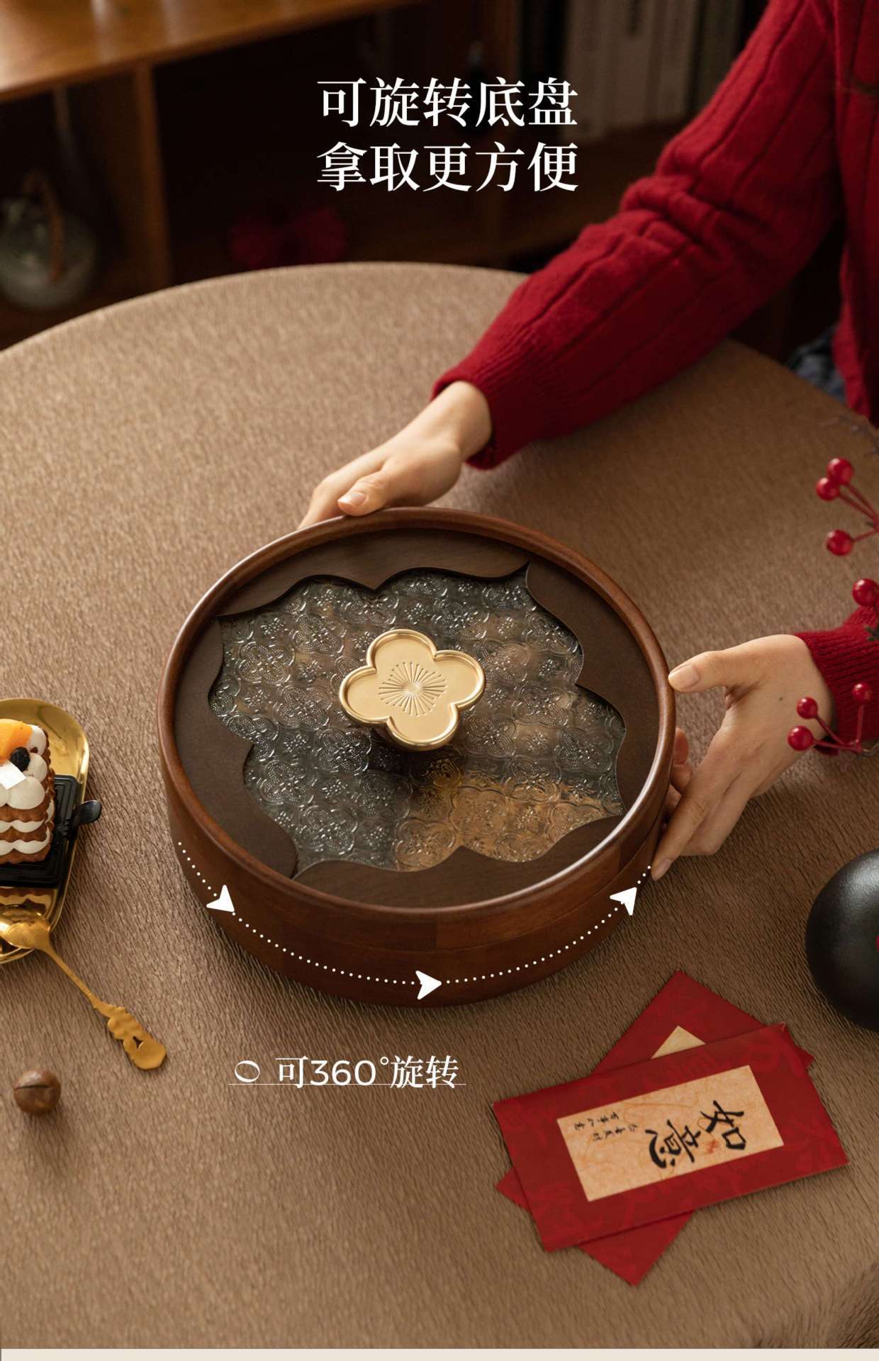 • 단층 원형 투명 과일 접시 - 나뭇결 손잡이 - 38cm