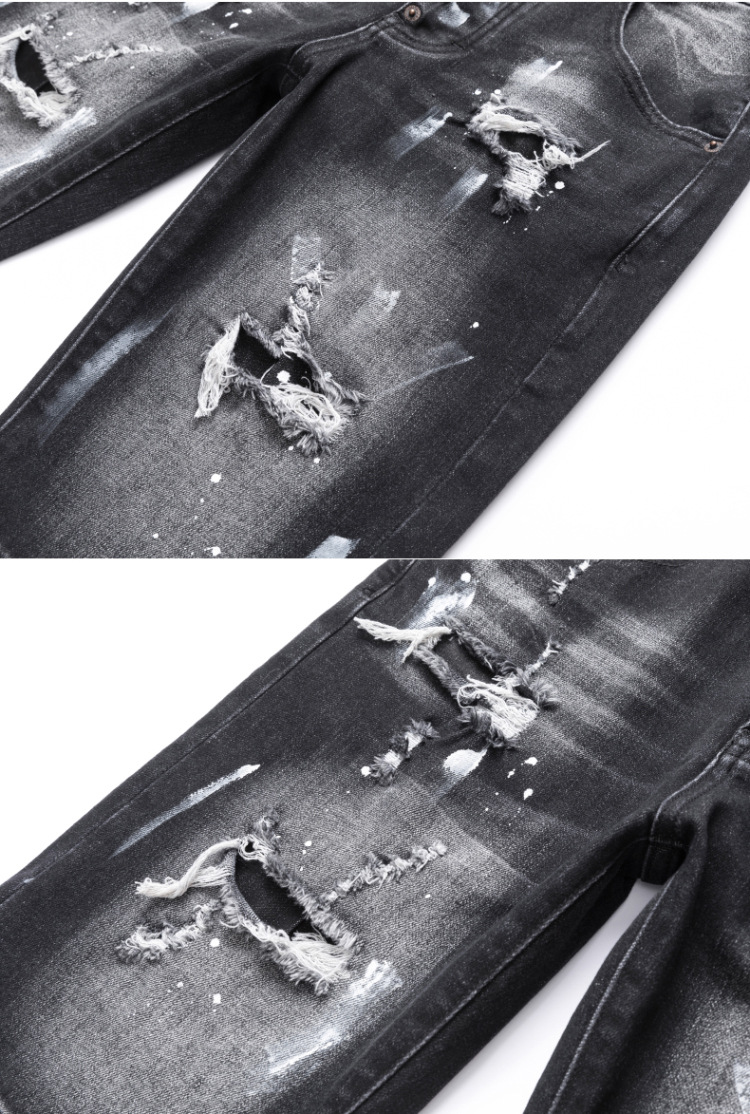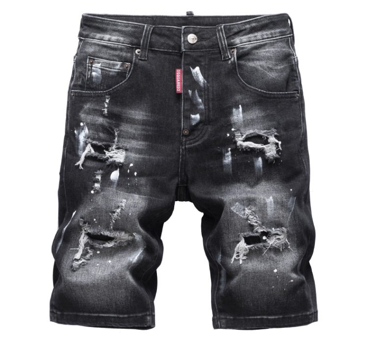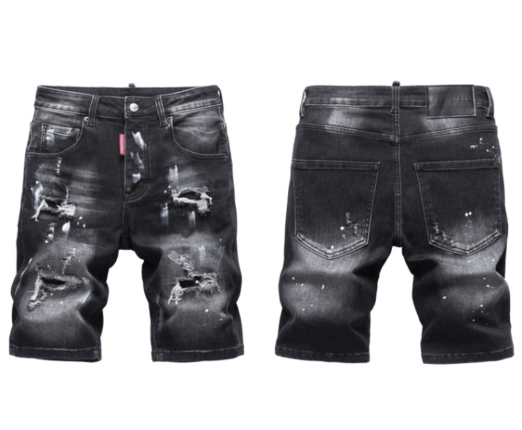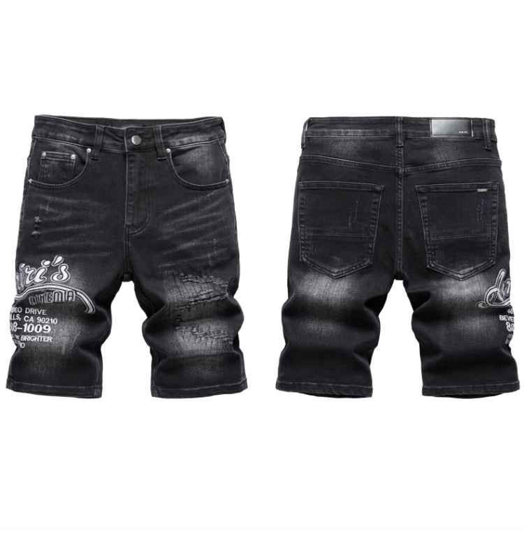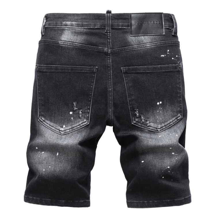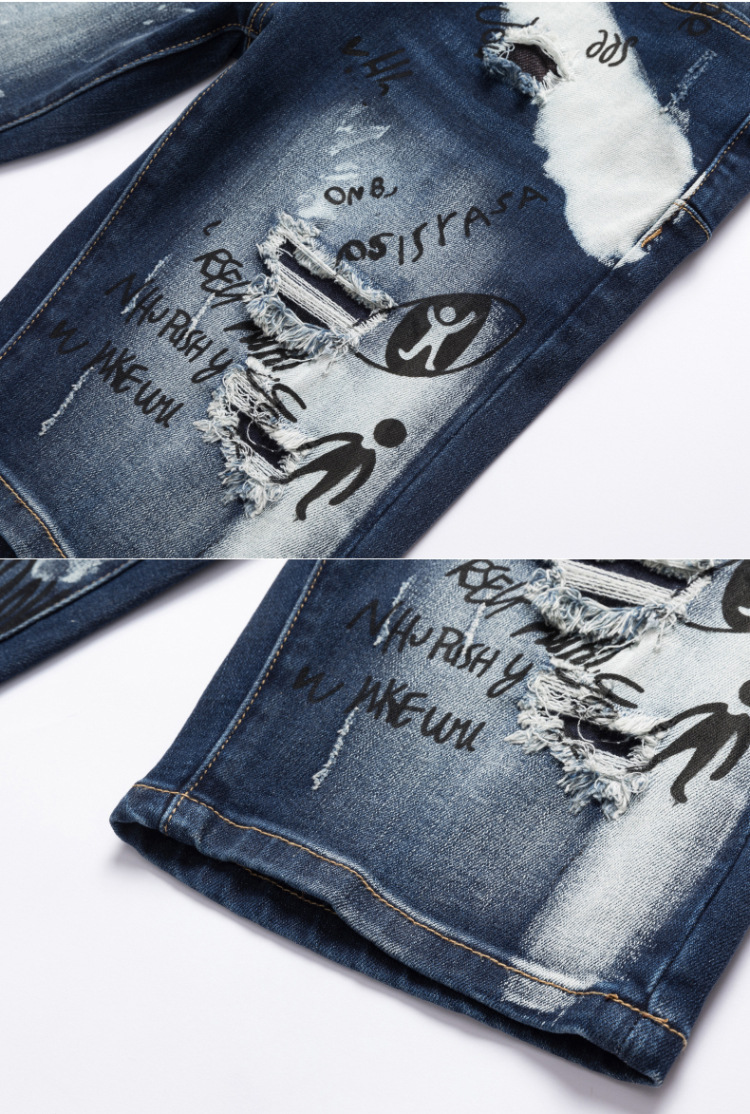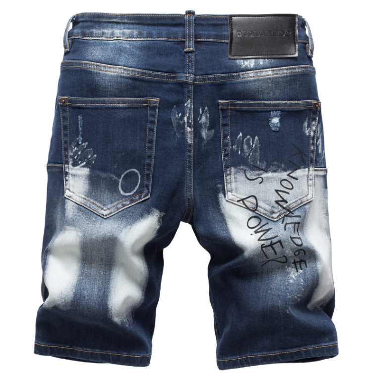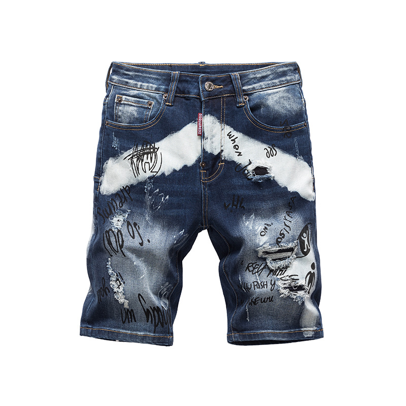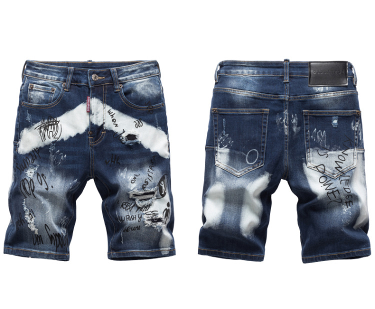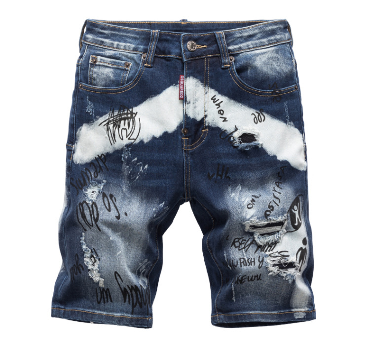 여름 트렌디 브랜드 스플래시 잉크 프린트 데님 반바지 남성용 찢어진 패치 스트레치 슬림핏 5부 바지 패셔너블하고 캐주얼한 트렌드스토어 가기