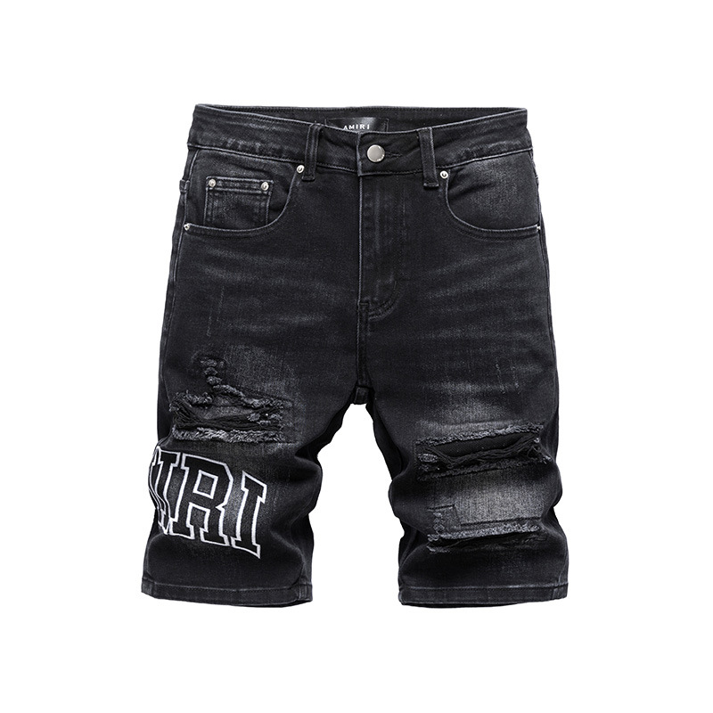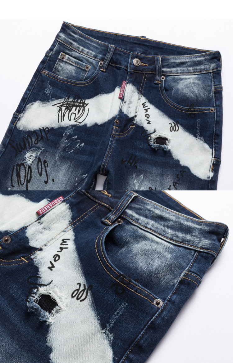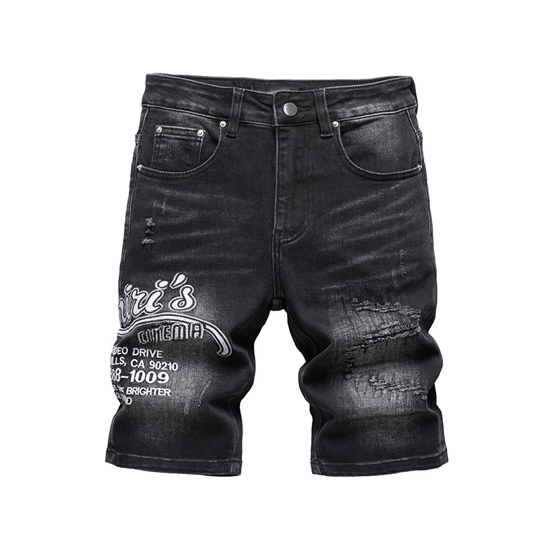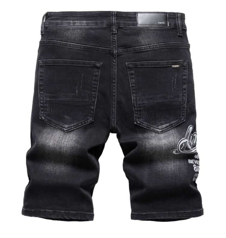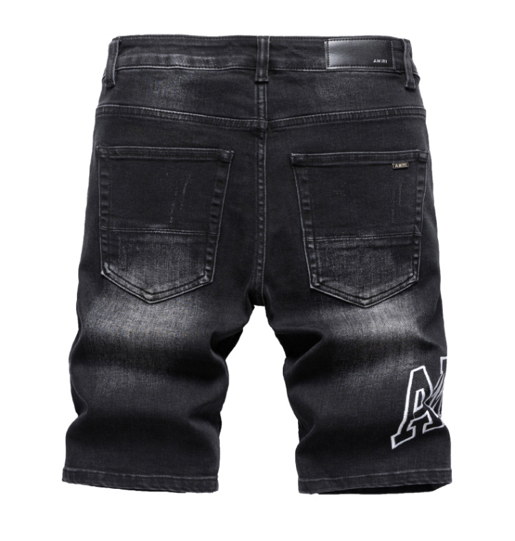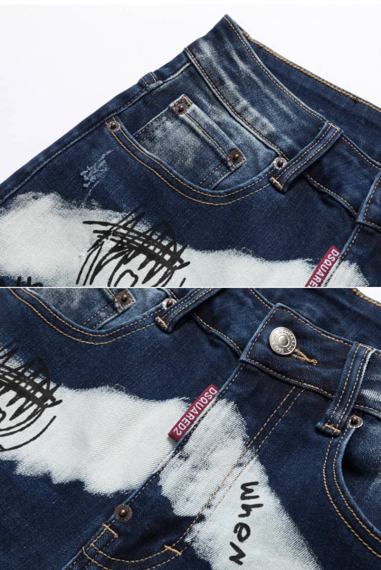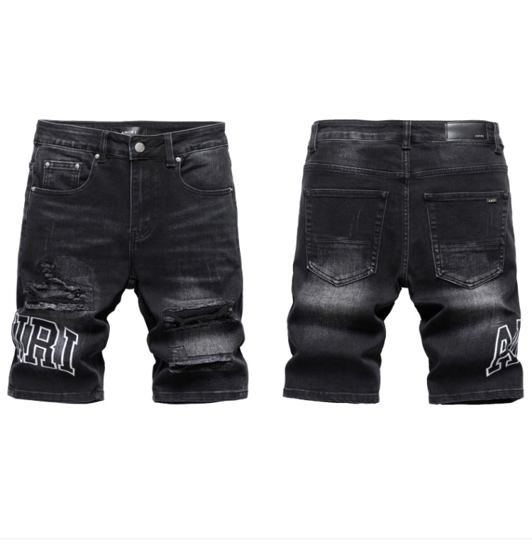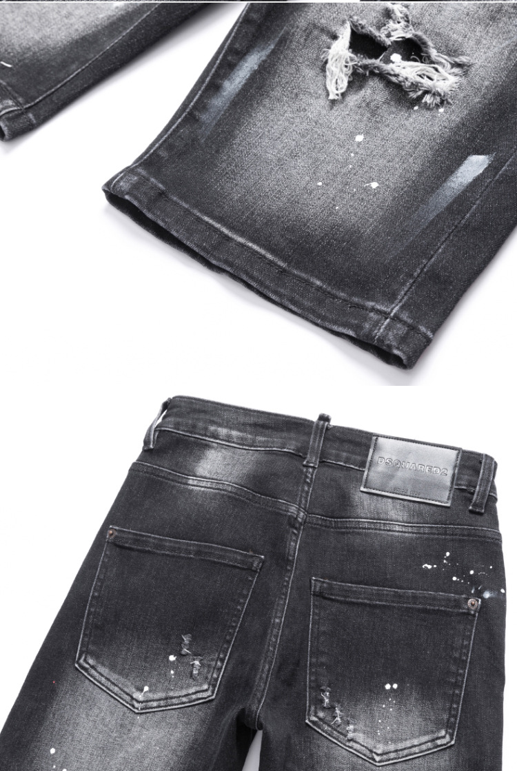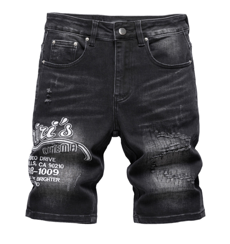 여름 트렌디 브랜드 스플래시 잉크 프린트 데님 반바지 남성용 찢어진 패치 스트레치 슬림핏 5부 바지 패셔너블하고 캐주얼한 트렌드스토어 가기
