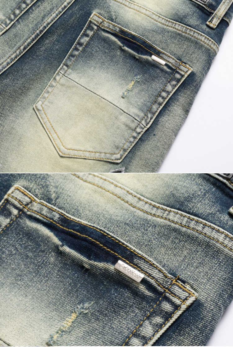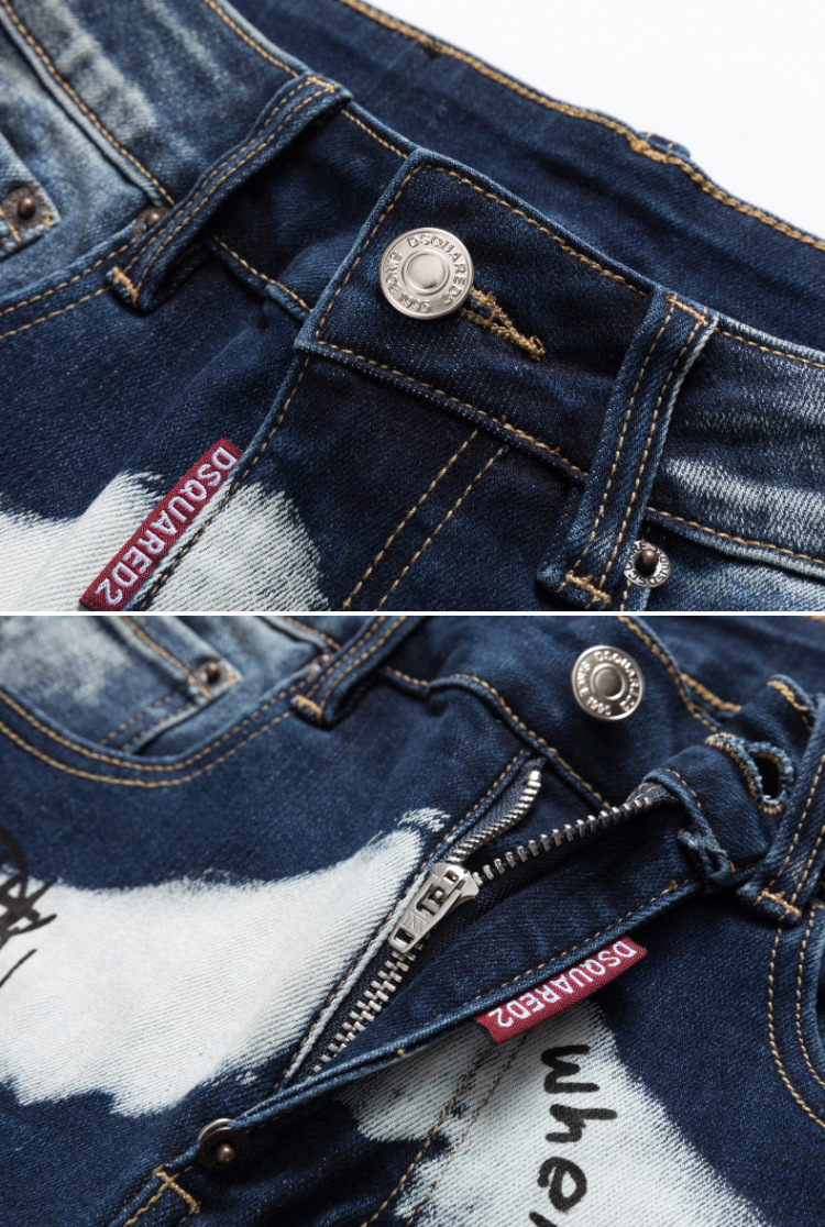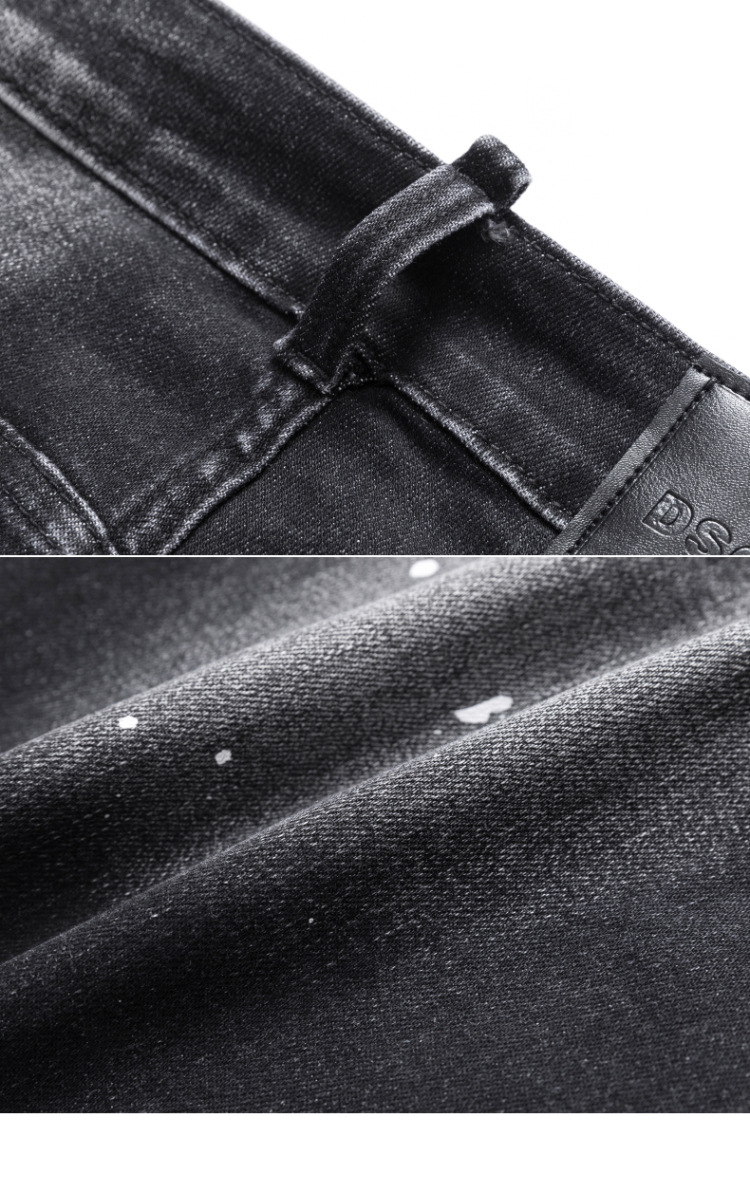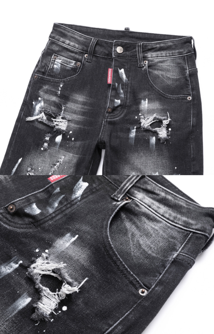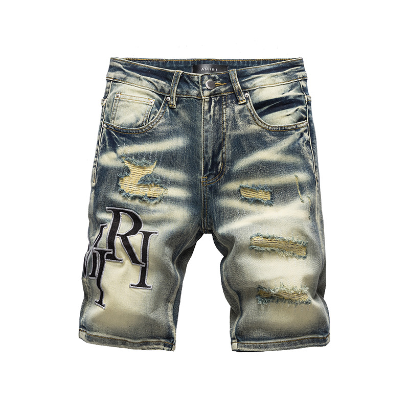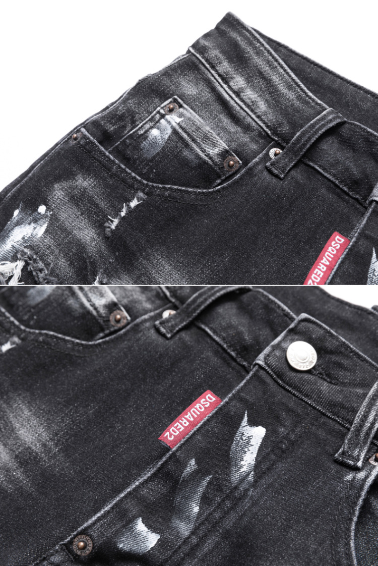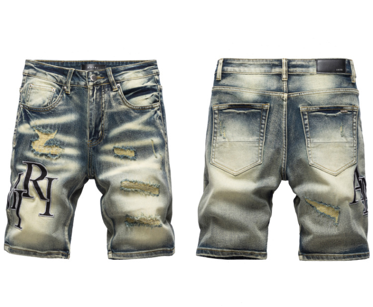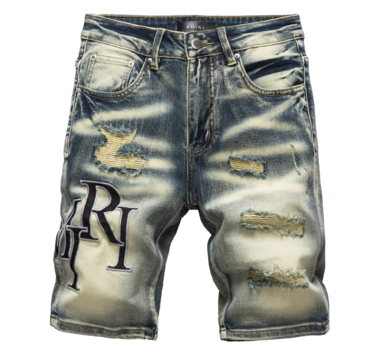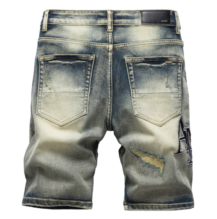 여름 트렌디 브랜드 스플래시 잉크 프린트 데님 반바지 남성용 찢어진 패치 스트레치 슬림핏 5부 바지 패셔너블하고 캐주얼한 트렌드스토어 가기