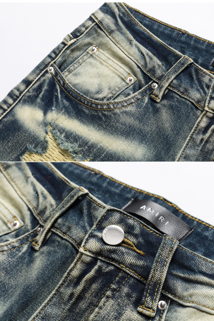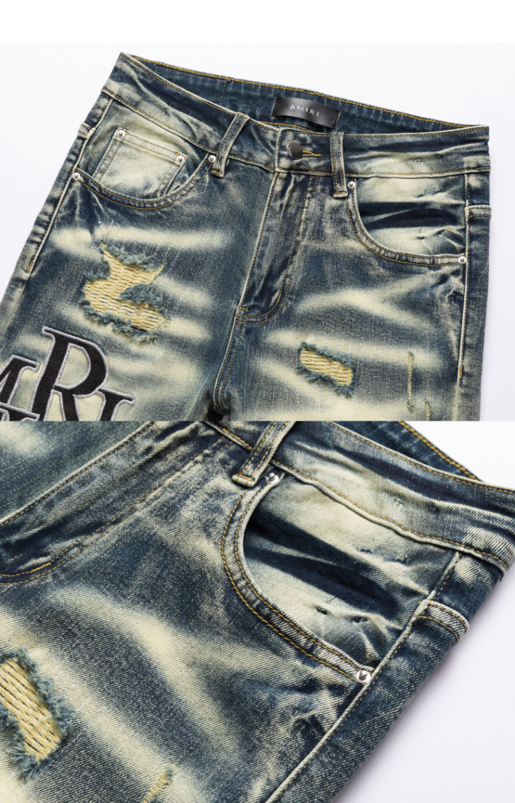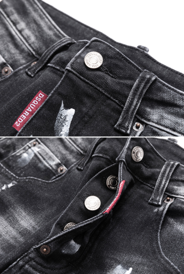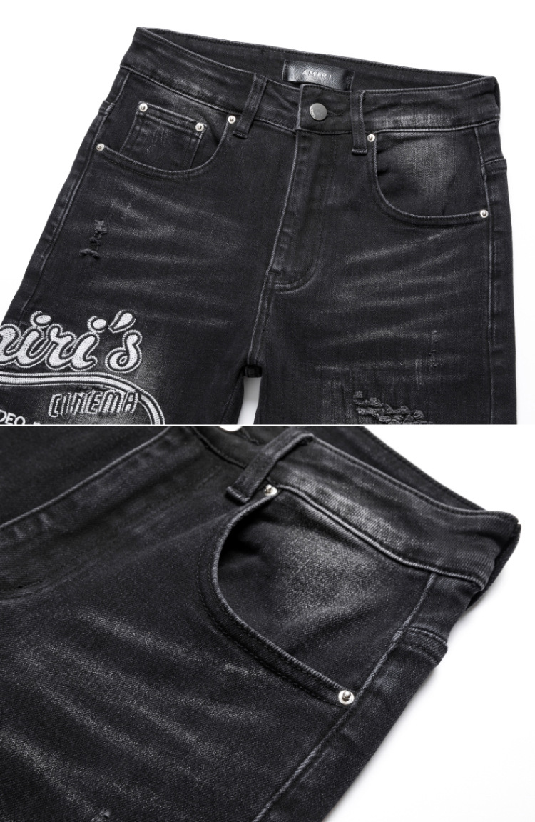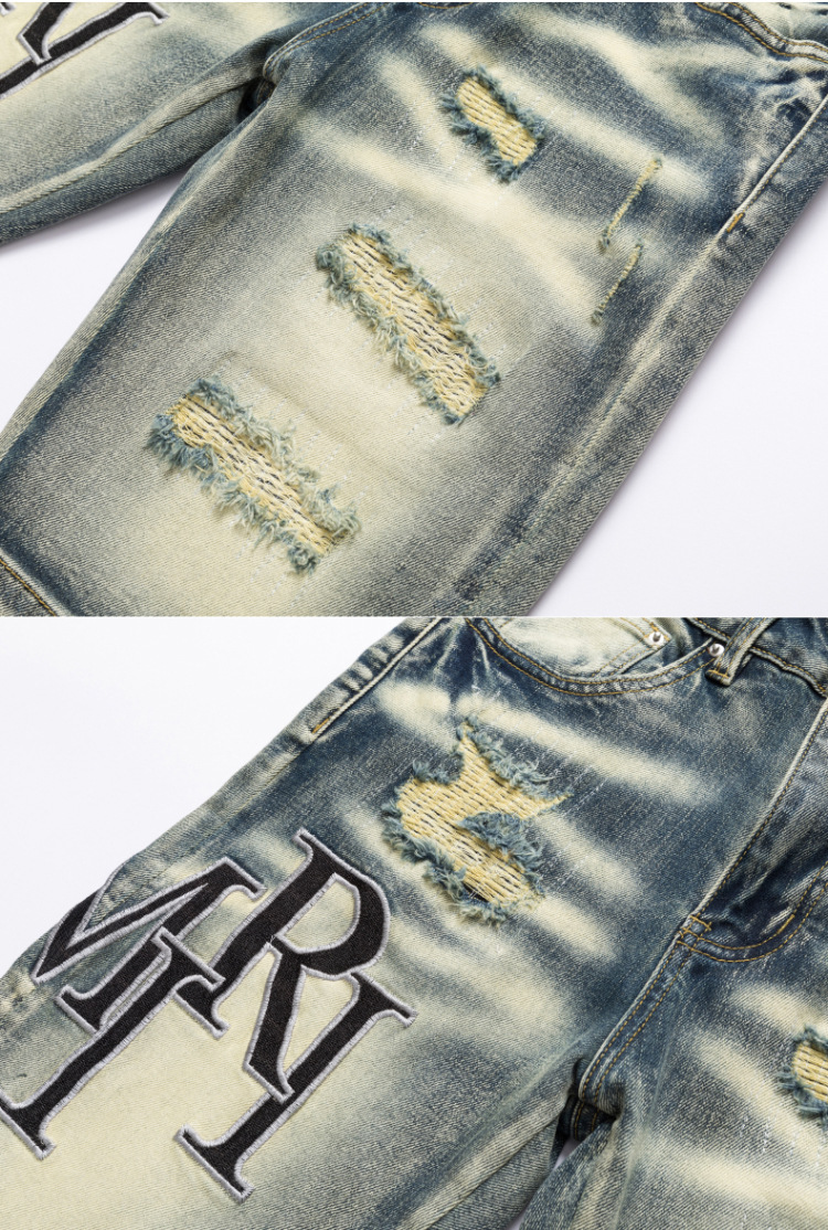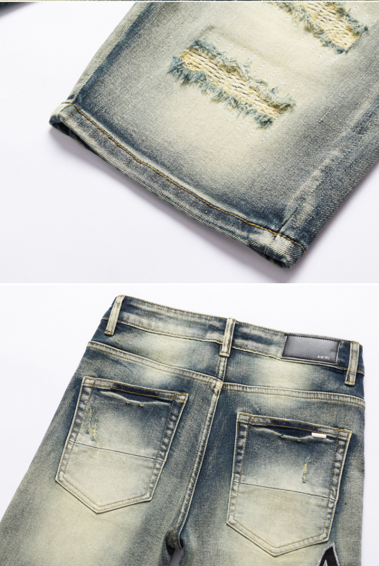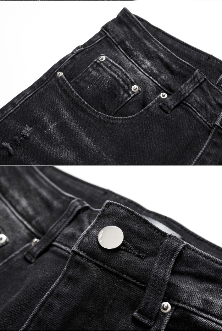 여름 트렌디 브랜드 스플래시 잉크 프린트 데님 반바지 남성용 찢어진 패치 스트레치 슬림핏 5부 바지 패셔너블하고 캐주얼한 트렌드스토어 가기