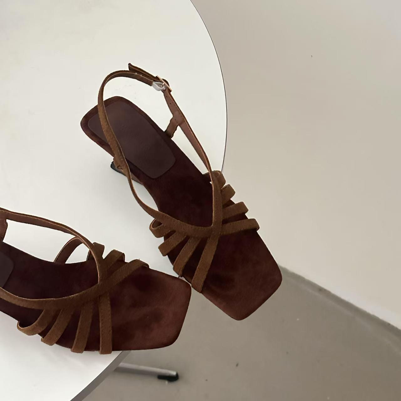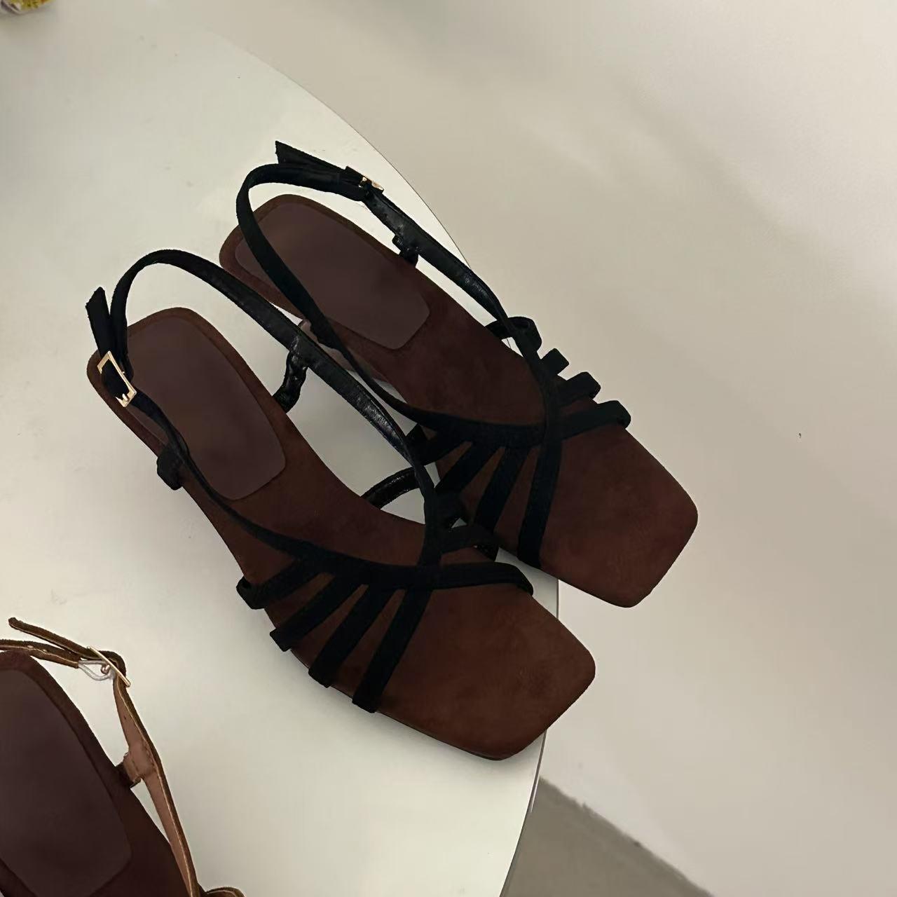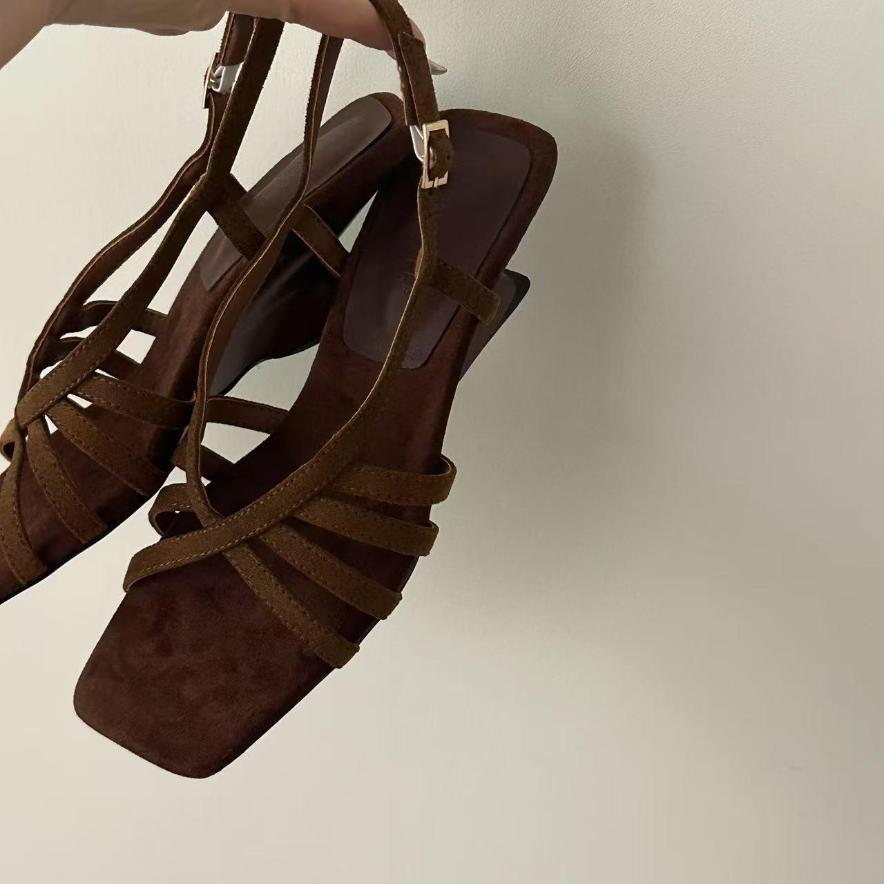2025년 여름 여성용 스퀘어 토 웨지 샌들, 새로운 하이힐, 피쉬 마우스, 속이 빈 원라인 버클, 특별한 모양의 힐, 트렌디하고 다재다능함스토어 가기