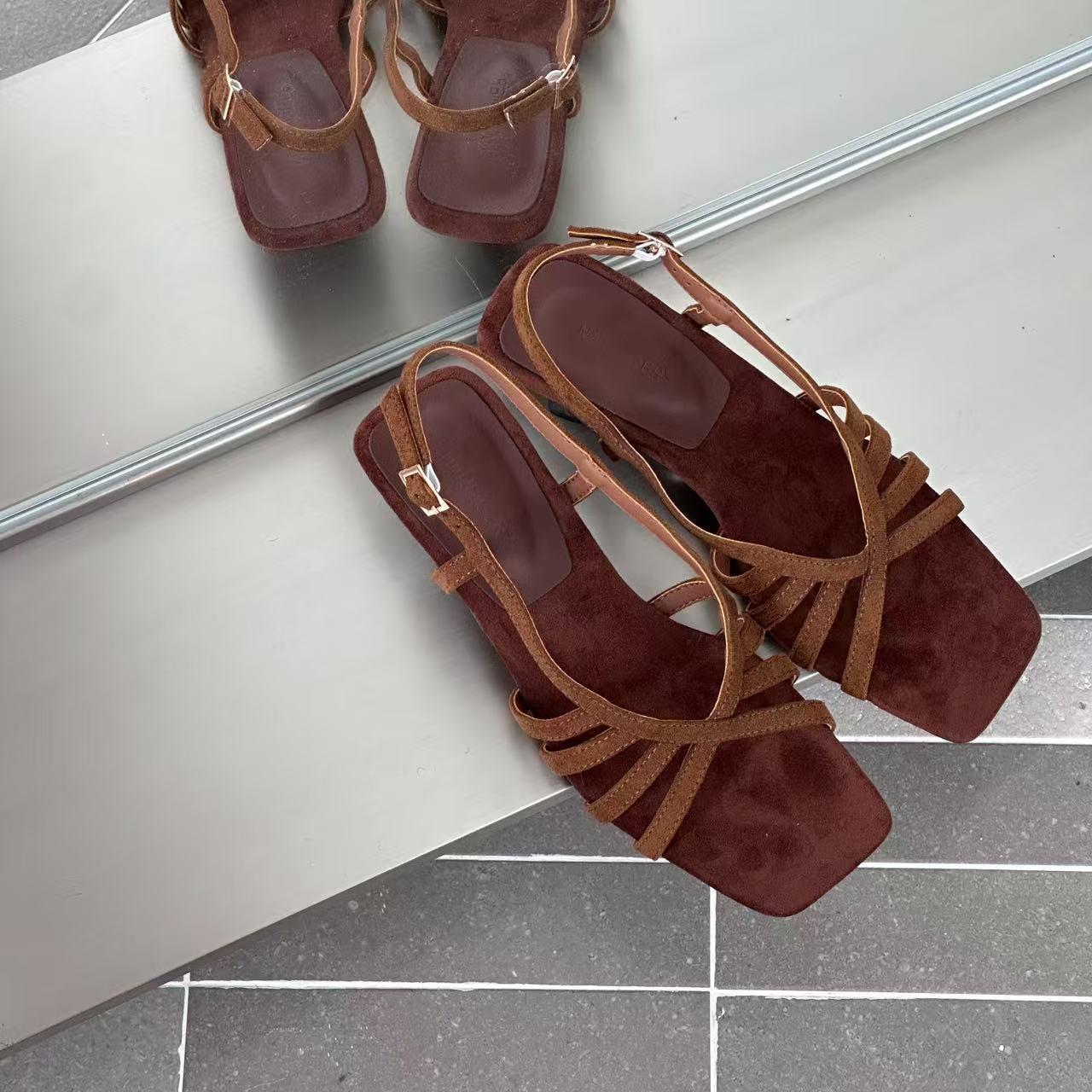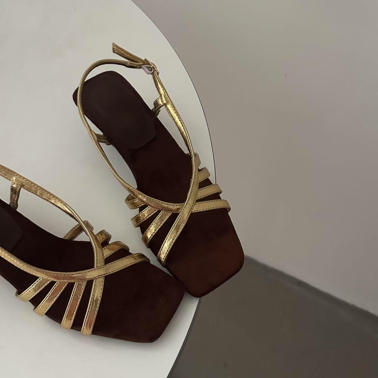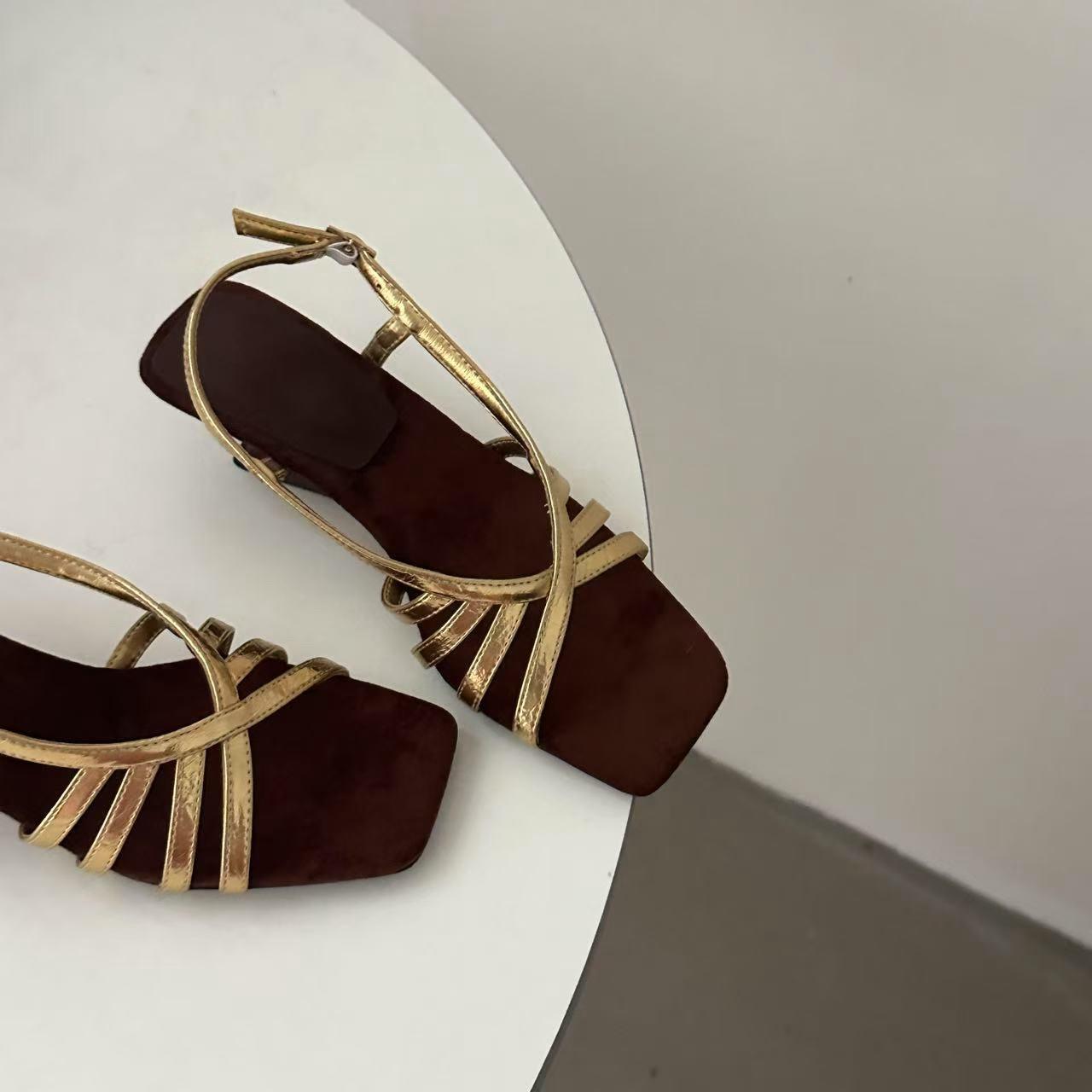 2025년 여름 여성용 스퀘어 토 웨지 샌들, 새로운 하이힐, 피쉬 마우스, 속이 빈 원라인 버클, 특별한 모양의 힐, 트렌디하고 다재다능함
