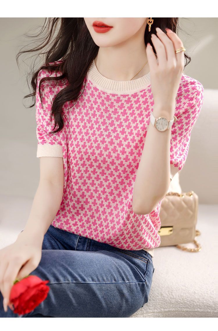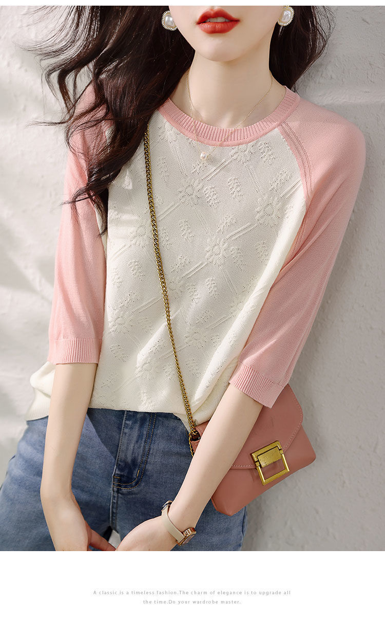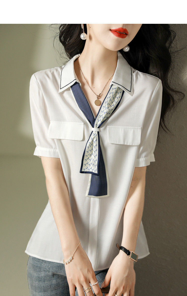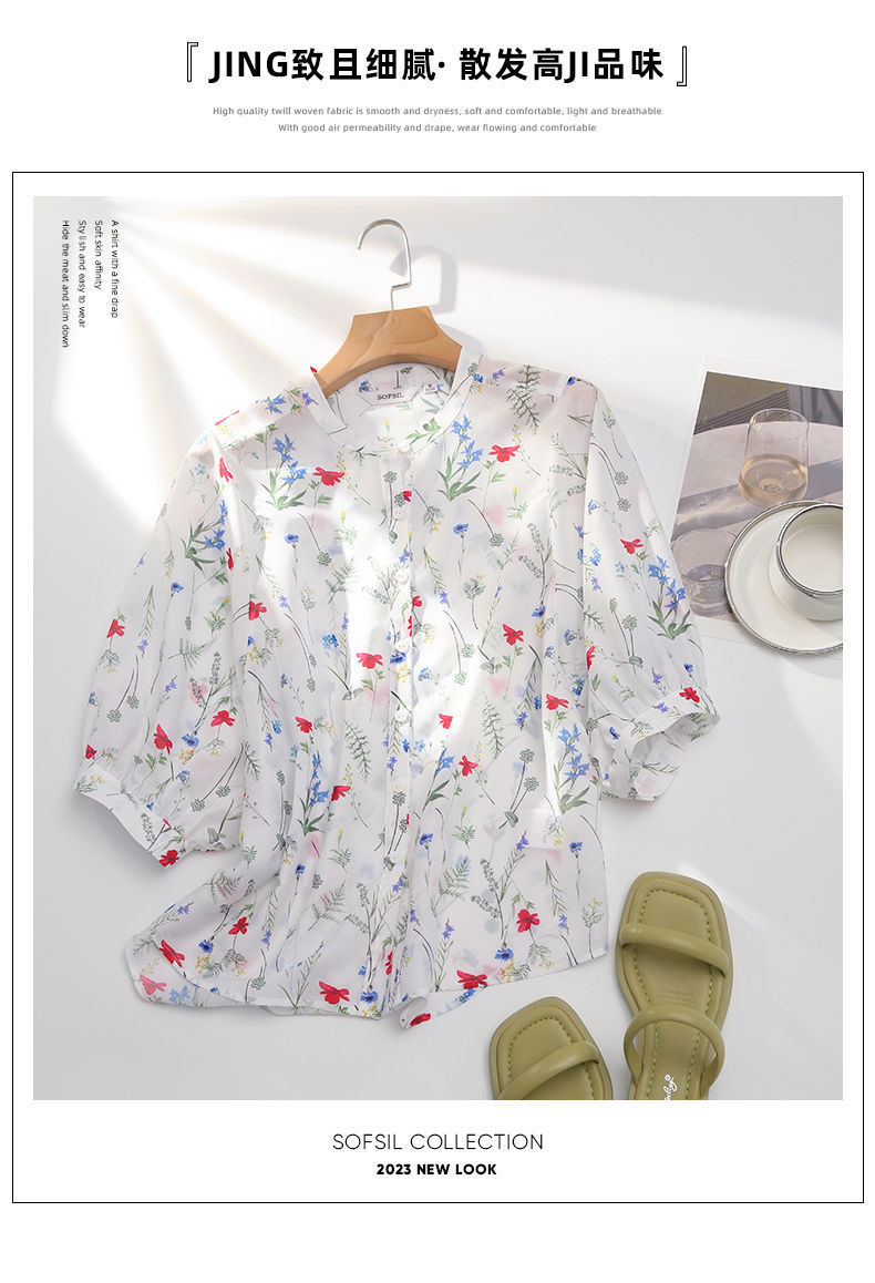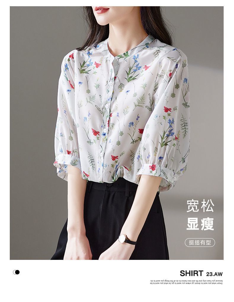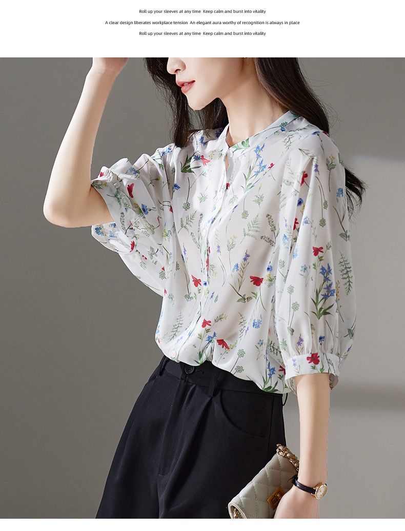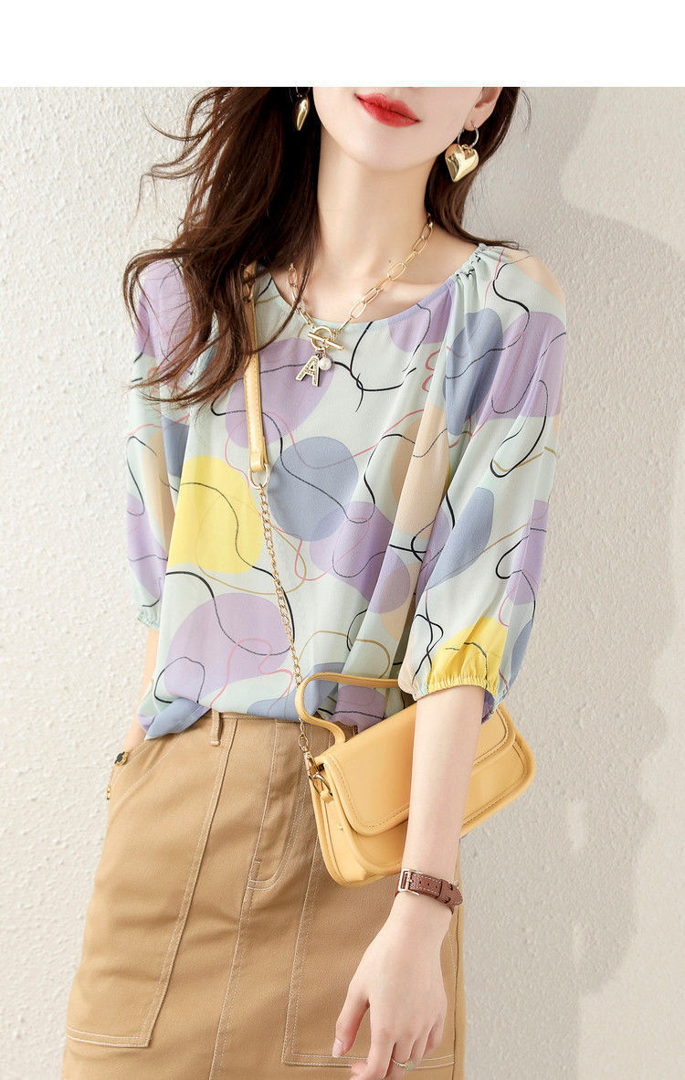 여름 여성용 쉬폰 셔츠, 7부 소매 디자인, 틈새 루즈, 상큼한 프린트, 배를 커버하고 슬리밍 여성용 탑