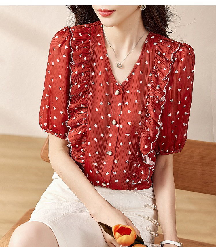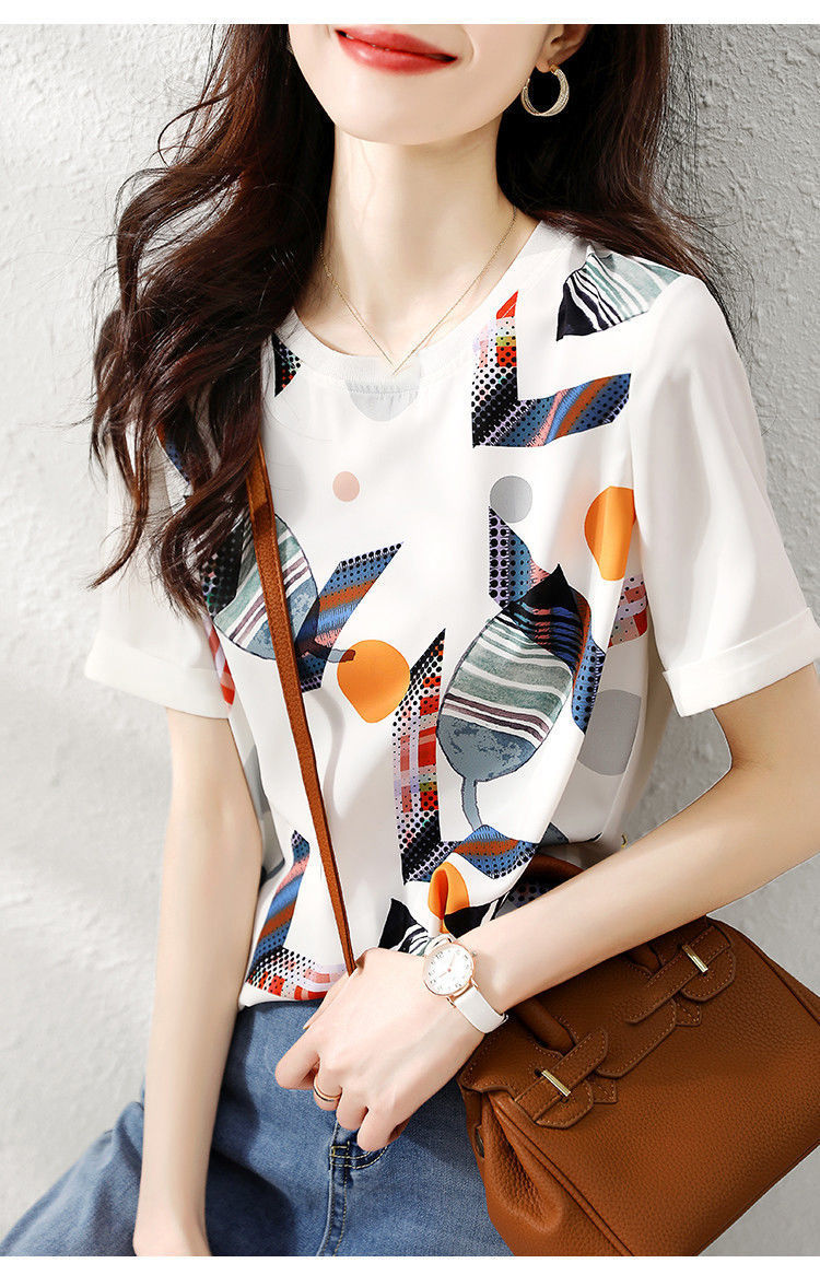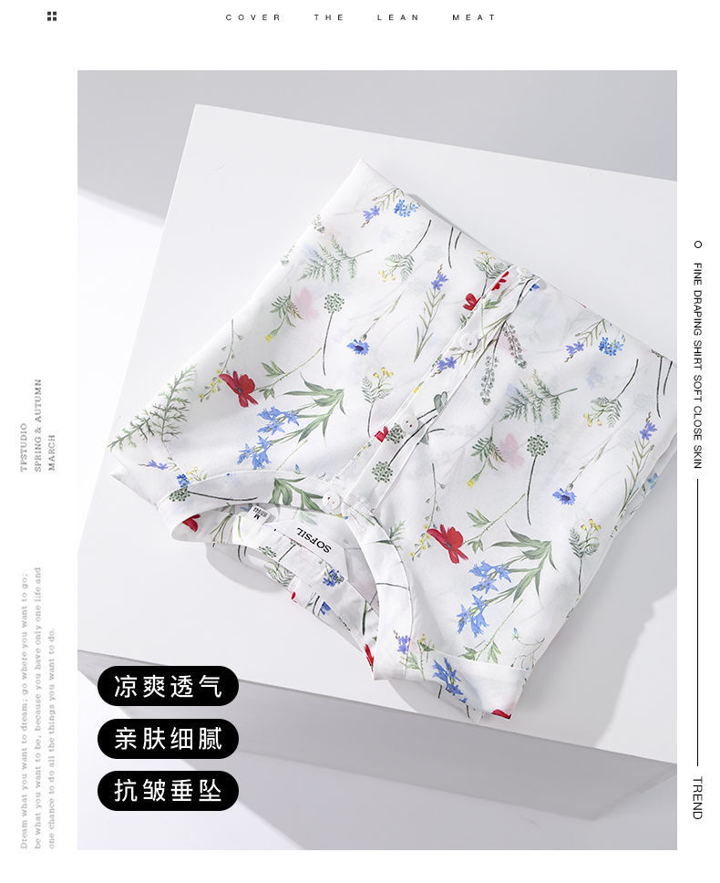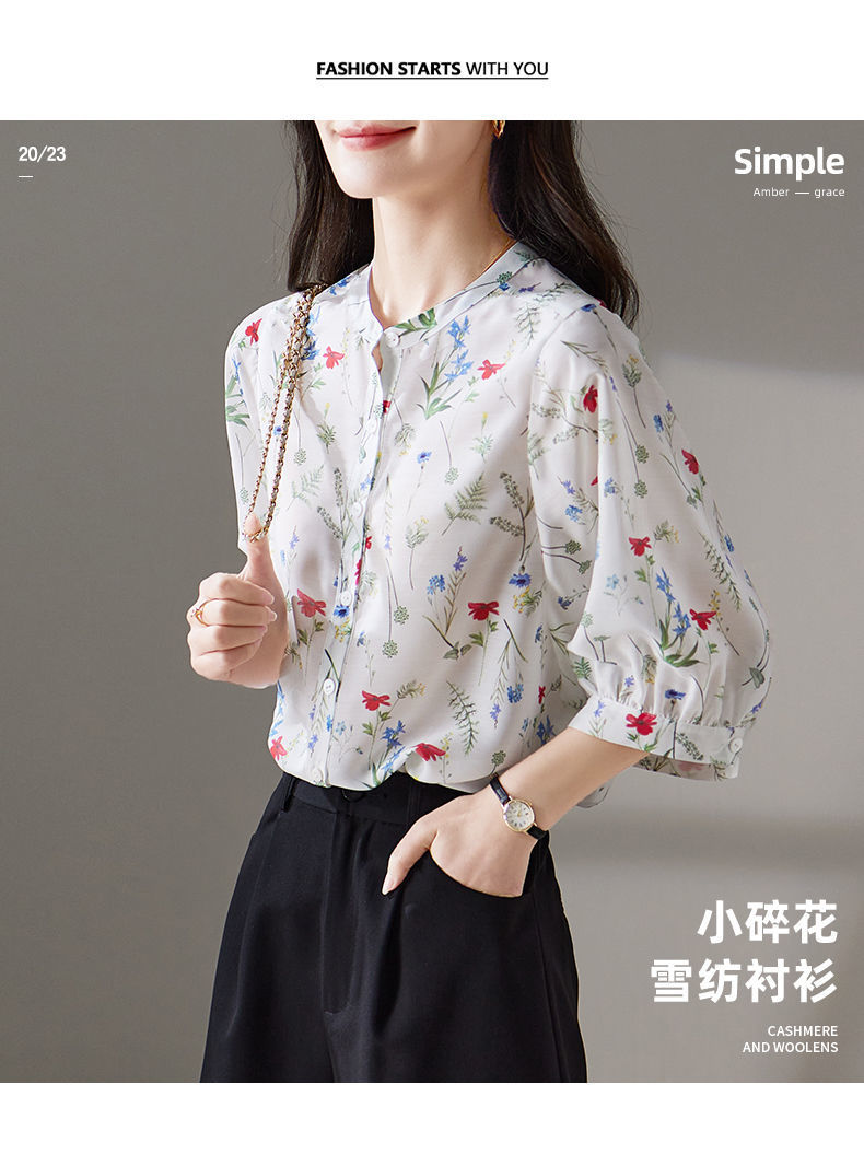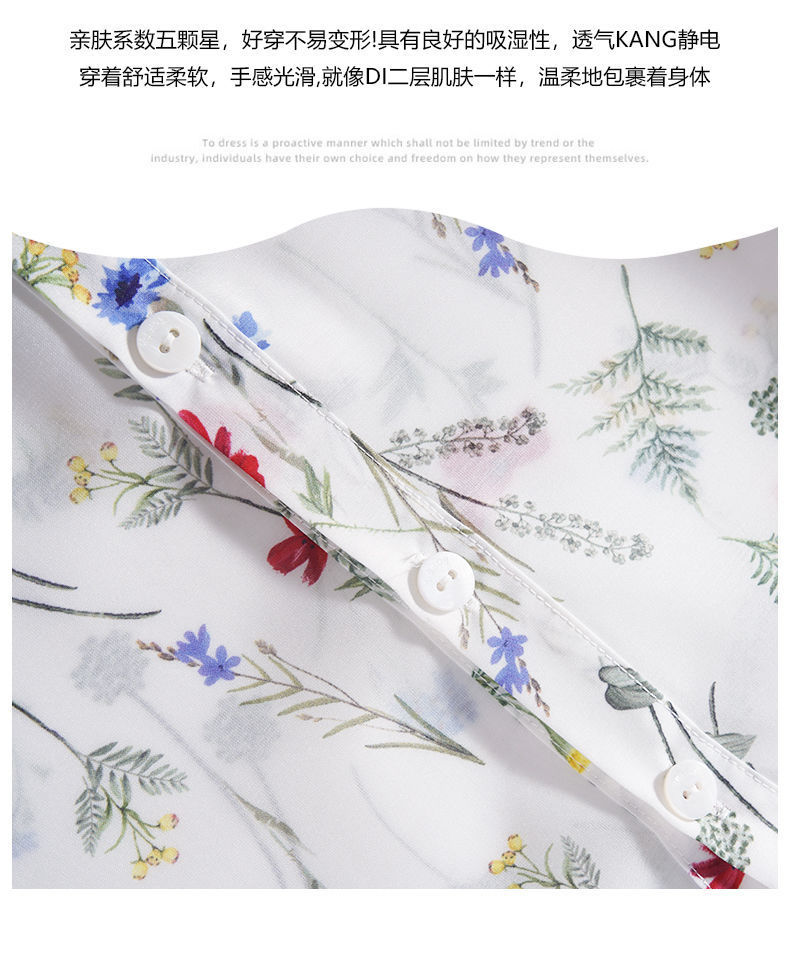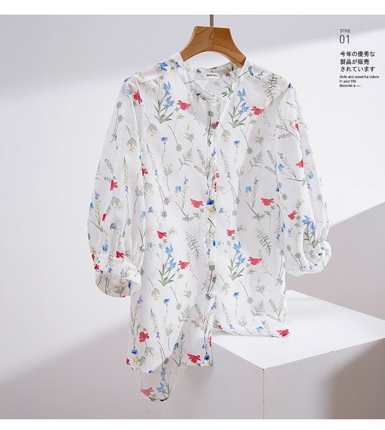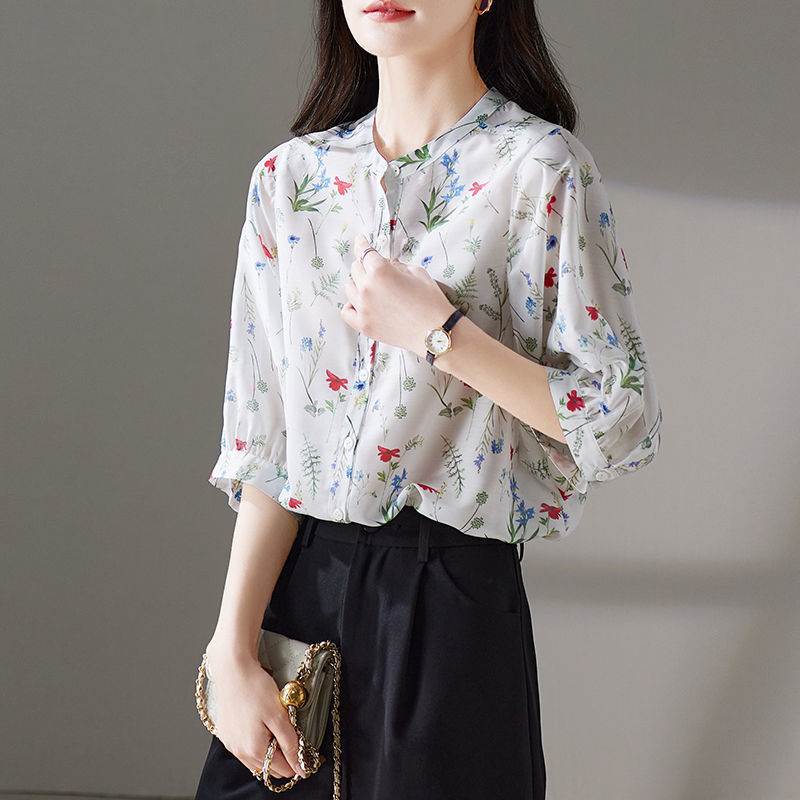 여름 여성용 쉬폰 셔츠, 7부 소매 디자인, 틈새 루즈, 상큼한 프린트, 배를 커버하고 슬리밍 여성용 탑스토어 가기
