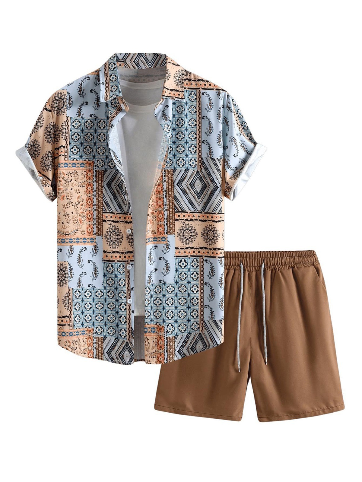 여름 국경 간 새로운 남성 캐주얼 비치 스타일 디지털 인쇄 반팔 투피스 남성 반팔 셔츠 세트