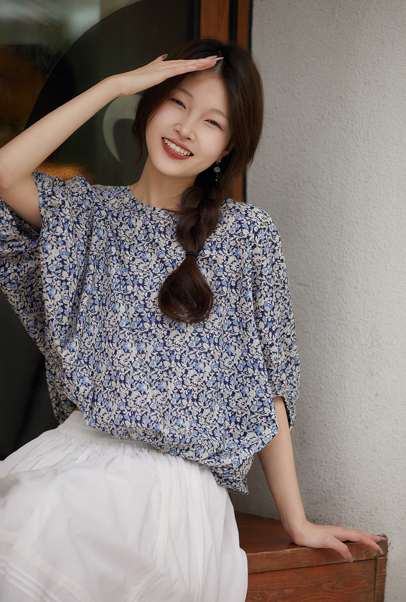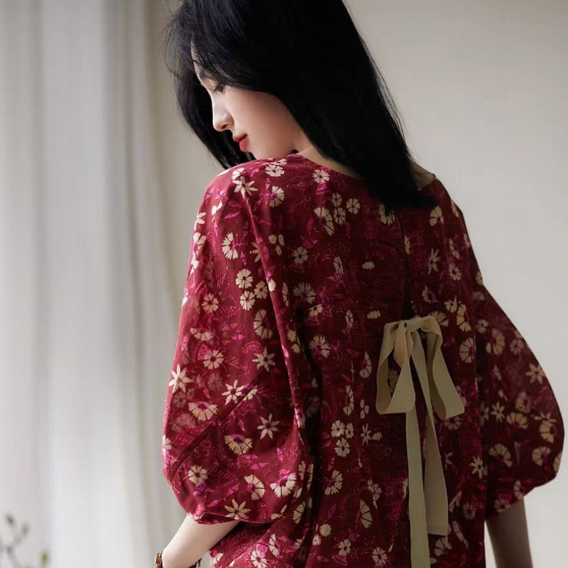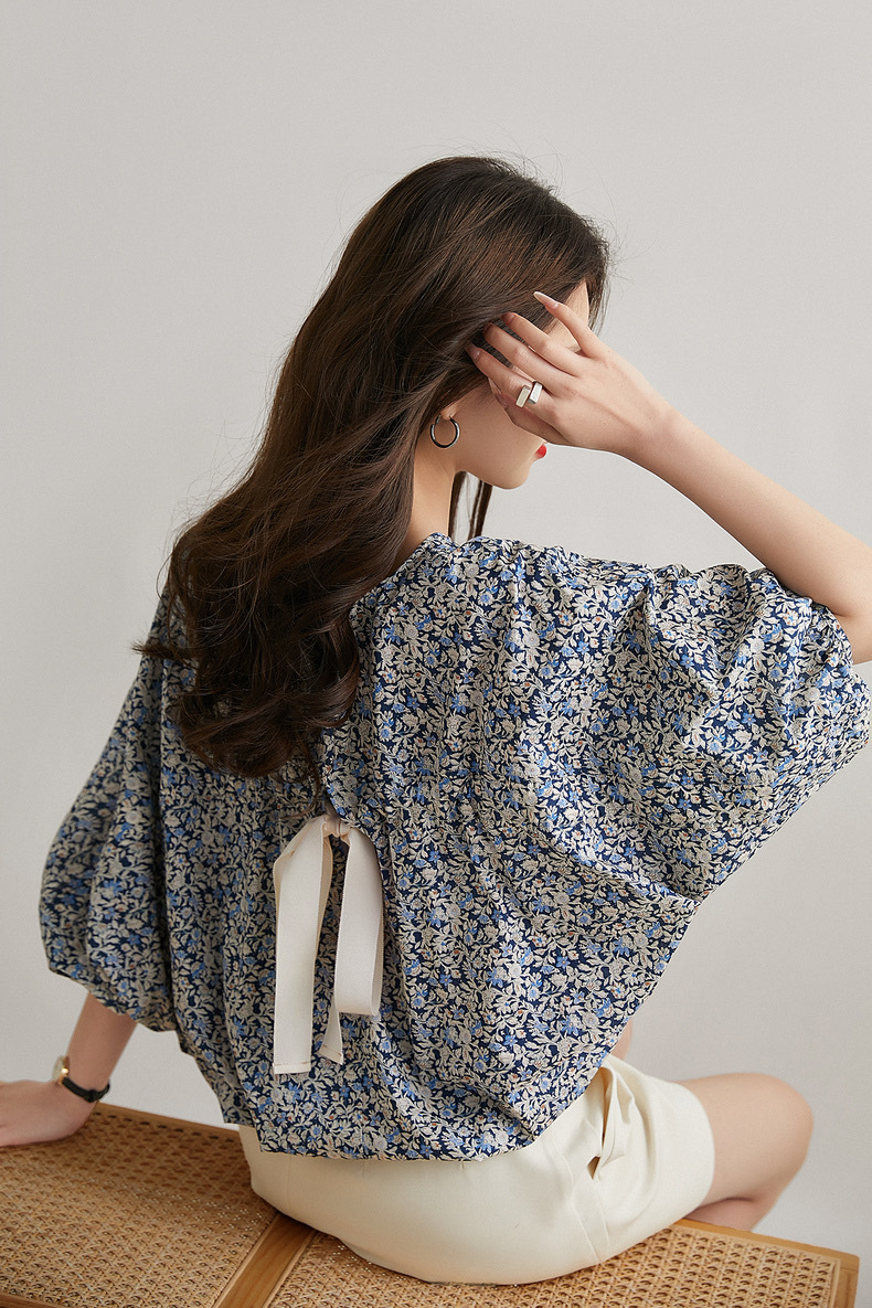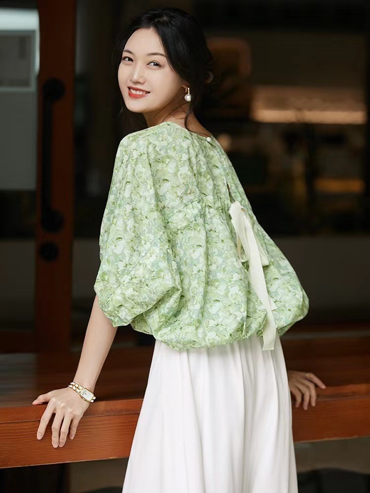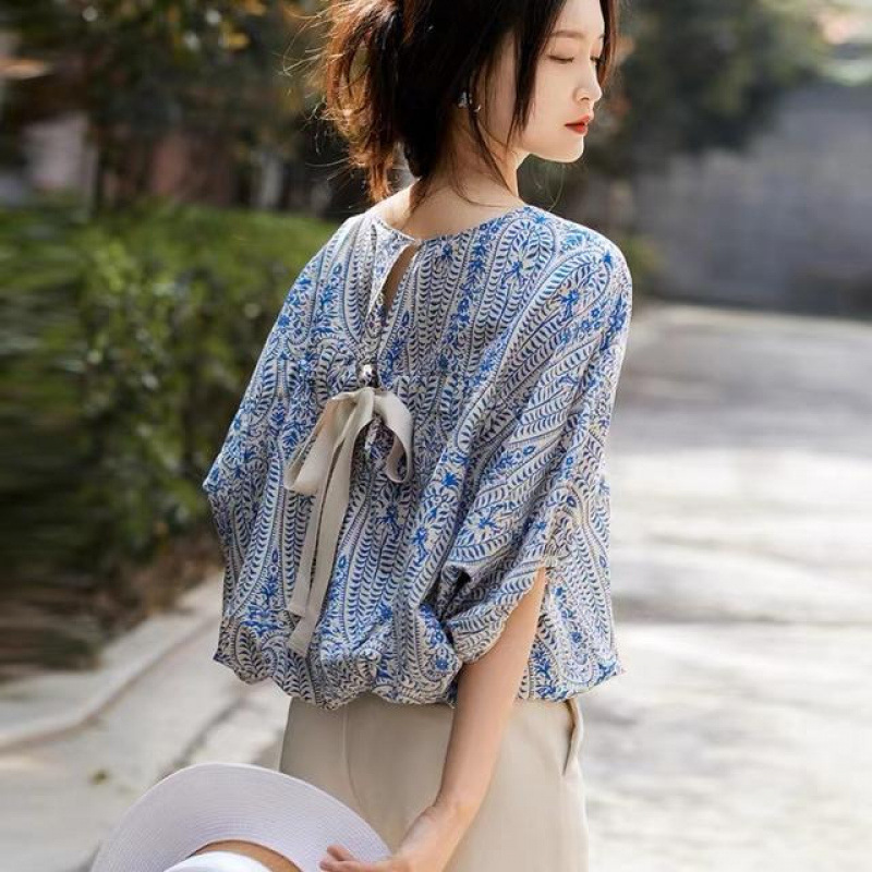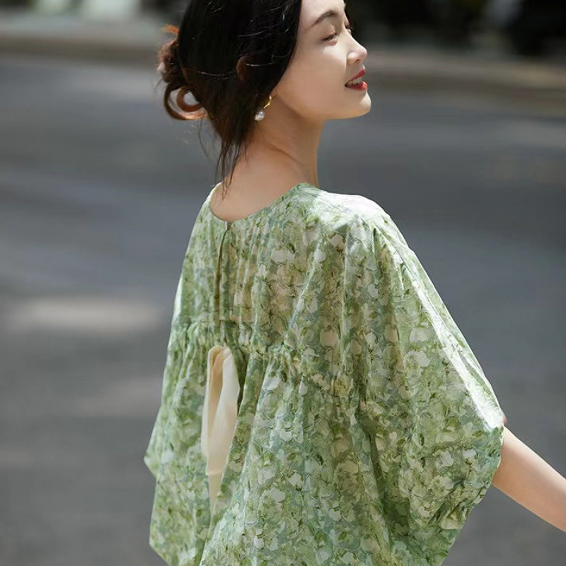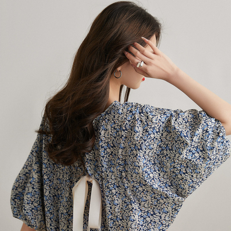 2025 새로운 여름 여성 꽃 무늬 쉬폰 탑 세련된 배트 슬리브 + 여성용 리본 셔츠스토어 가기