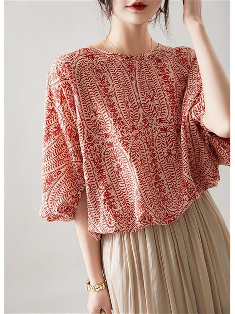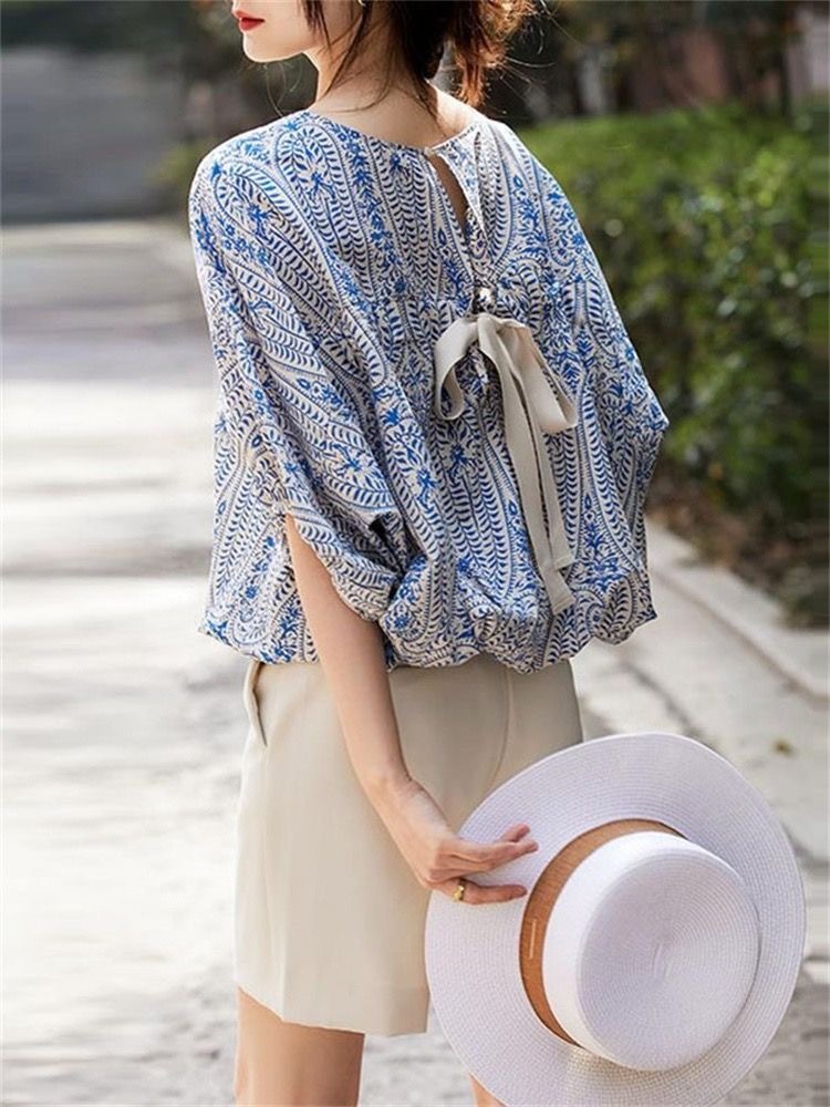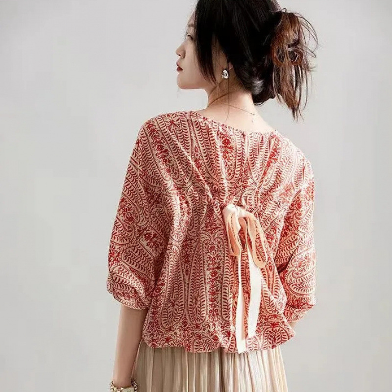 2025 새로운 여름 여성 꽃 무늬 쉬폰 탑 세련된 배트 슬리브 + 여성용 리본 셔츠