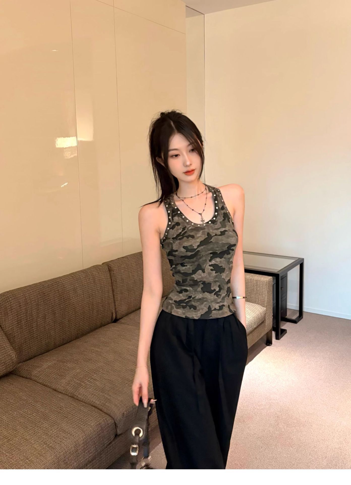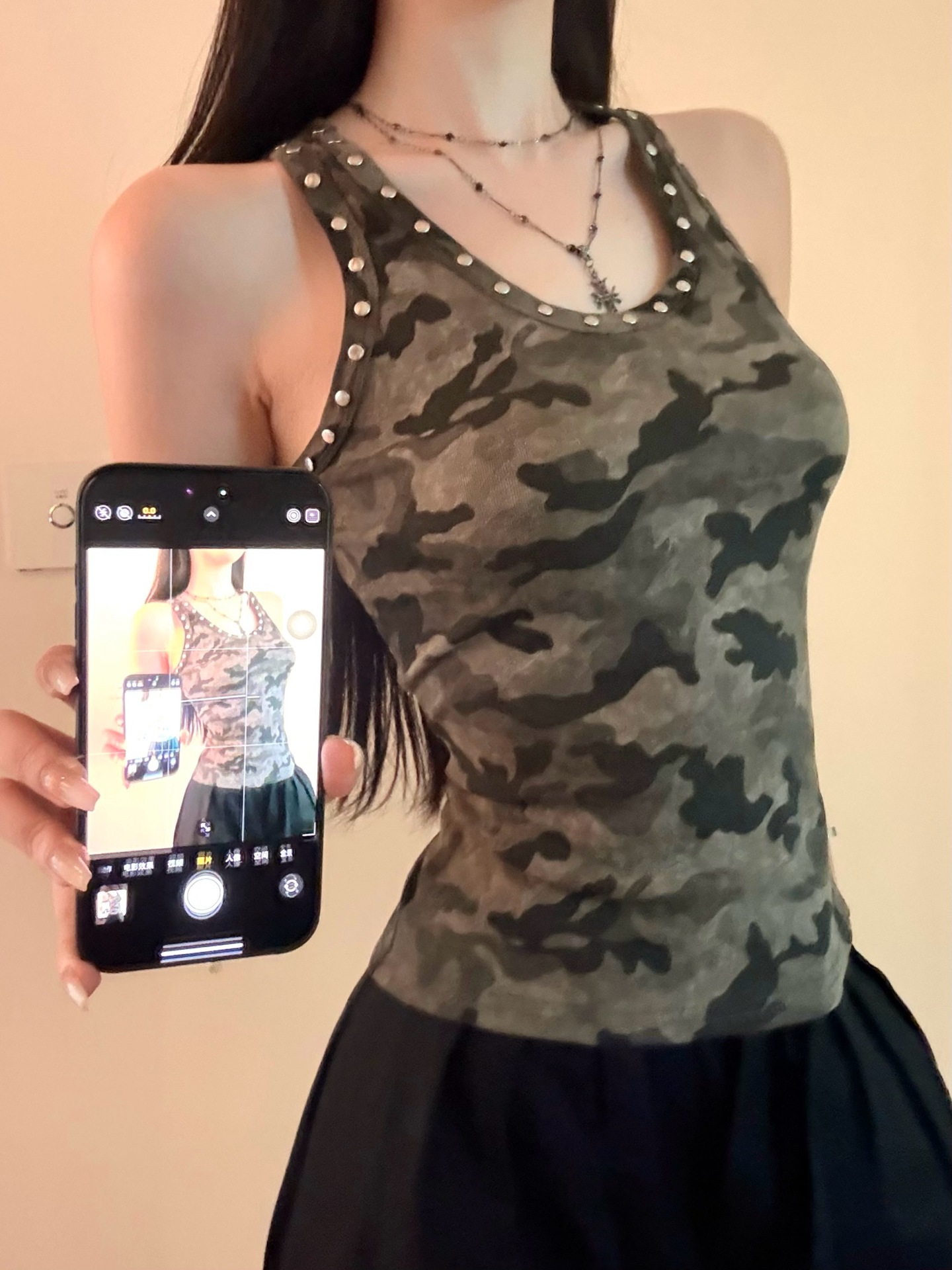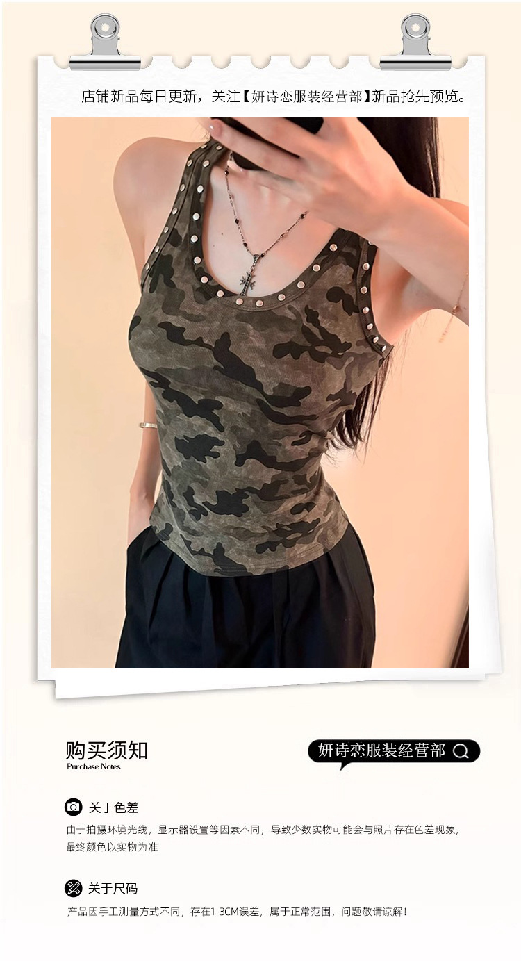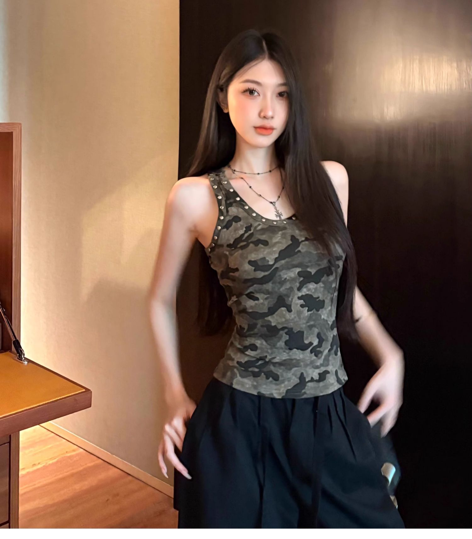 아메리칸 스위트 쿨 핫 걸 헤비 듀티 리벳 카모플라주 캐미솔 여성 여름 아우터 민소매 U 넥 워크웨어 탑