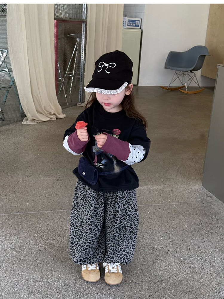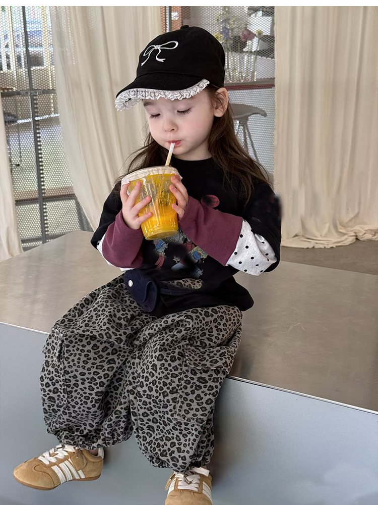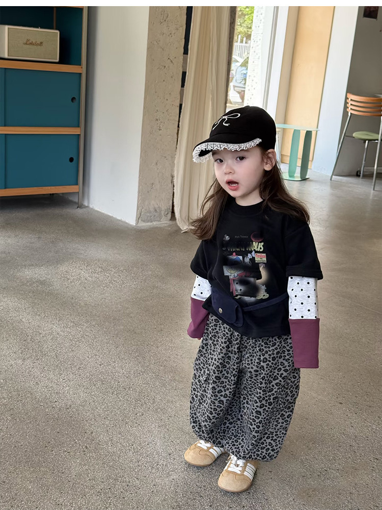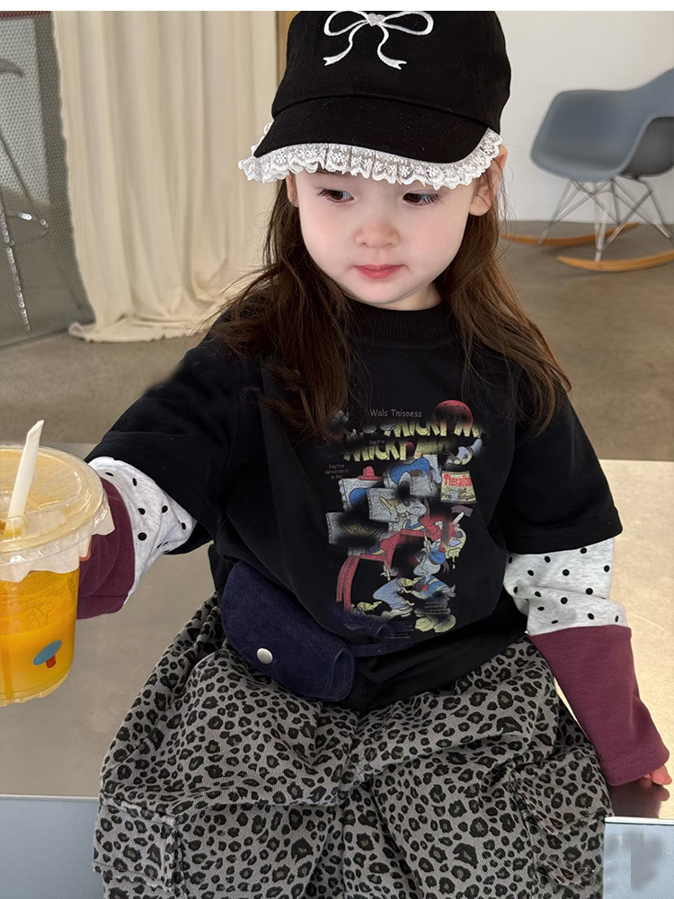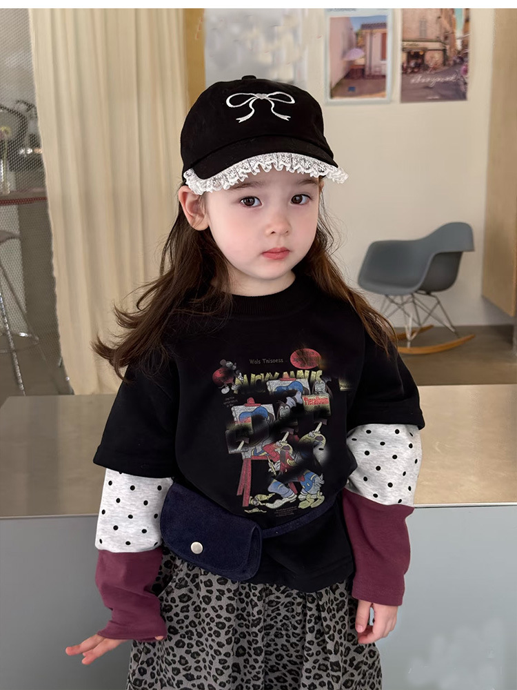 여아 투피스 티셔츠 한국판 26 봄 신상 아동 만화 패션 캐주얼 물방울 무늬 배색 루즈핏 상의