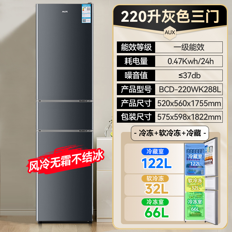 • 그레이·220L·3도어 냉장고 | 공기 냉각 및 성에 방지 | 1년 무료 교체
