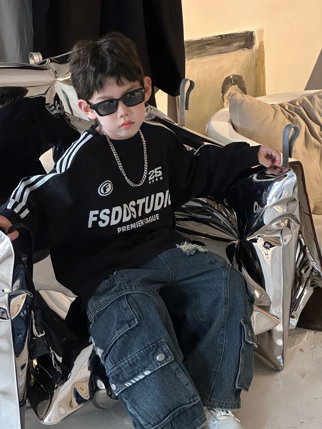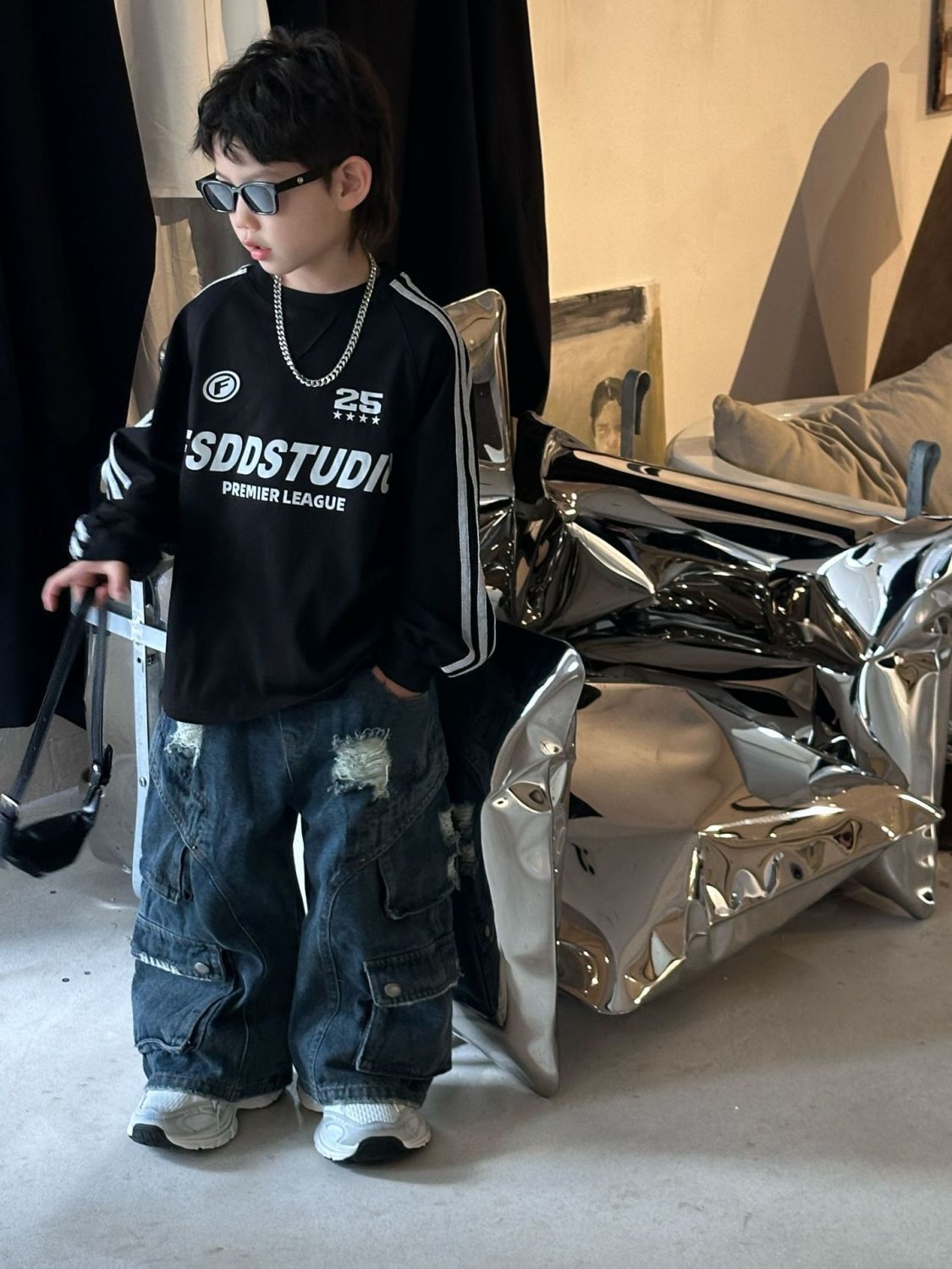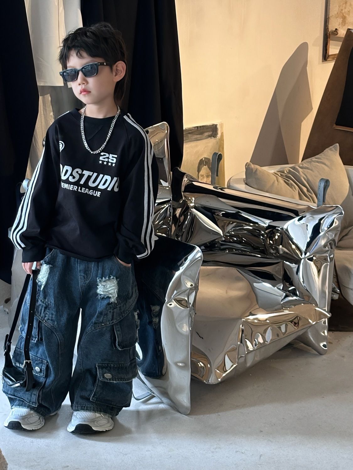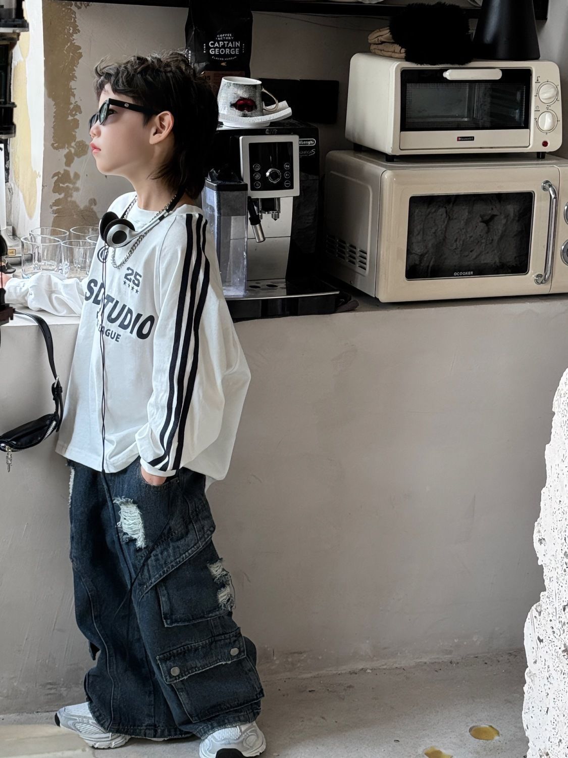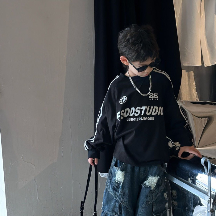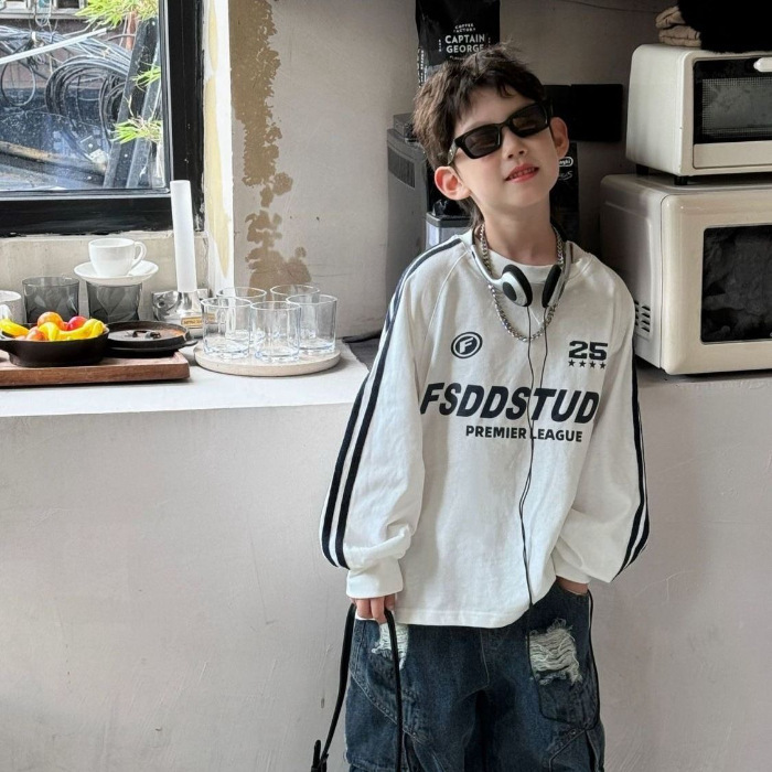 면 긴팔 티셔츠 소년 봄, 가을 새로운 겉옷 복고풍 3 바 스포츠 스타일 느슨한 핫 스타일 라운드 넥 탑