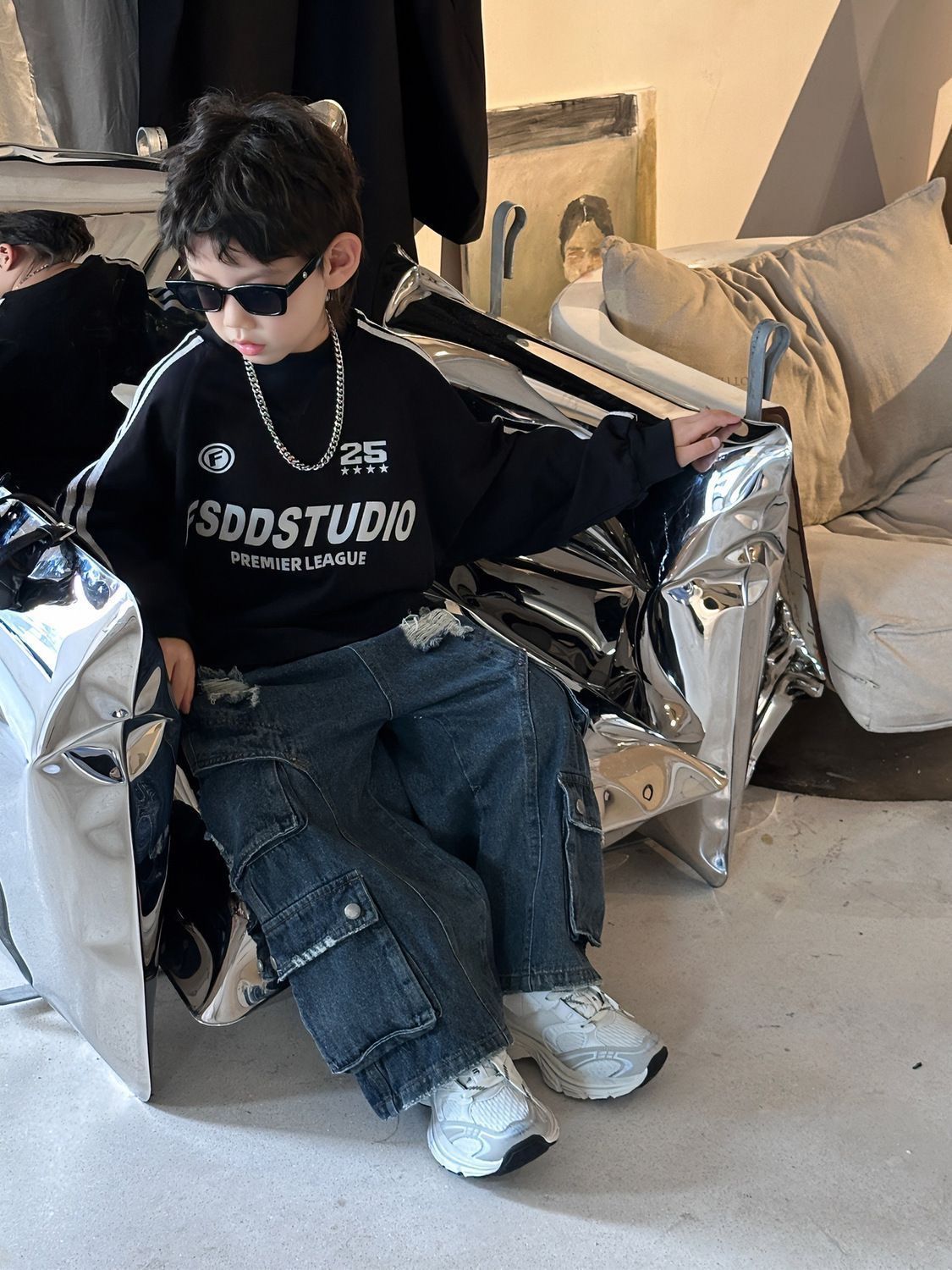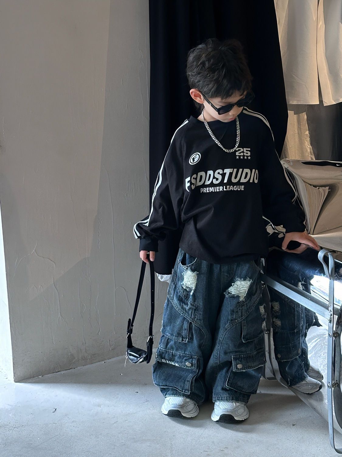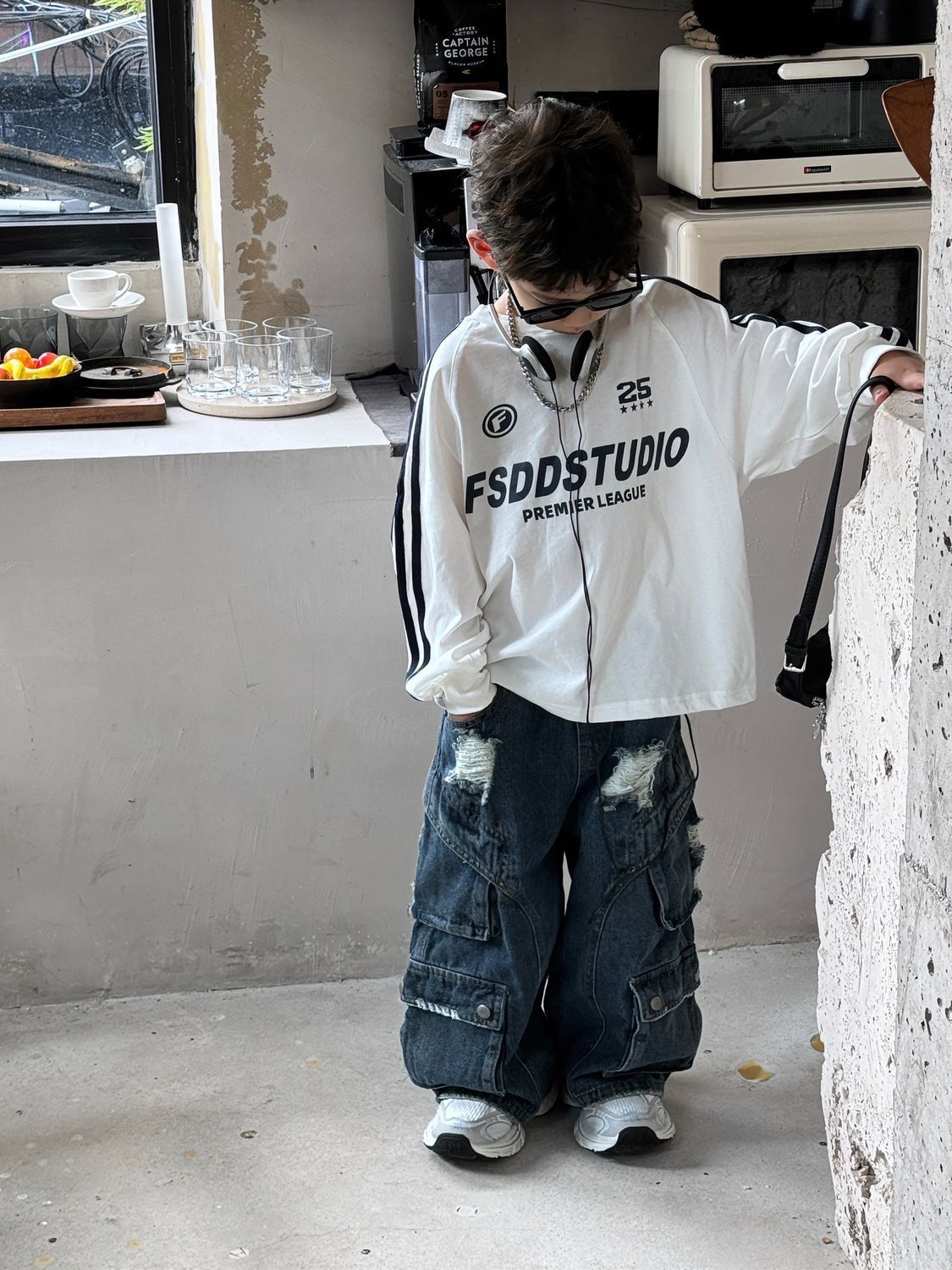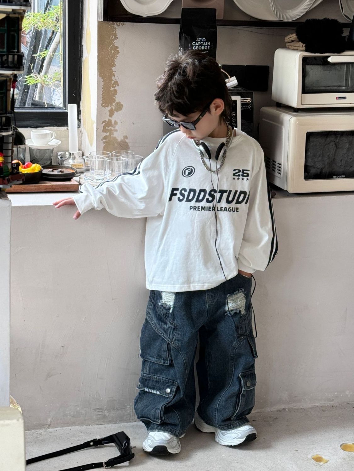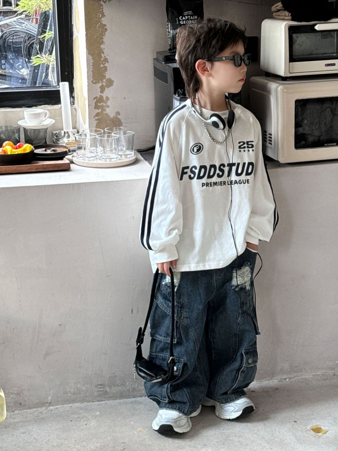 면 긴팔 티셔츠 소년 봄, 가을 새로운 겉옷 복고풍 3 바 스포츠 스타일 느슨한 핫 스타일 라운드 넥 탑스토어 가기