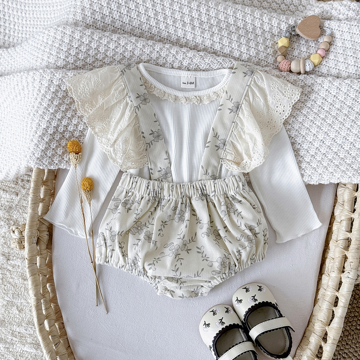 INS 유아 티셔츠 아기 소녀 꽃 무늬 코듀로이 서스펜더 점프 슈트 중공 레이스 슬리브 삼각형 크롤링스토어 가기