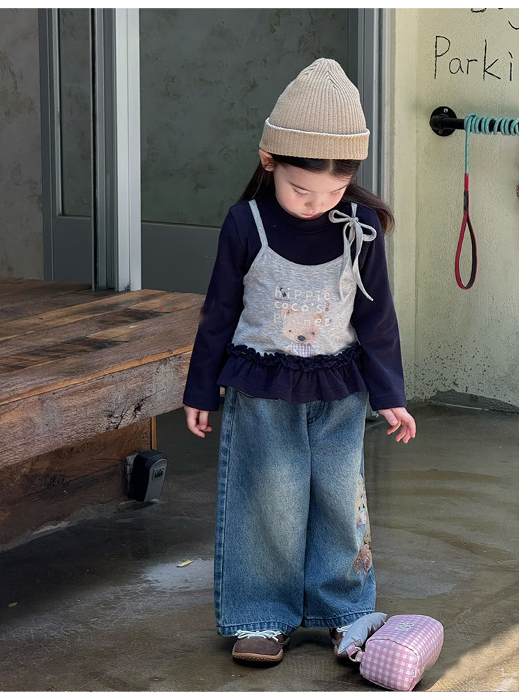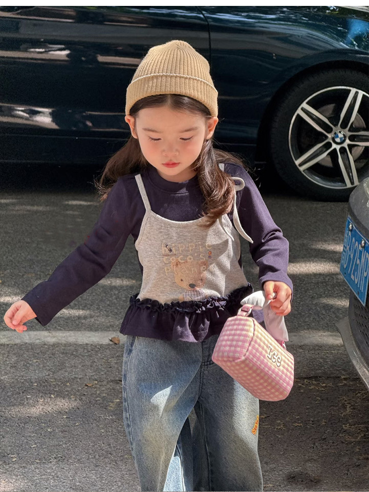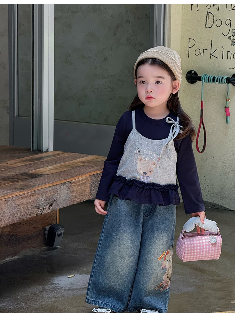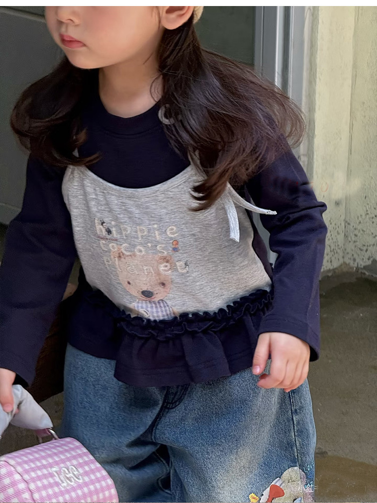 2025 새로운 달콤한 아동 의류 어린 소녀 곰 인쇄 스플 라이스 t 탑 소녀 가짜 투피스 긴팔 티셔츠 가을 옷