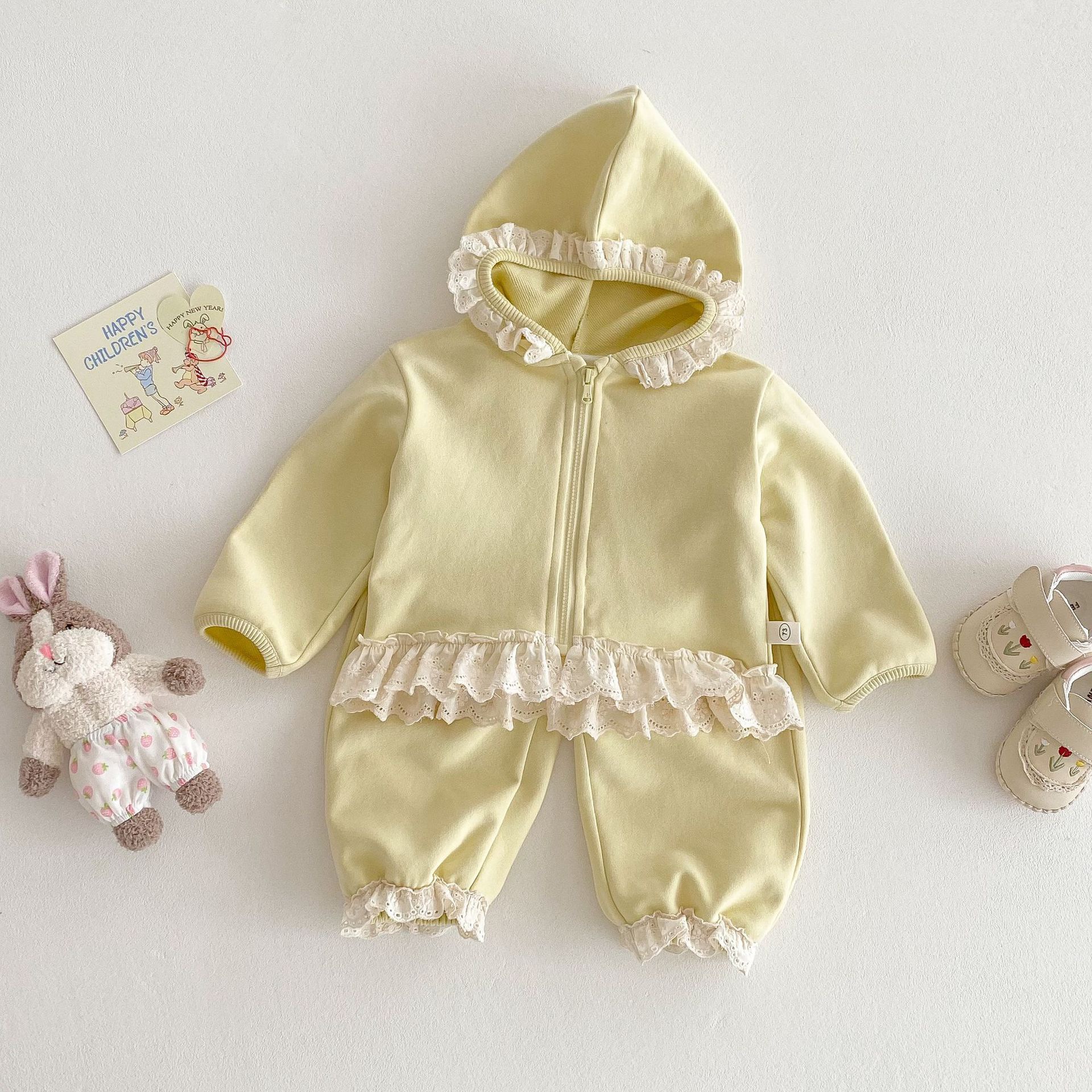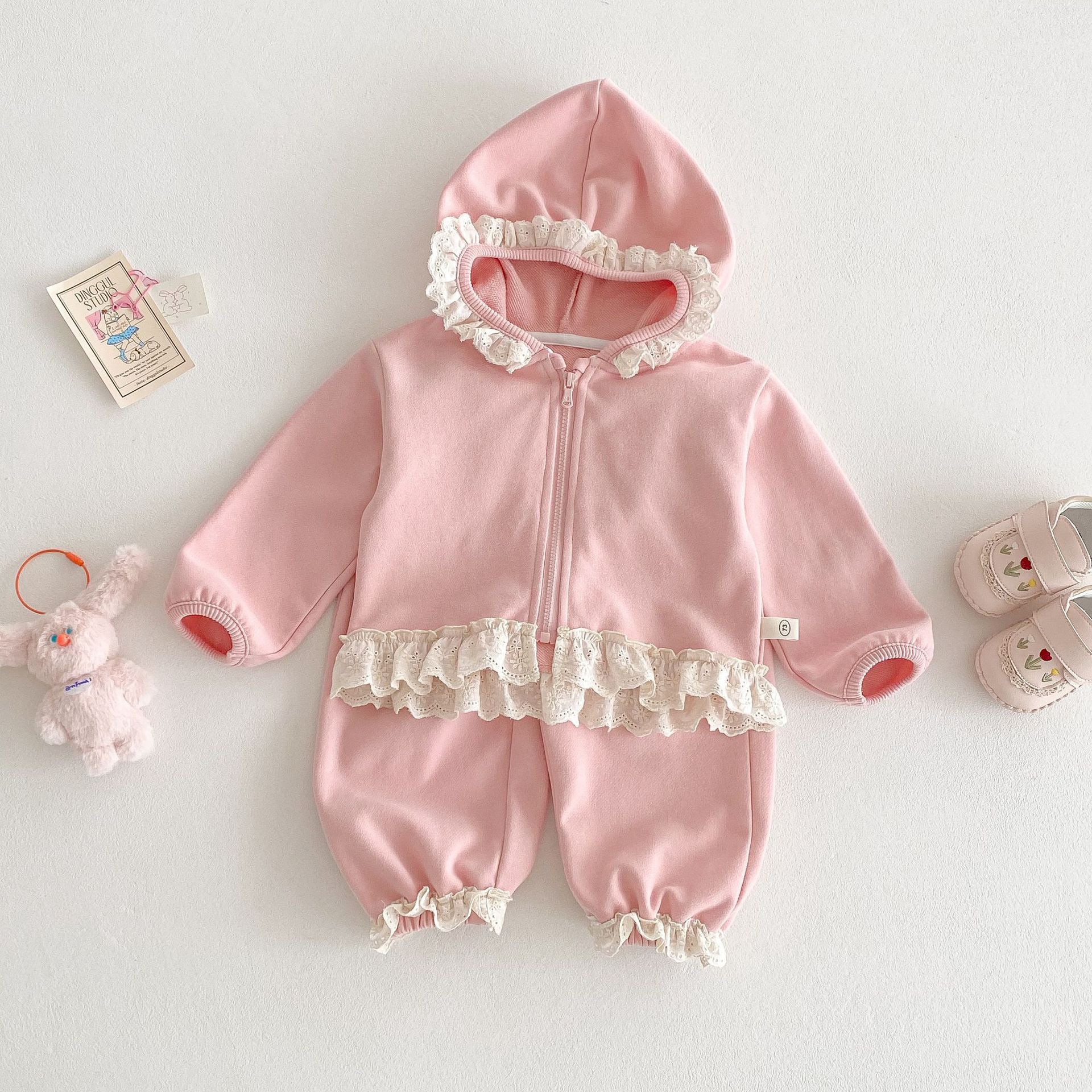 여아 한국식 코트 신작 봄 0-5세 아기 한국식 후드 탑 아동용 레이스 캐주얼 바지 2개