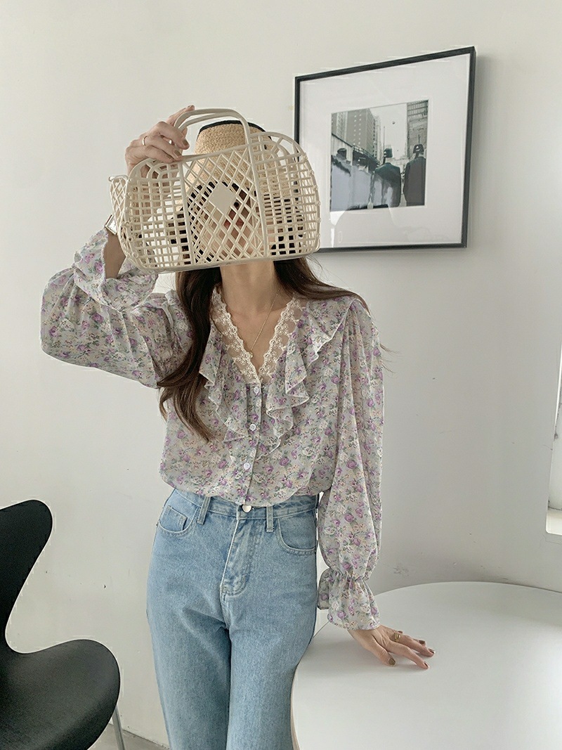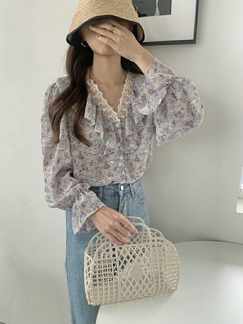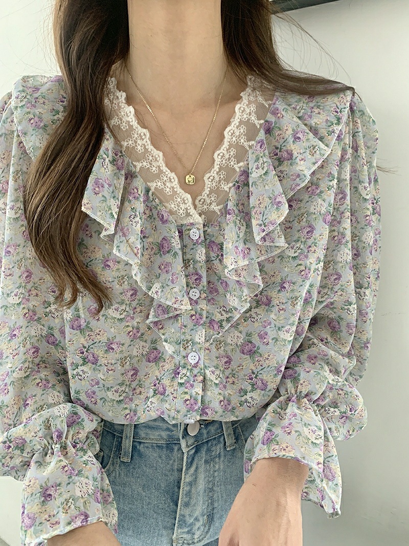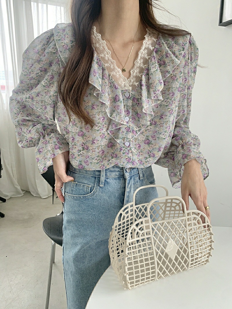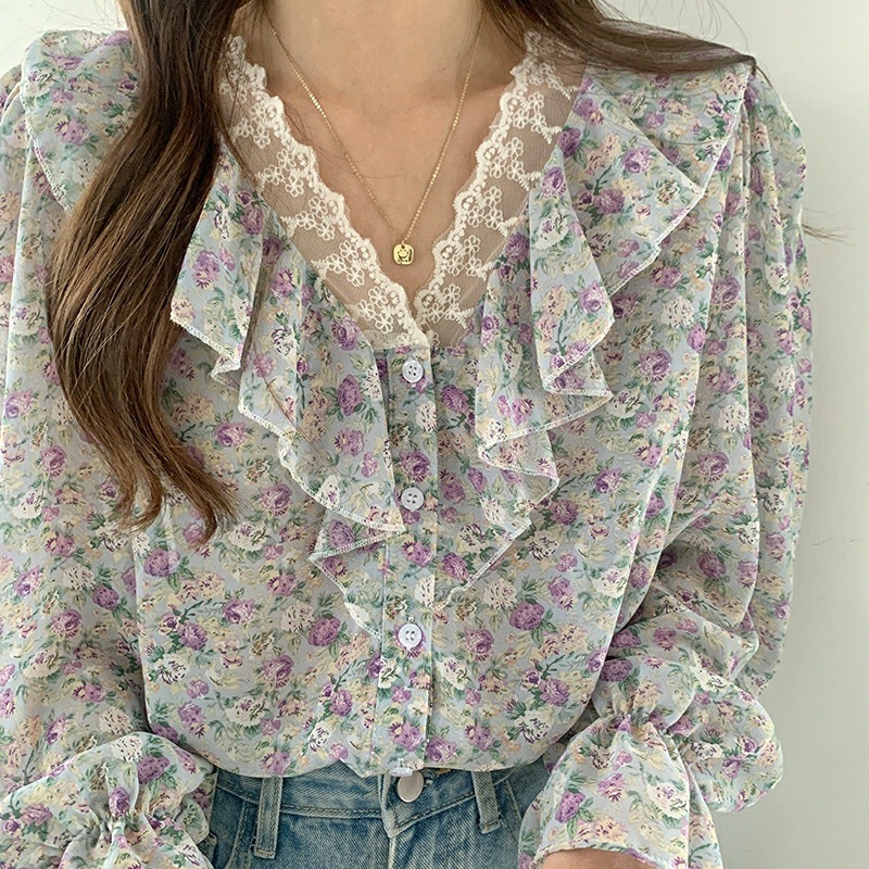 2025 봄/여름 신상품 카라 러플 레이스 스플라이스 쉬폰 셔츠 상의, 달콤한 꽃무늬 셔츠, 루즈핏스토어 가기