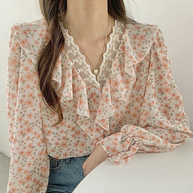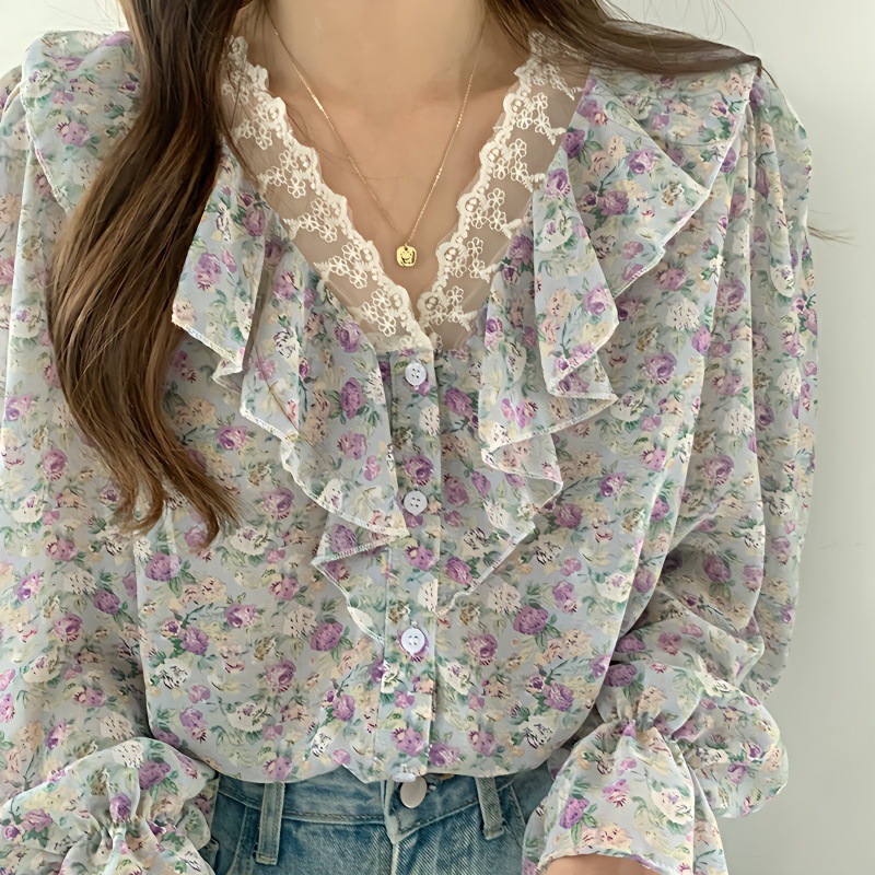 2025 봄 여름 신상품 레이스 플라워 레이스 스티치 쉬폰 셔츠 상의 달콤한 꽃무늬 셔츠 패셔너블한 스타일스토어 가기