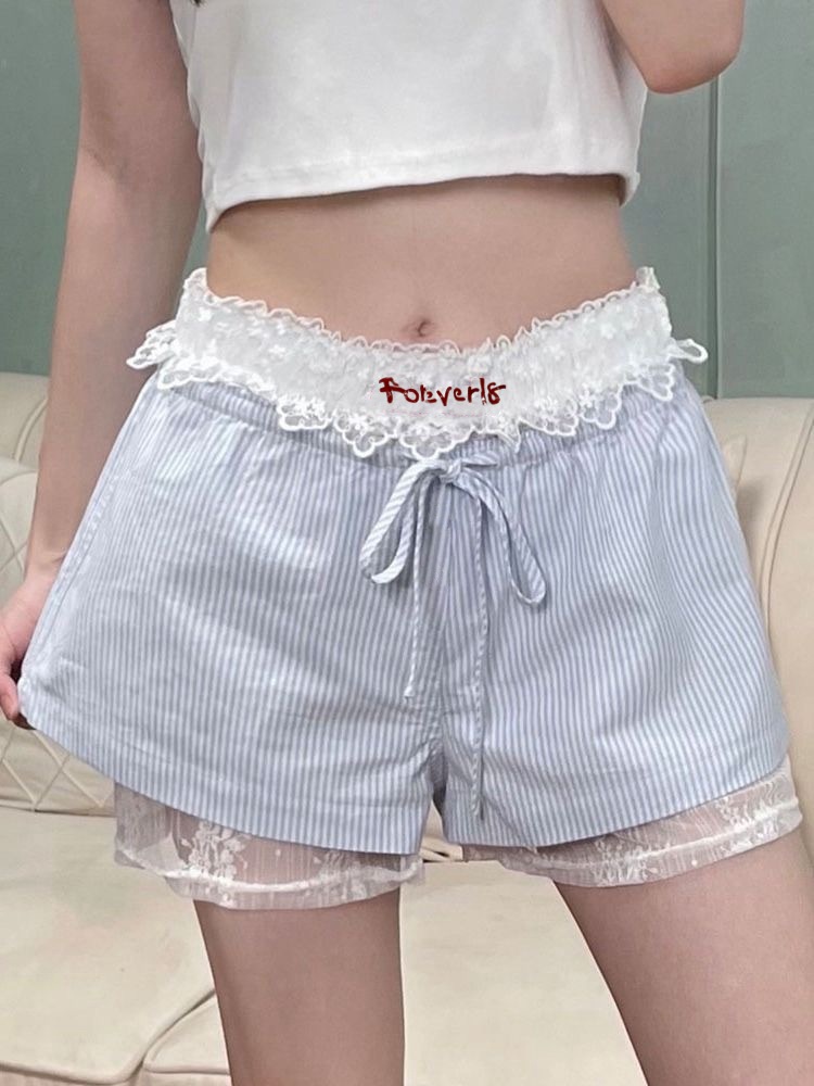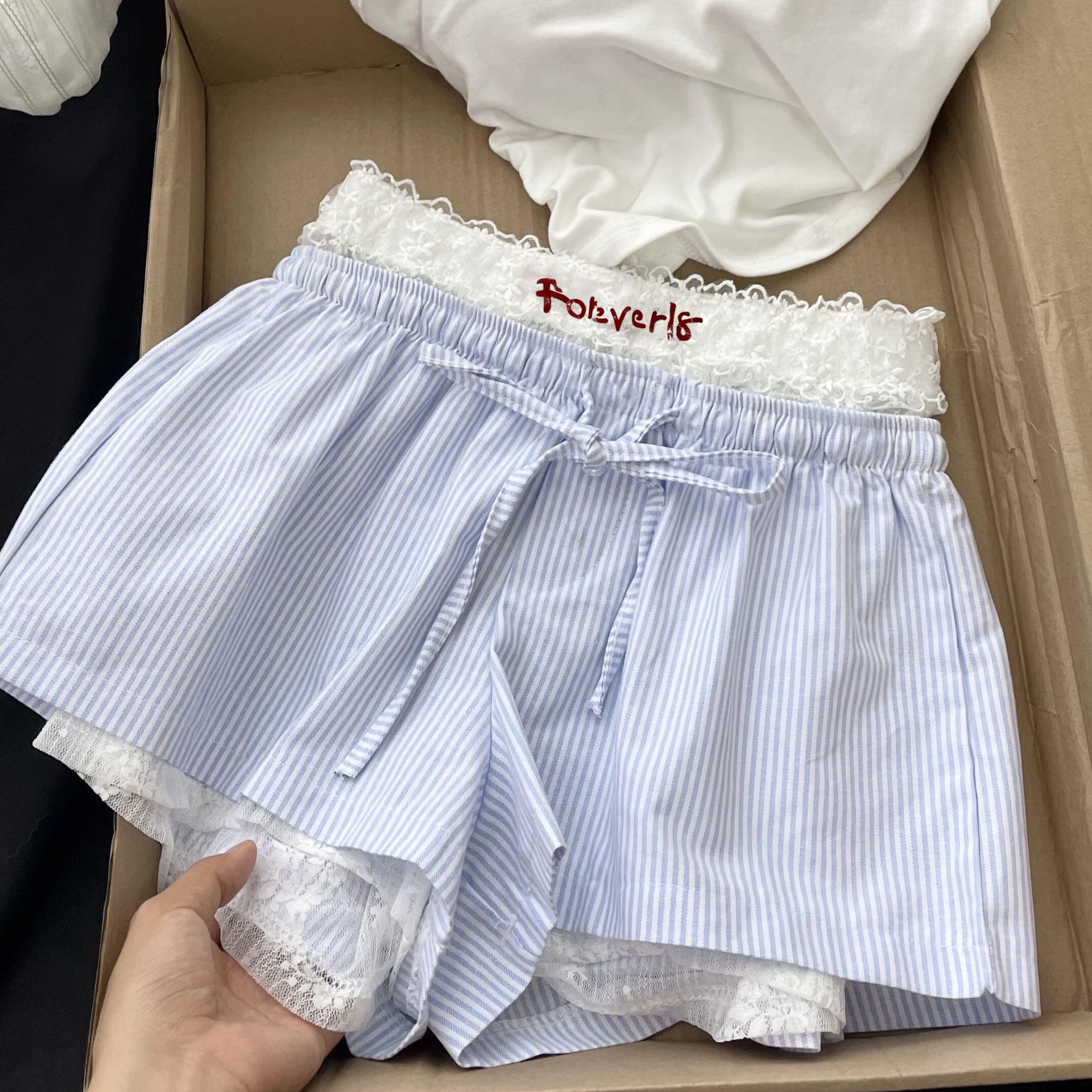 인스타그램 스타의 새로운 여름 스타일 틈새 디자인 레이스 스플리싱 바닥 레이어드 분위기 있는 스트라이프 반바지 트렌디