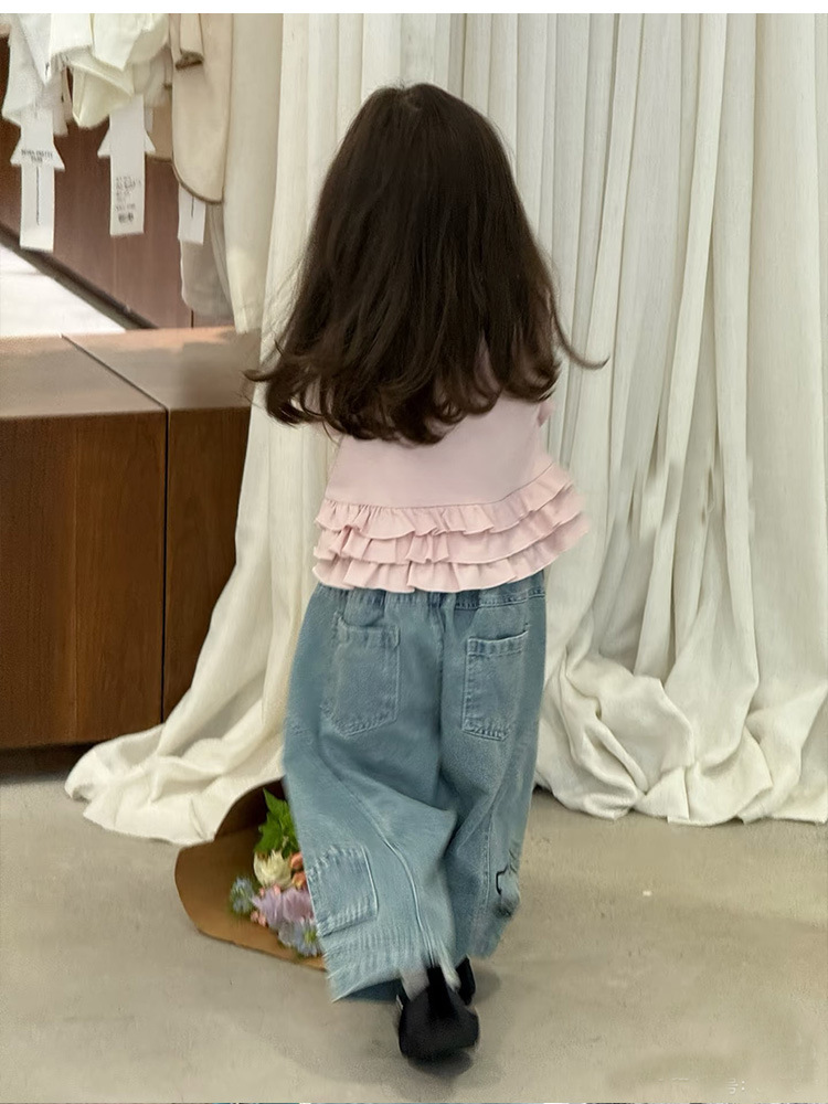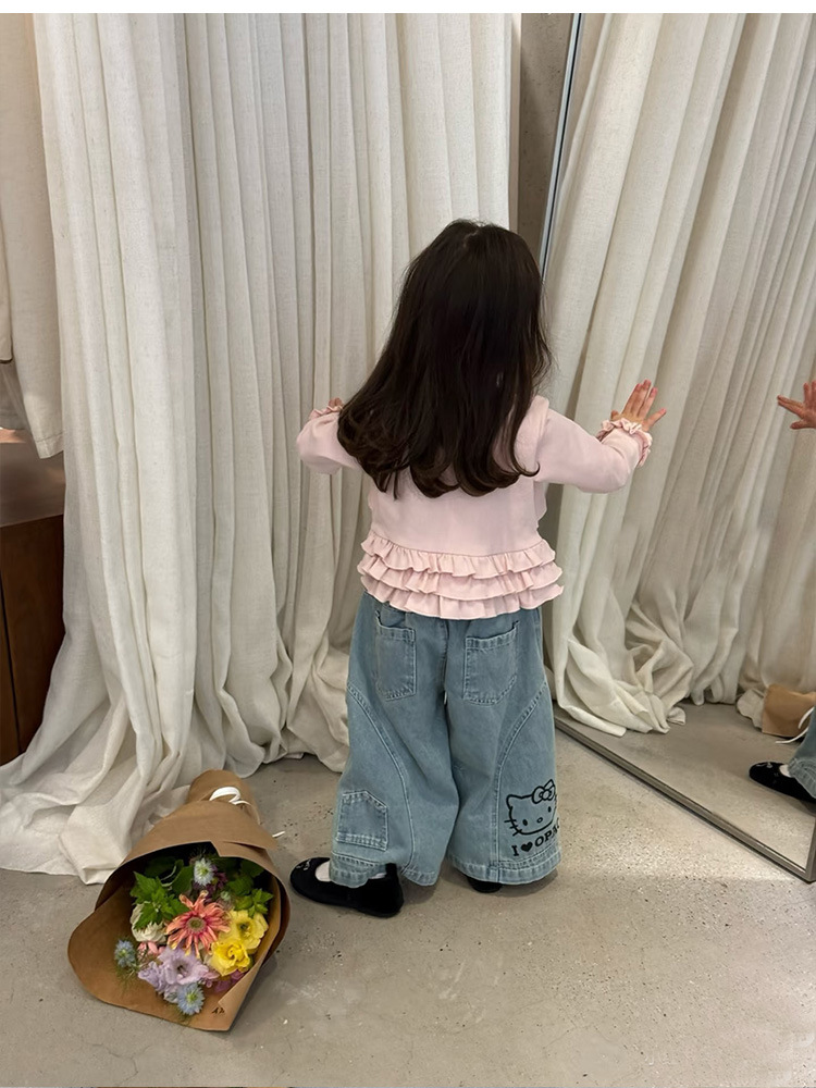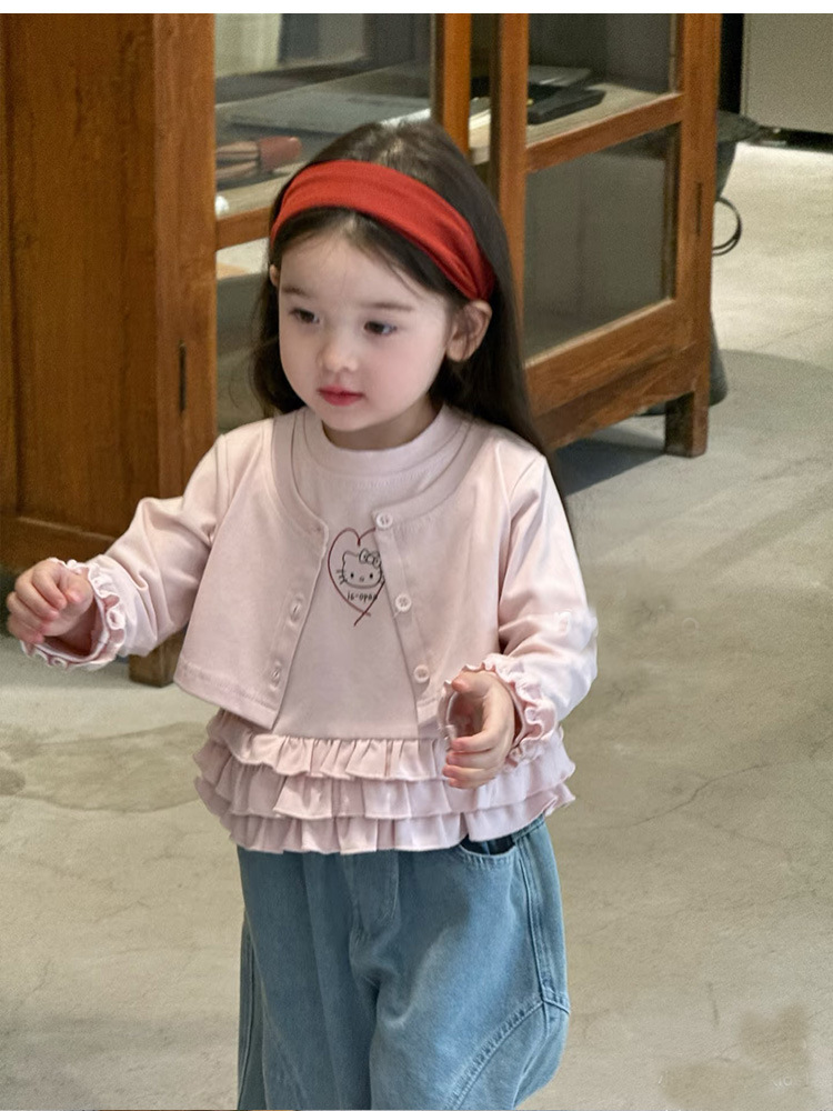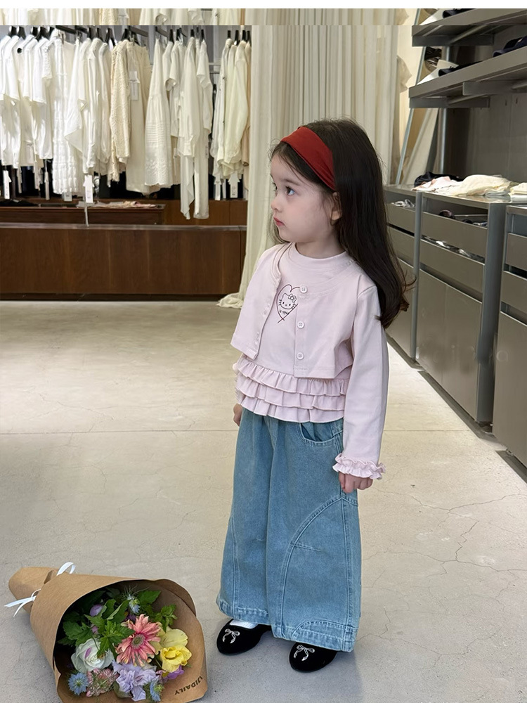 아동복 2026 봄 신상 여아 한국 스타일 KT 고양이 러플 페이크 투피스 티셔츠 와이드 레그 데님스토어 가기