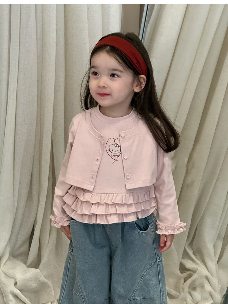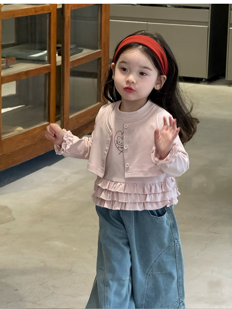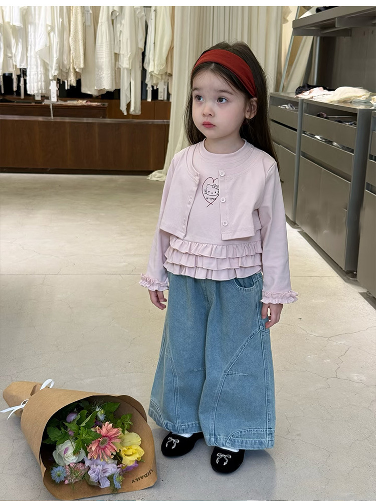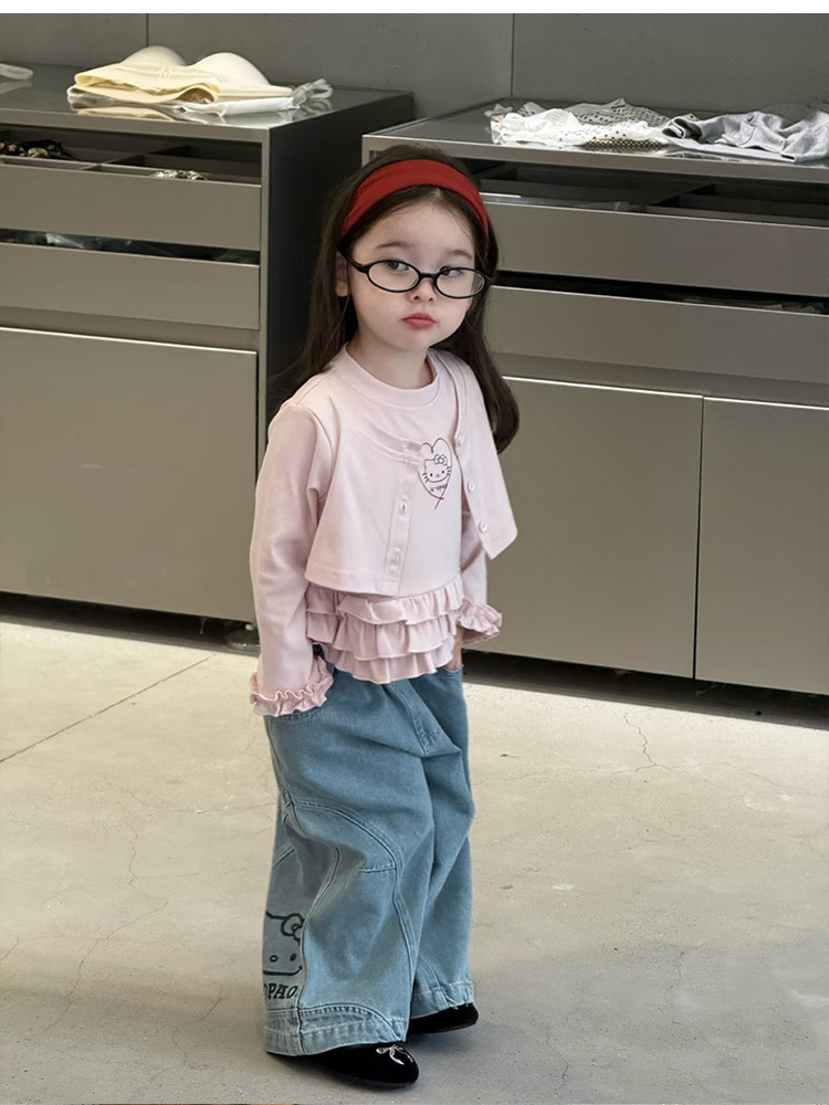 아동복 2026 봄 신상 여아 한국 스타일 KT 고양이 러플 페이크 투피스 티셔츠 와이드 레그 데님