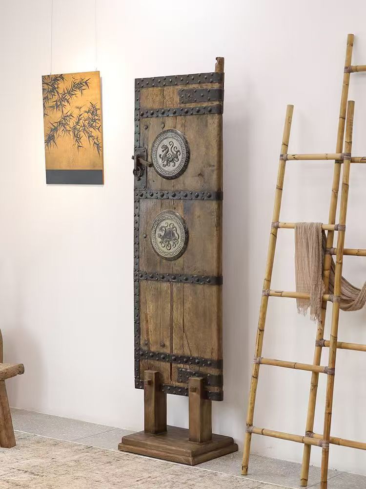복고풍 와비사비 스타일의 칸막이 현관 스크린으로 거실 배경 장식을 차단하고 오래된 느릅나무 문 패널과 오래된 물건을 보호합니다.
