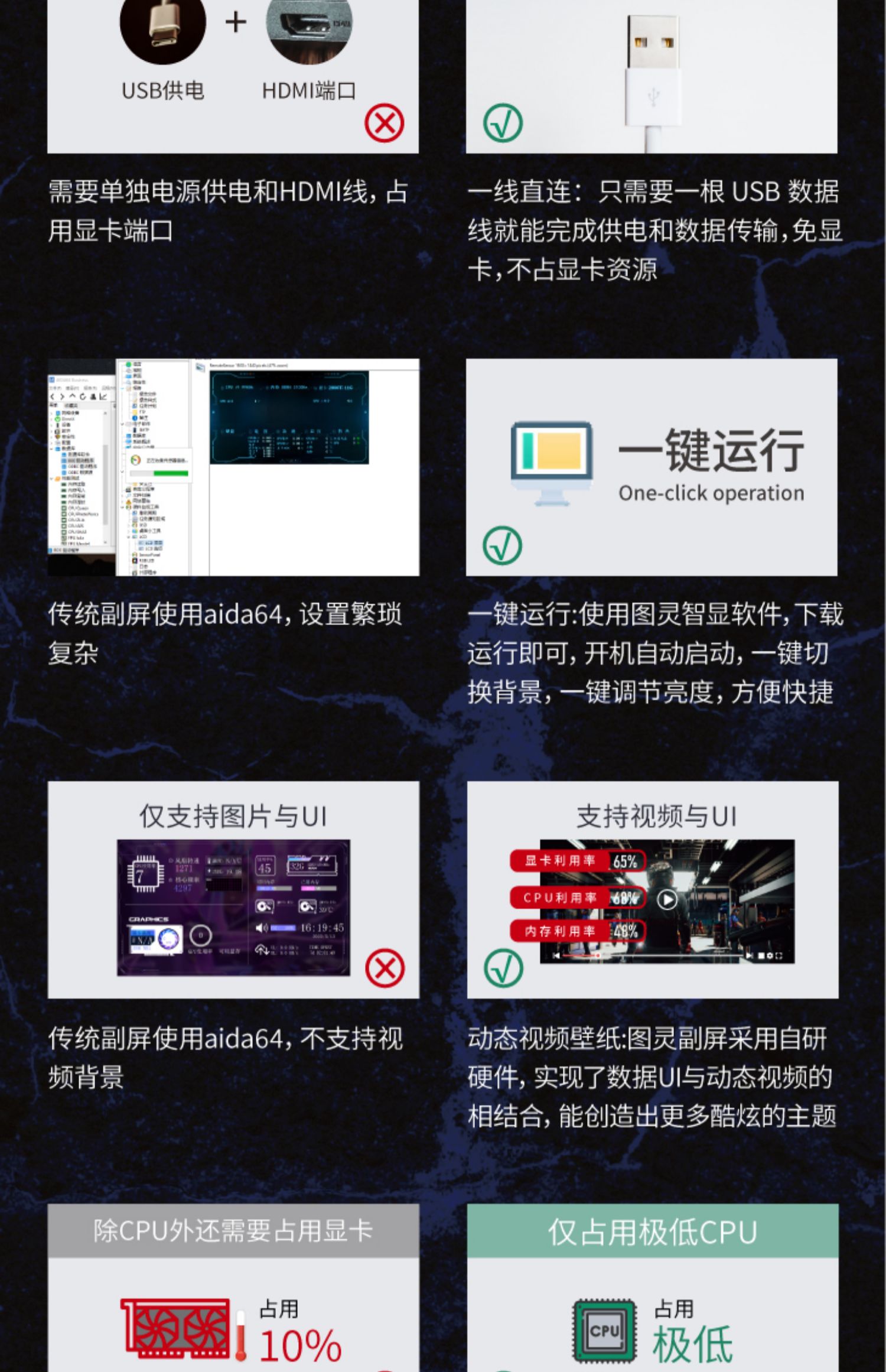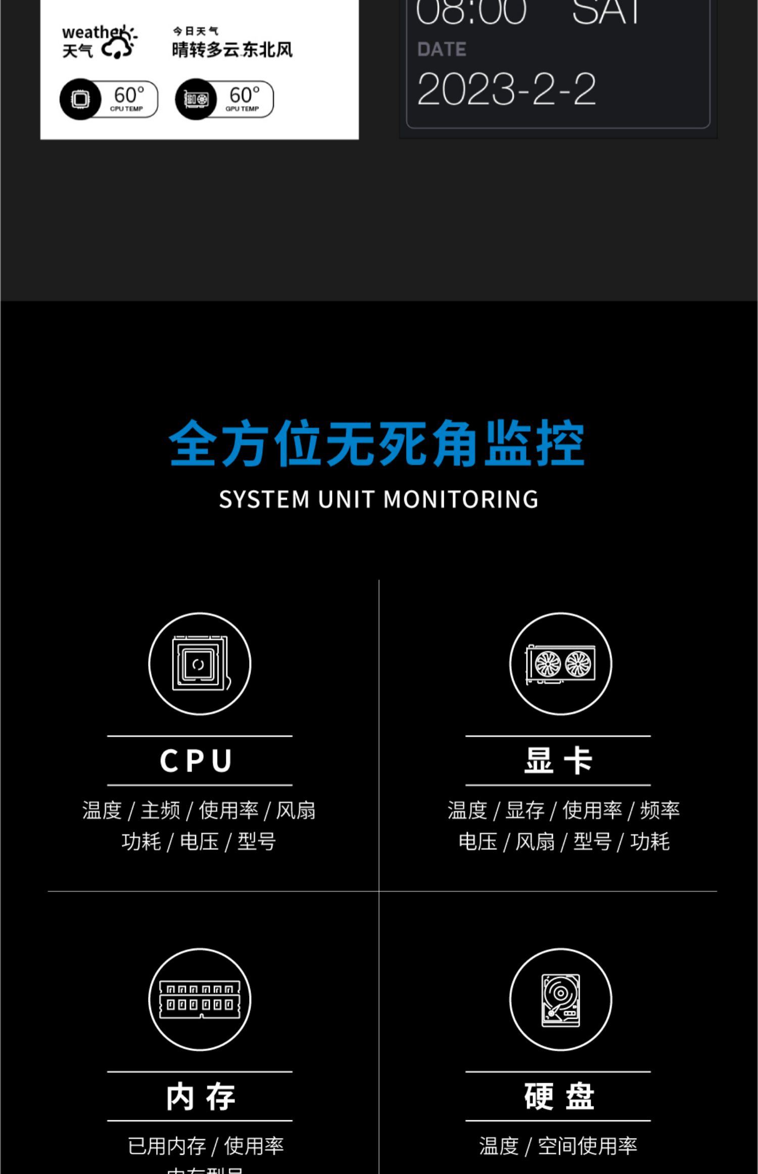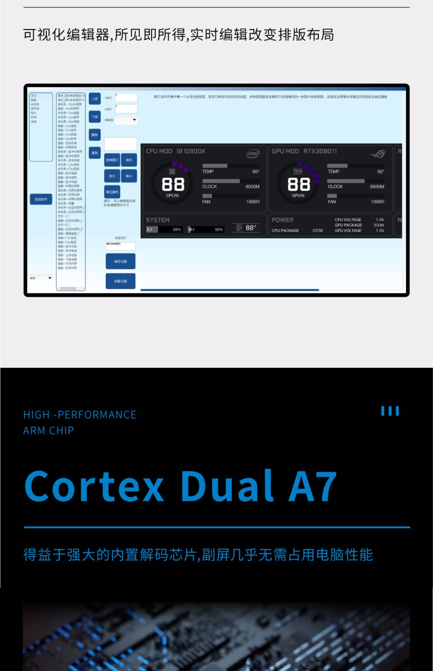 • 8.8inch 블랙 [성능을 차지하지 않음 - DIY 테마로 사용 가능] - 공식 표준 구성(USB 케이블/마더보드 케이블 + 팬 브래킷 + 데스크탑 브래킷 + 3M 양면 포함)