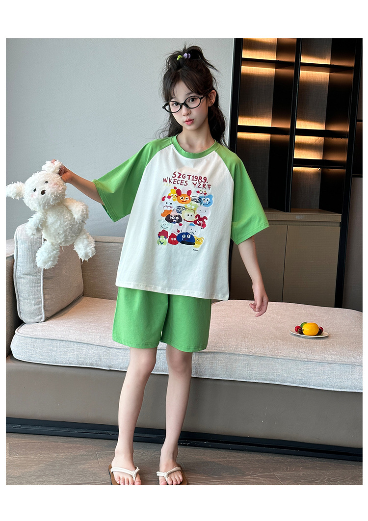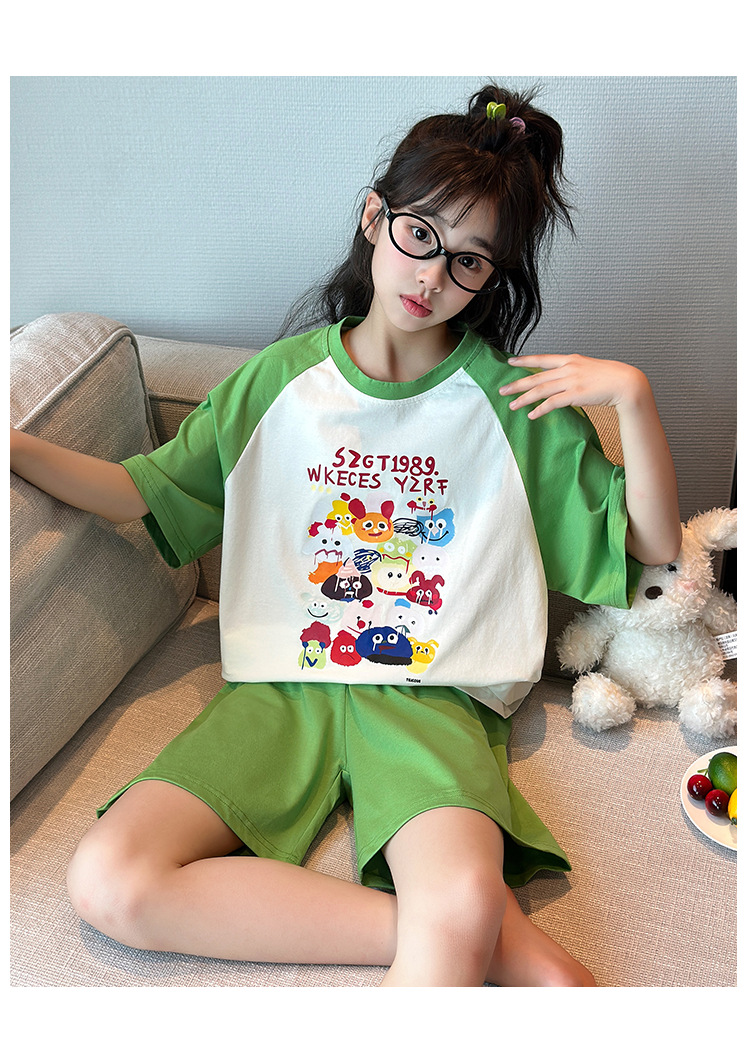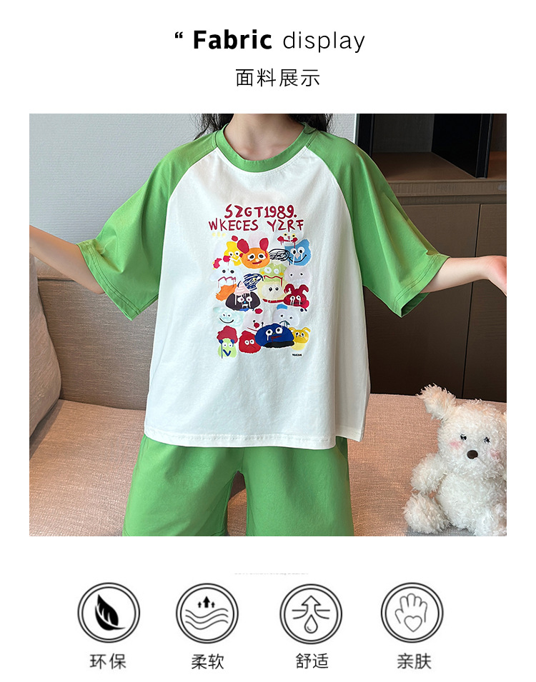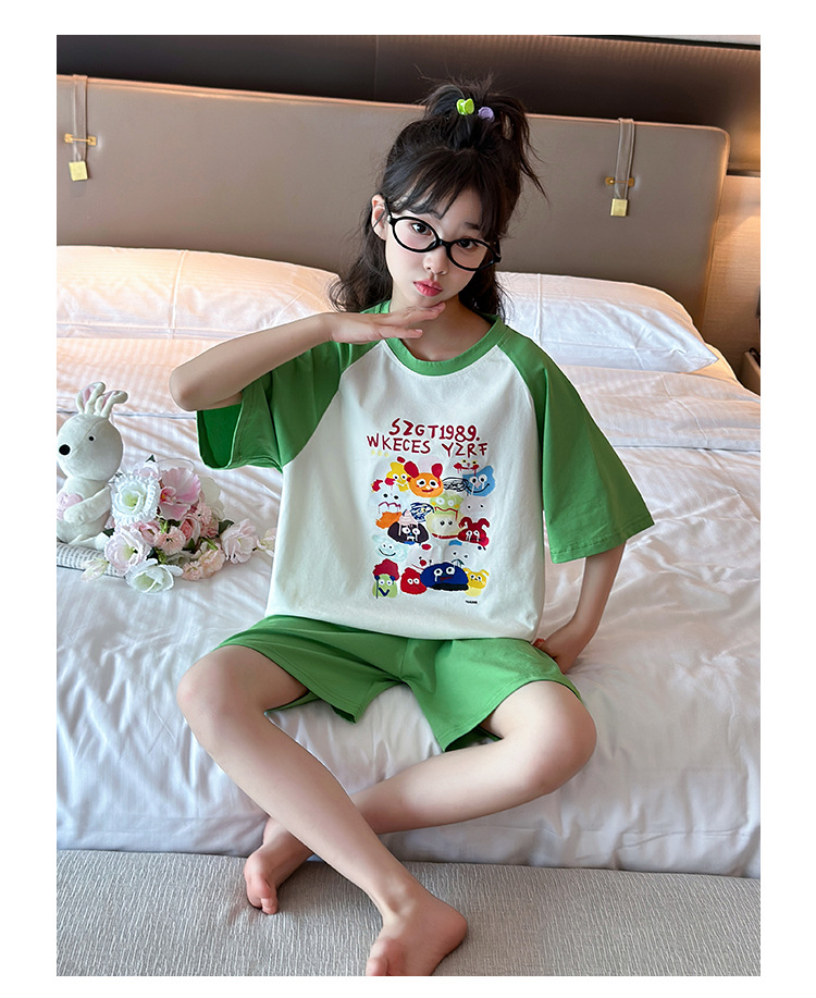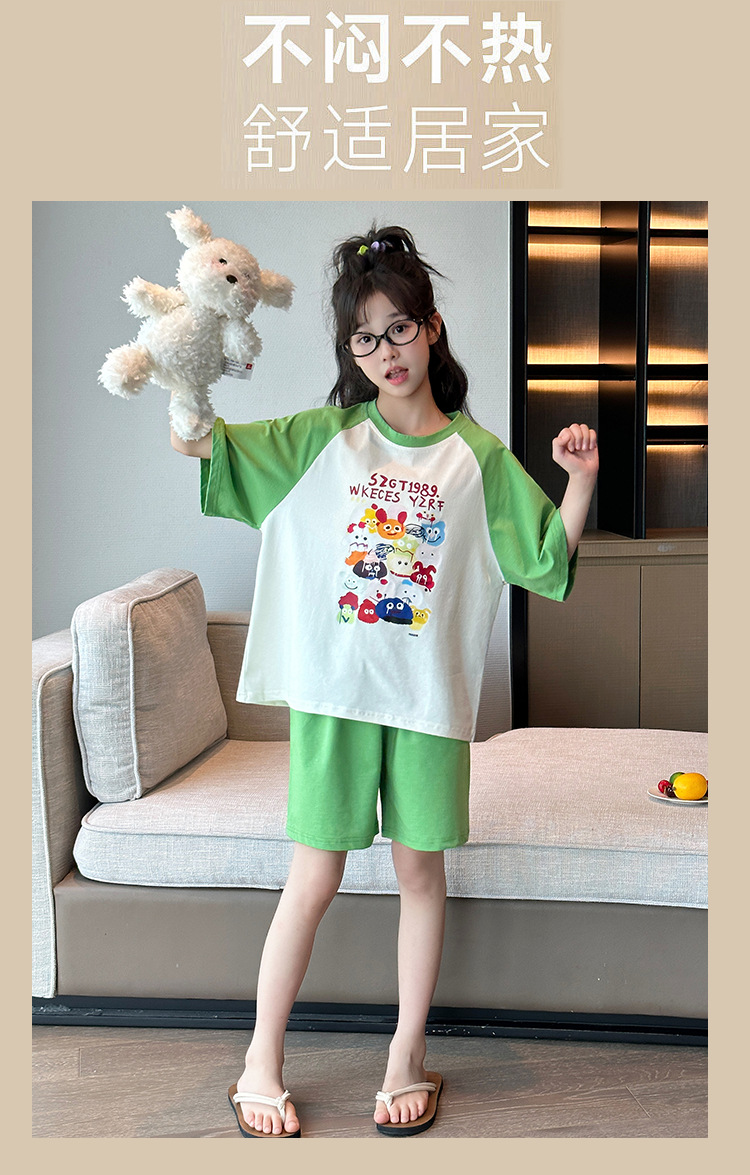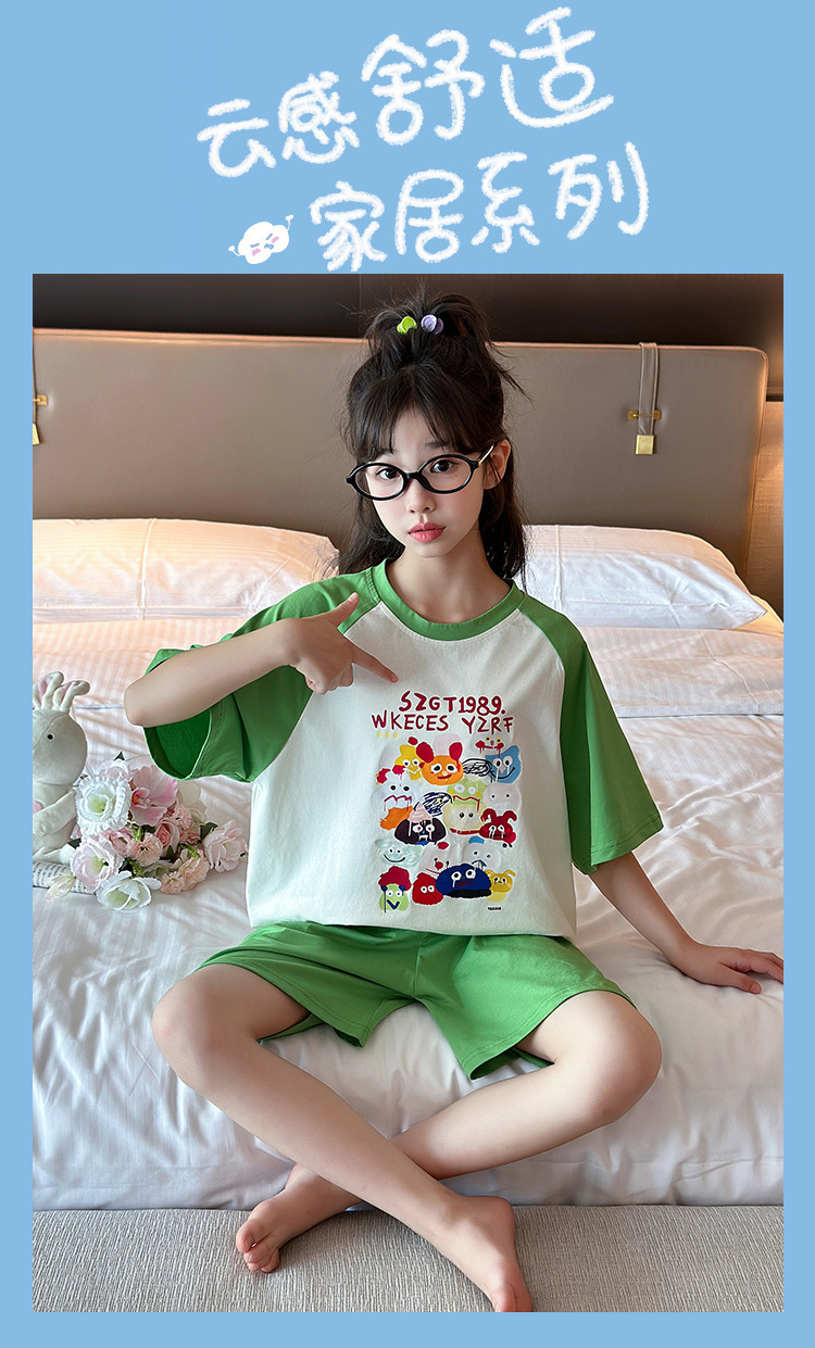 2025 새로운 여자 여름 잠옷 세트 순수 코튼 반팔 얇은 만화 스타일 여자 큰 어린이 홈 의류스토어 가기