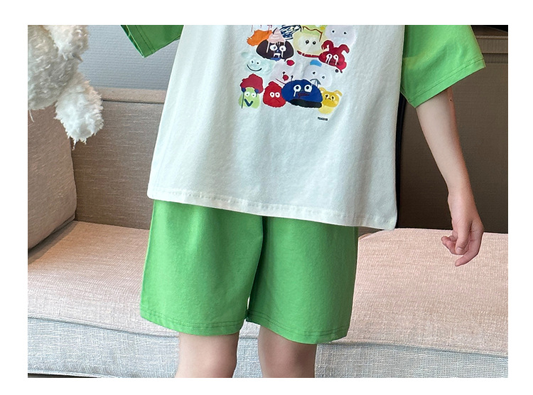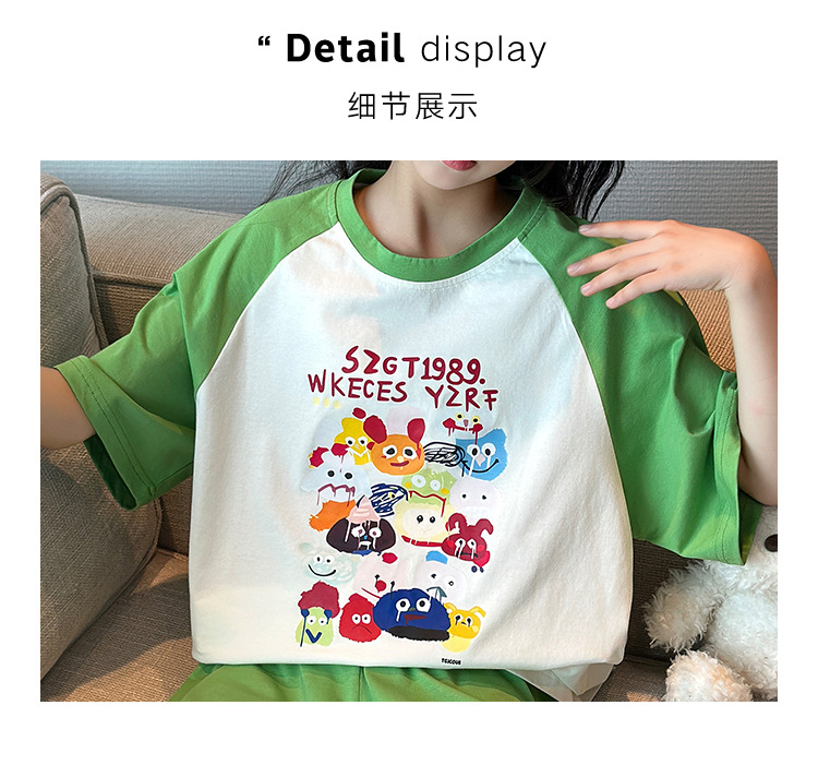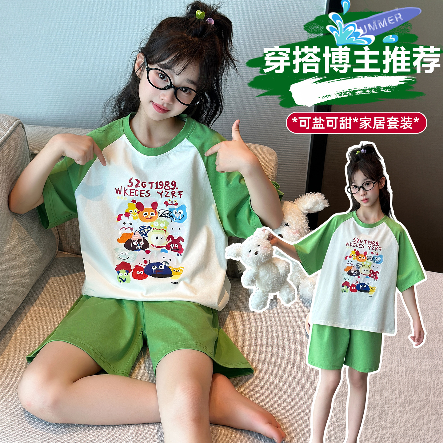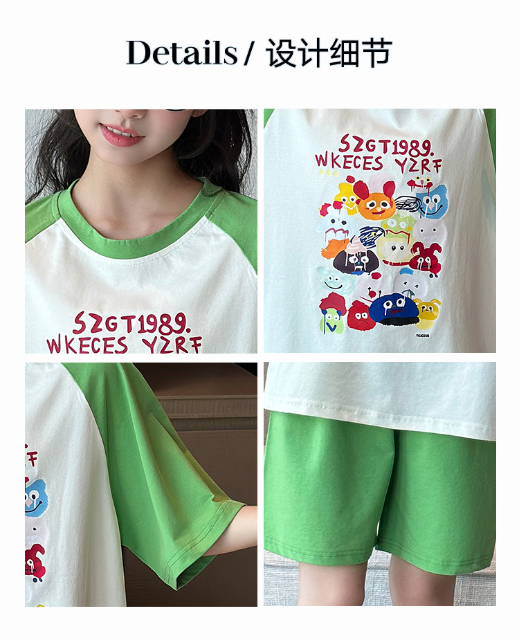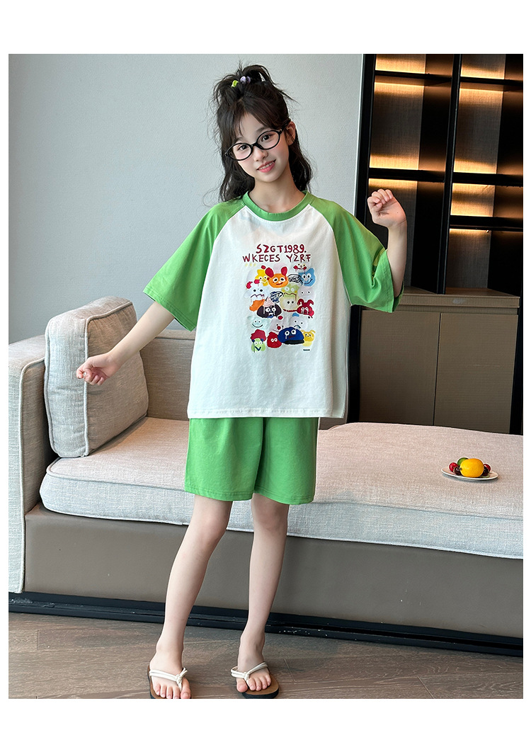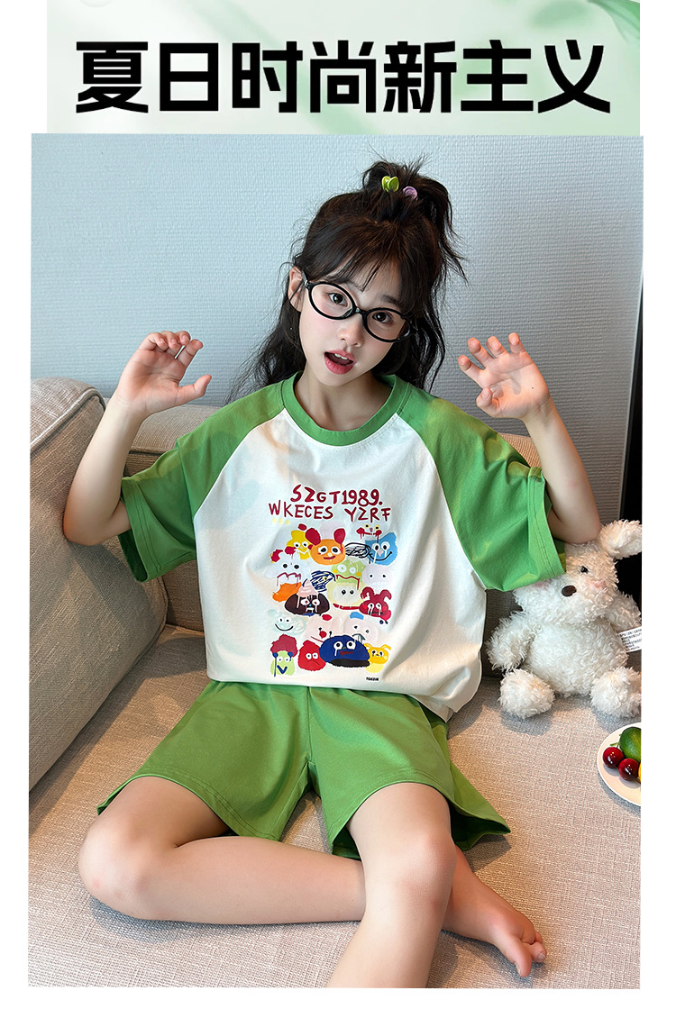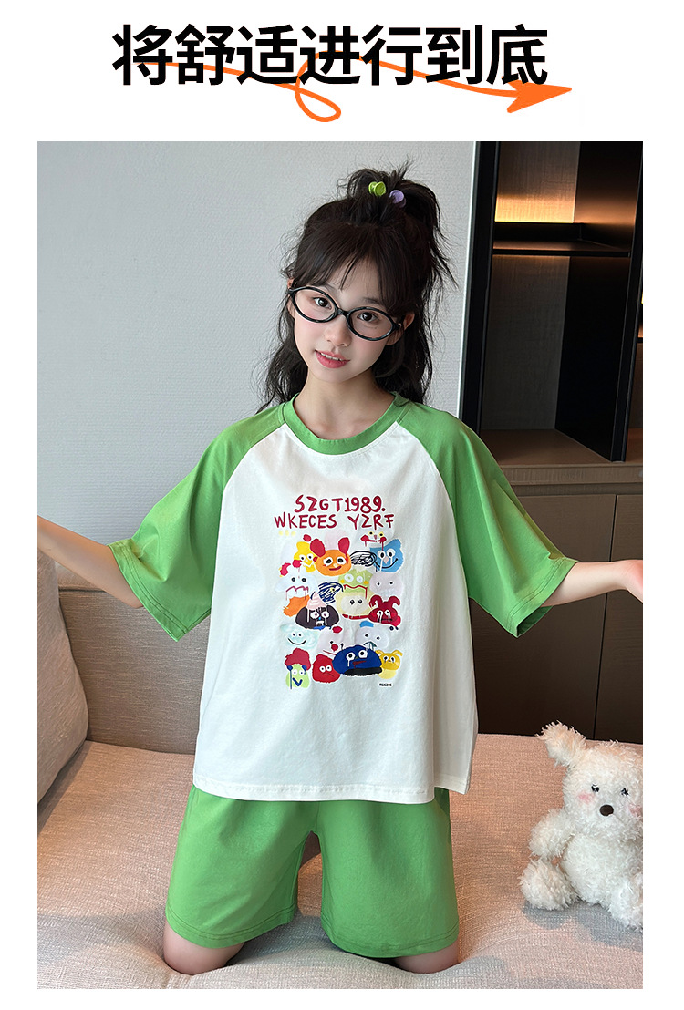 2025 새로운 여자 여름 잠옷 세트 순수 코튼 반팔 얇은 만화 스타일 여자 큰 어린이 홈 의류스토어 가기