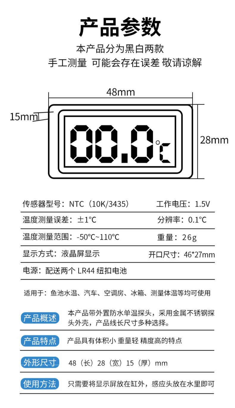 • zy【대형 화면 + 프로브 모델 ☆ 흑백] ★ 1.5M 방수 프로브 포함 ☆ 시계 알람 시계 기능