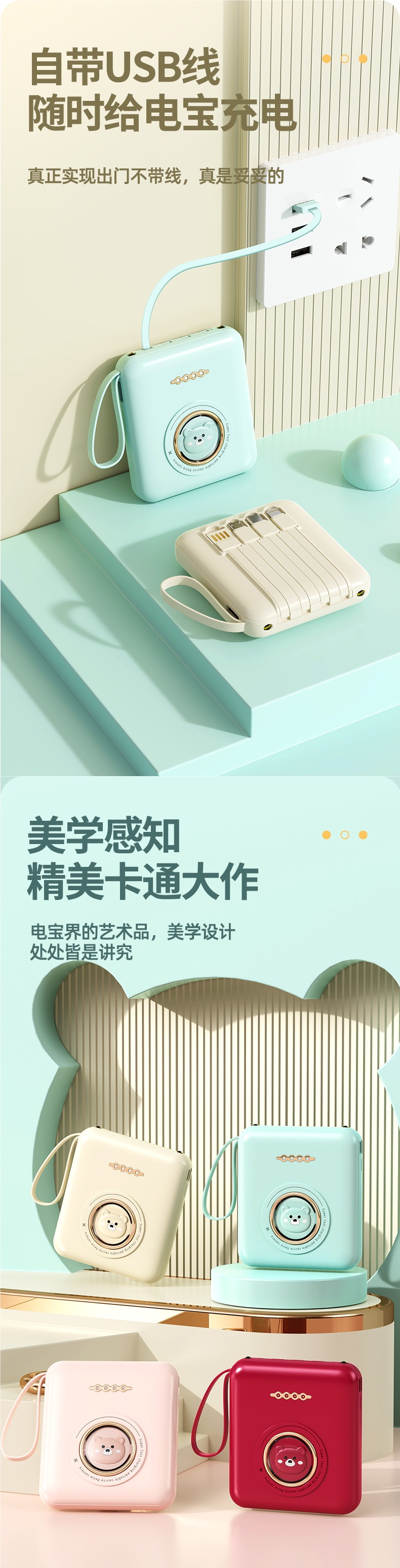 [3C 인증] 케이블이 내장된 초대형 용량의 미니 보조베터리 20000mAh 초박형, 소형 및 휴대용 모바일