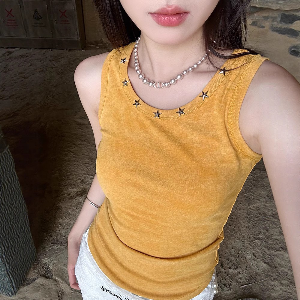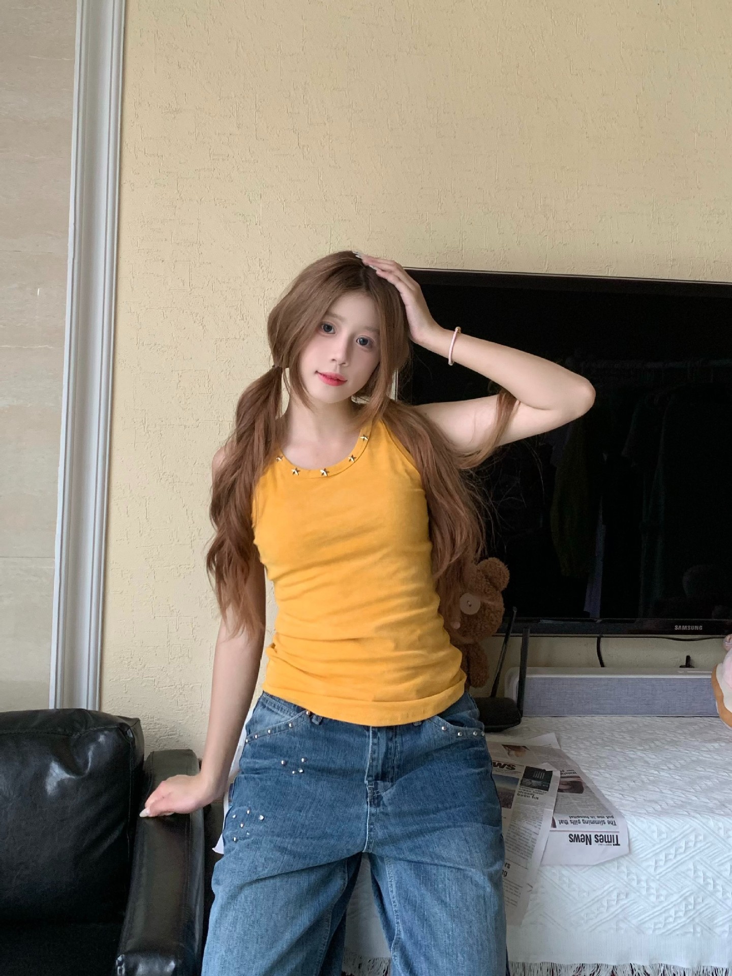 여름용 미국식 노란색 U 넥 핫 소녀 캐미솔 여성용 리벳 장식 슬림 짧은 디자인 틈새 탑스토어 가기