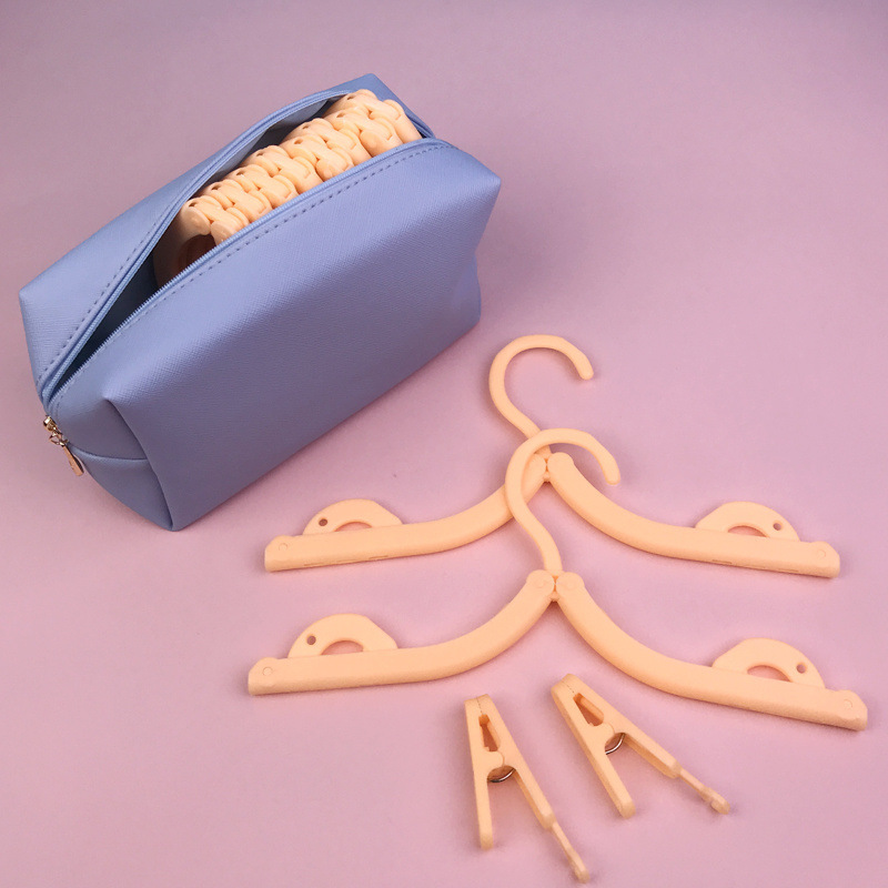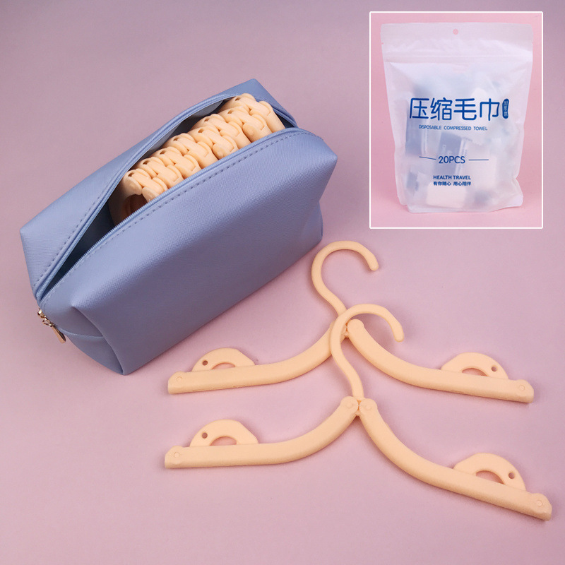 • 연한 보라색 가방 + 노란색 접이식 옷걸이 10개 + 압축 수건 1팩