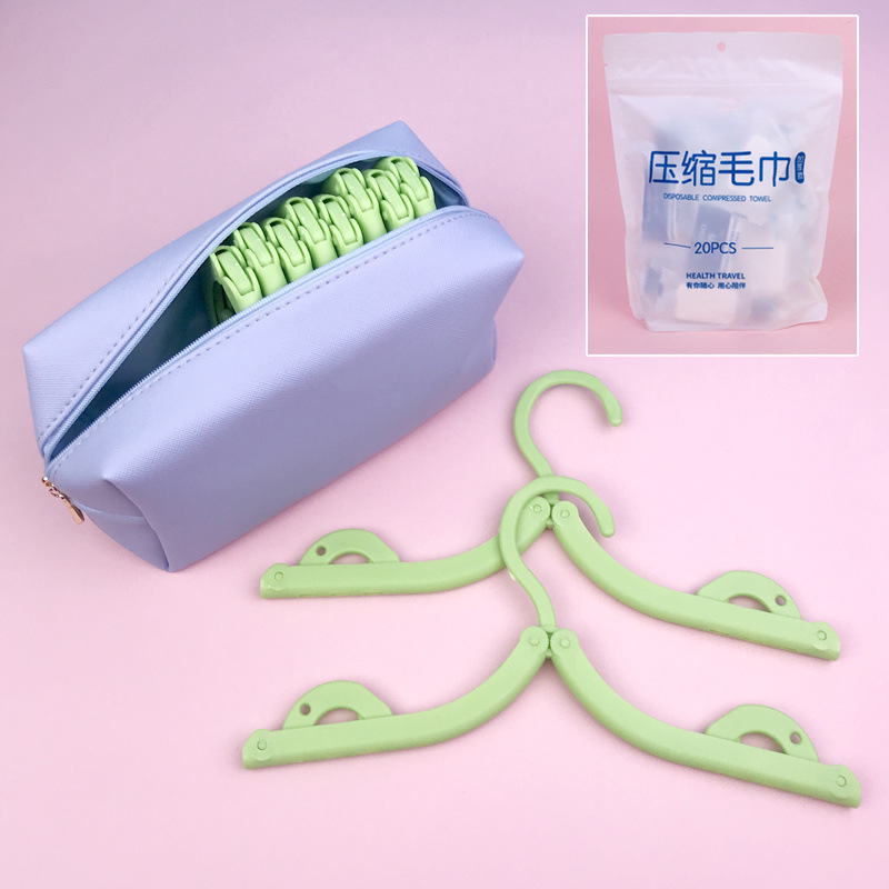 • 연한 보라색 가방 + 녹색 접이식 옷걸이 10개 + 압축 수건 1팩