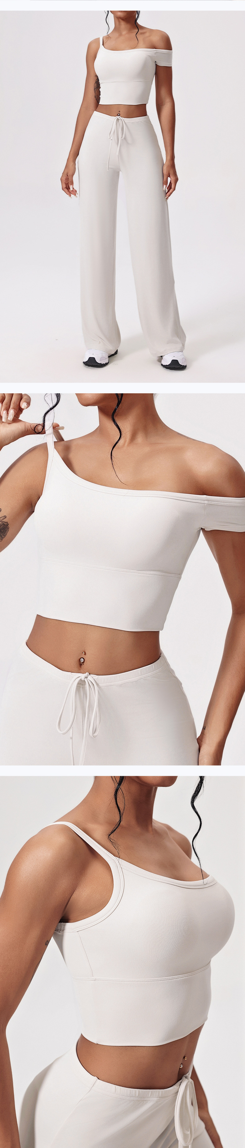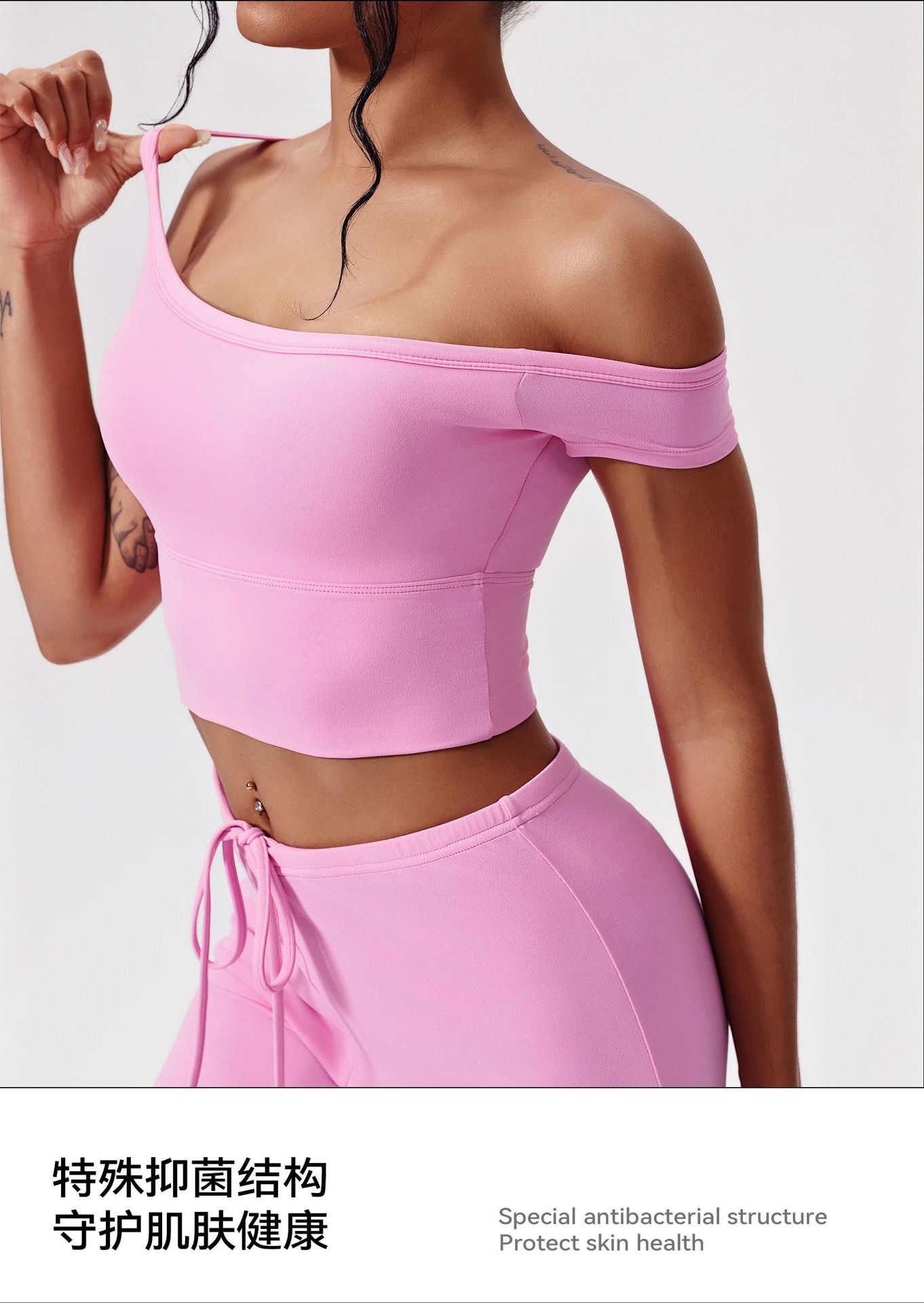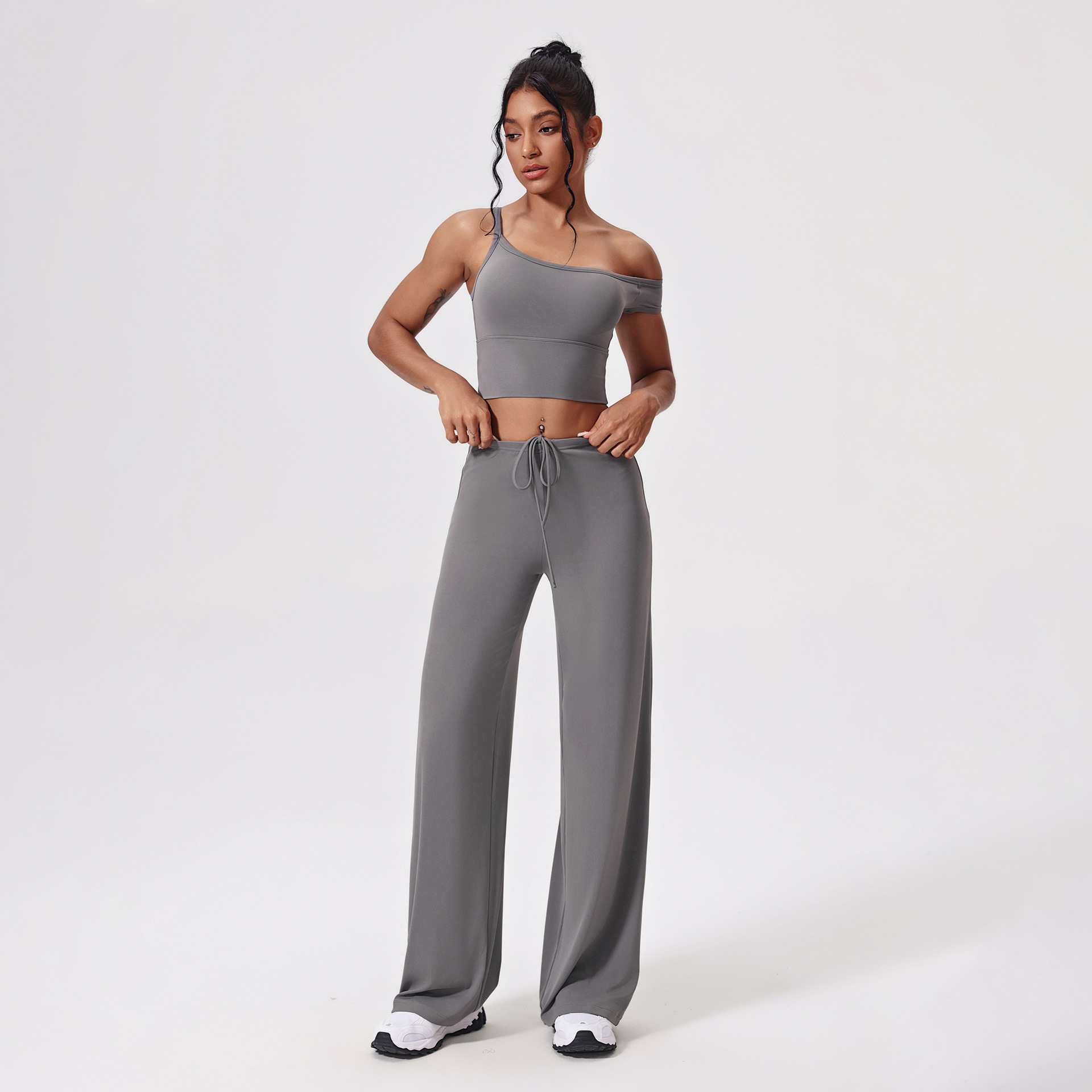 Yunsen 국경 간 항균 요가 의류 세트 비스듬한 어깨 꽉 끼는 속건성 피트니스 의류 느슨한 캐주얼 스포츠 정장 여성
