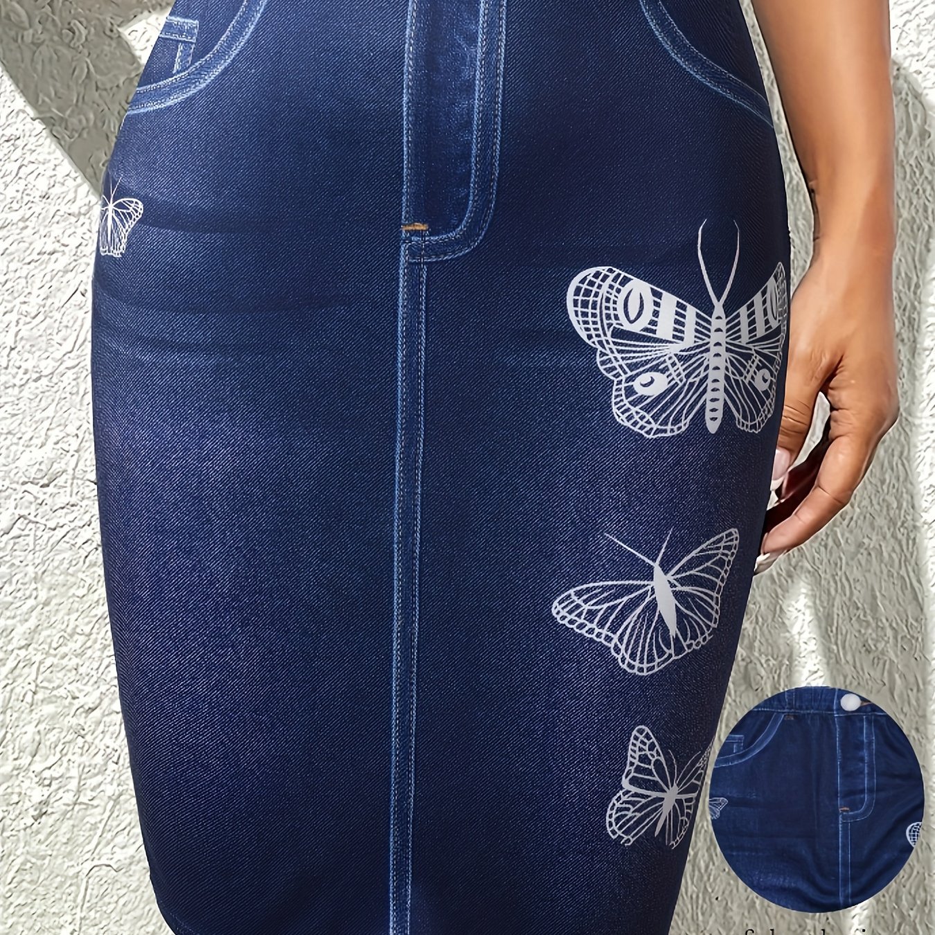 2025 새로운 크로스보더 유럽과 미국의 우아한 하이 웨이스트 나비 프린트 스커트 모조 데님 스커트