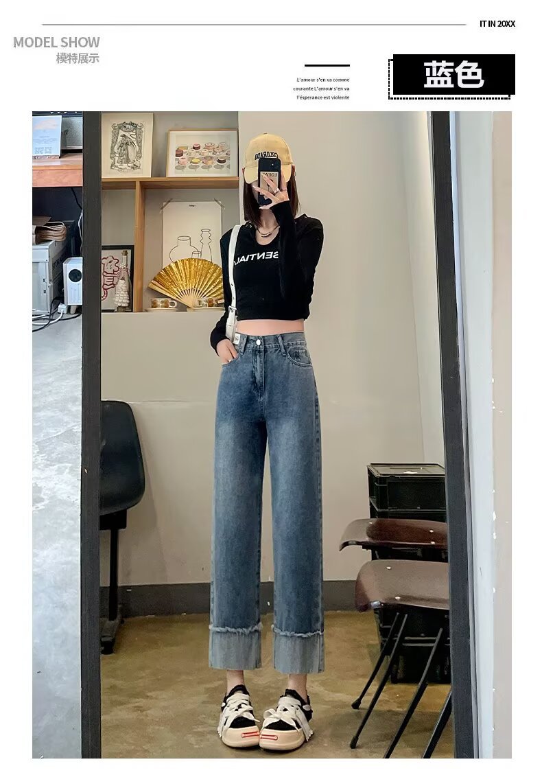 여성을위한 한국 스타일 캐주얼 스트레이트 청바지 여름 새로운 하이 웨이스트 슬림 다목적 탄성 허리 청바지스토어 가기