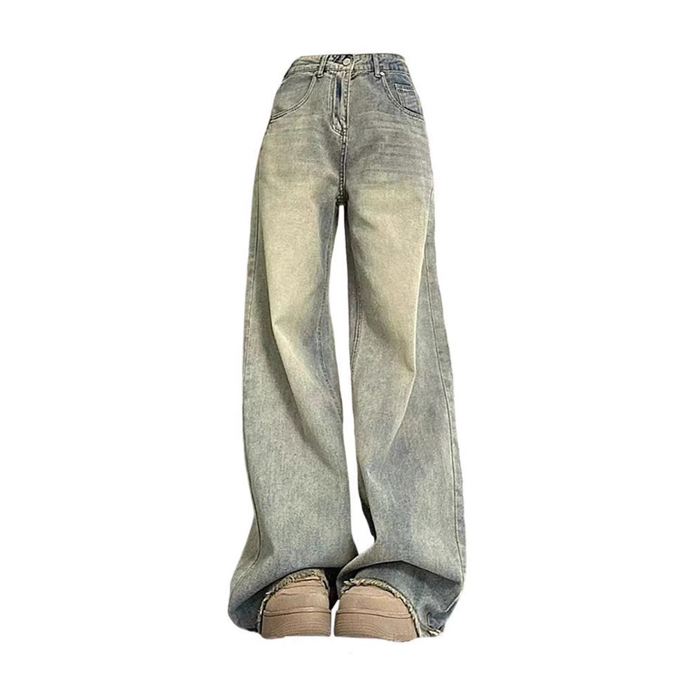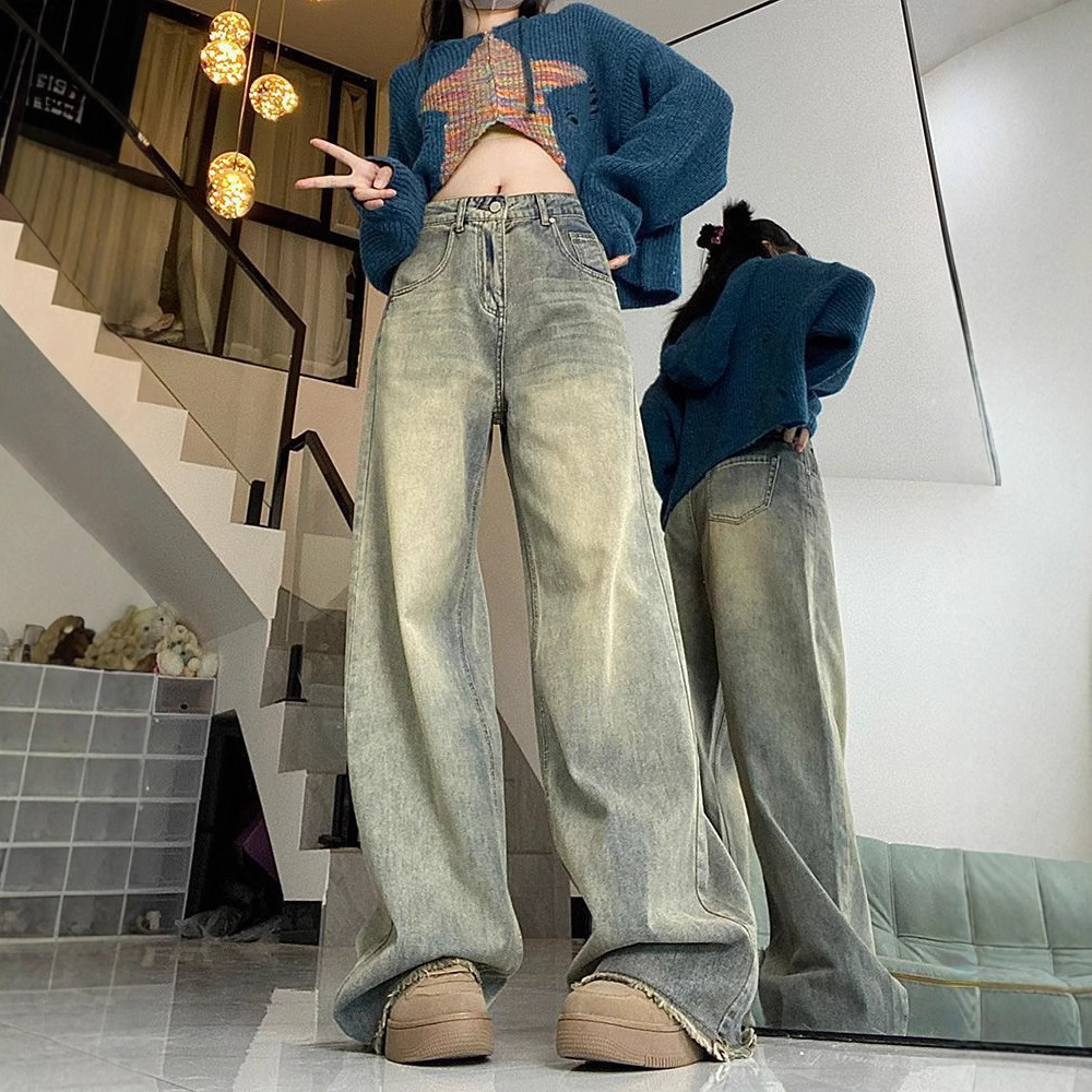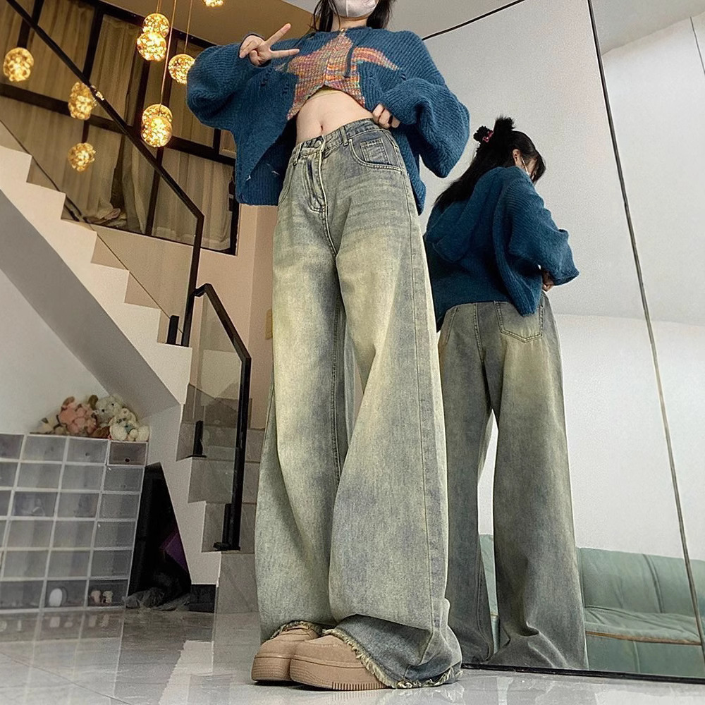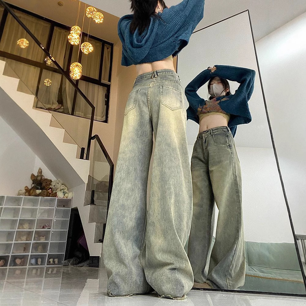 가을 여성용 향수를 불러일으키는 아메리칸 레트로 로우 엣지 스트레이트 청바지 하이웨이스트 루즈 슬리밍 플러스 사이즈 와이드 레그 바닥 길이 바지스토어 가기