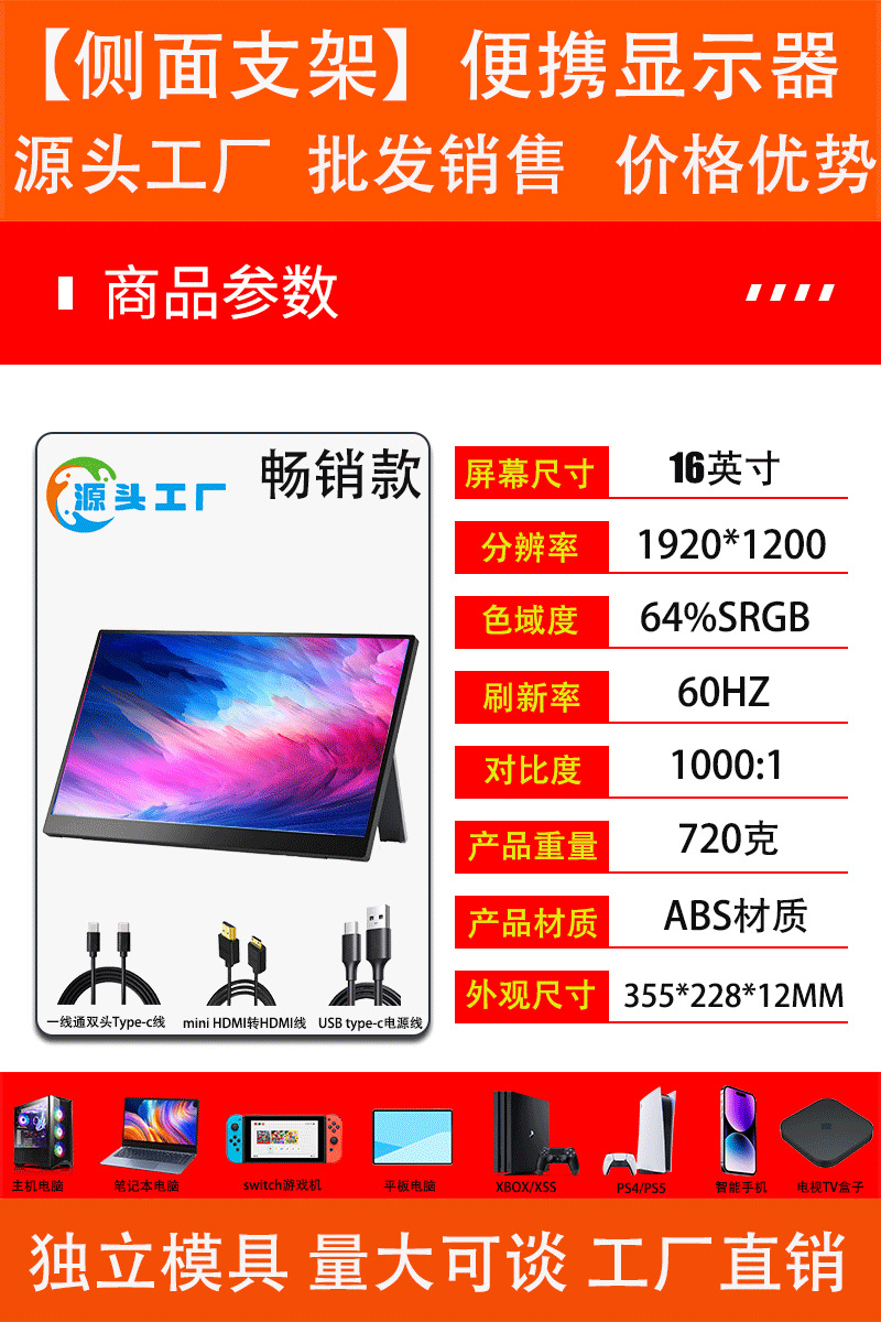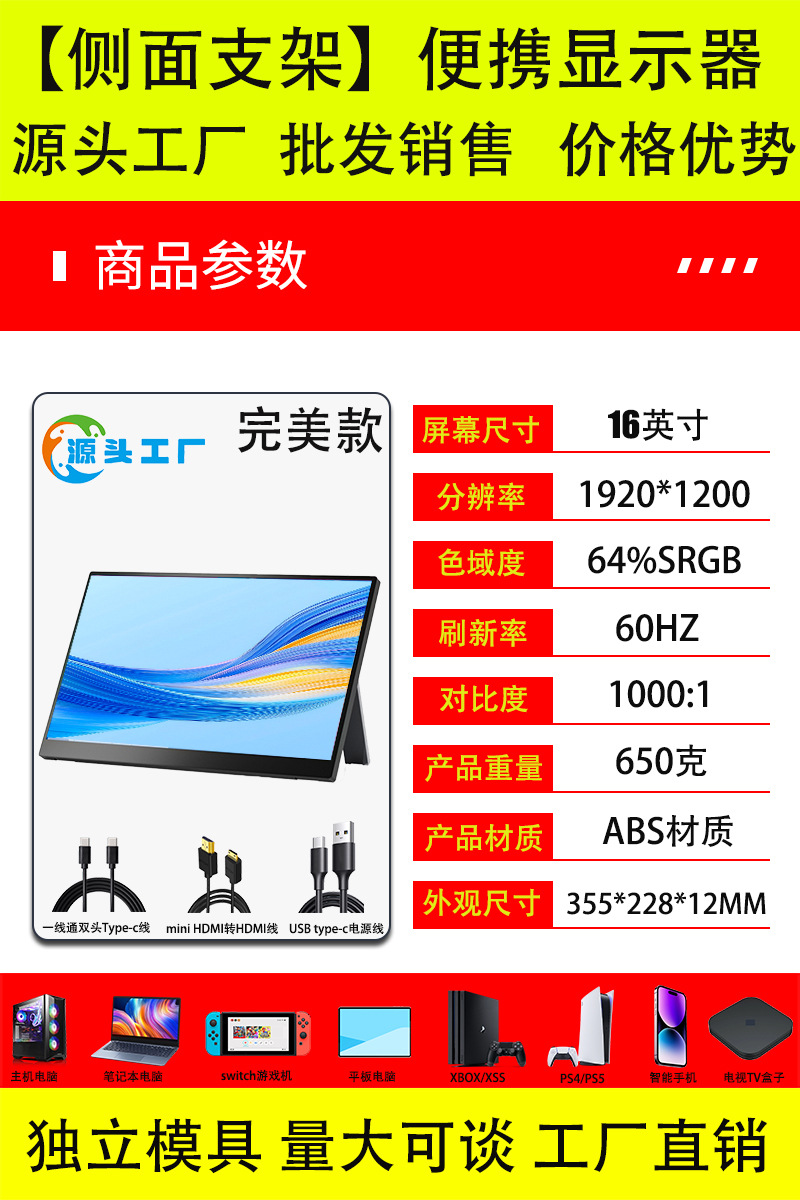 16inch 싱글바 스탠드 고색영역 휴대용 모니터 대형 휴대용 스크린 컴퓨터 연결 보조 화면 확장 분할 화면