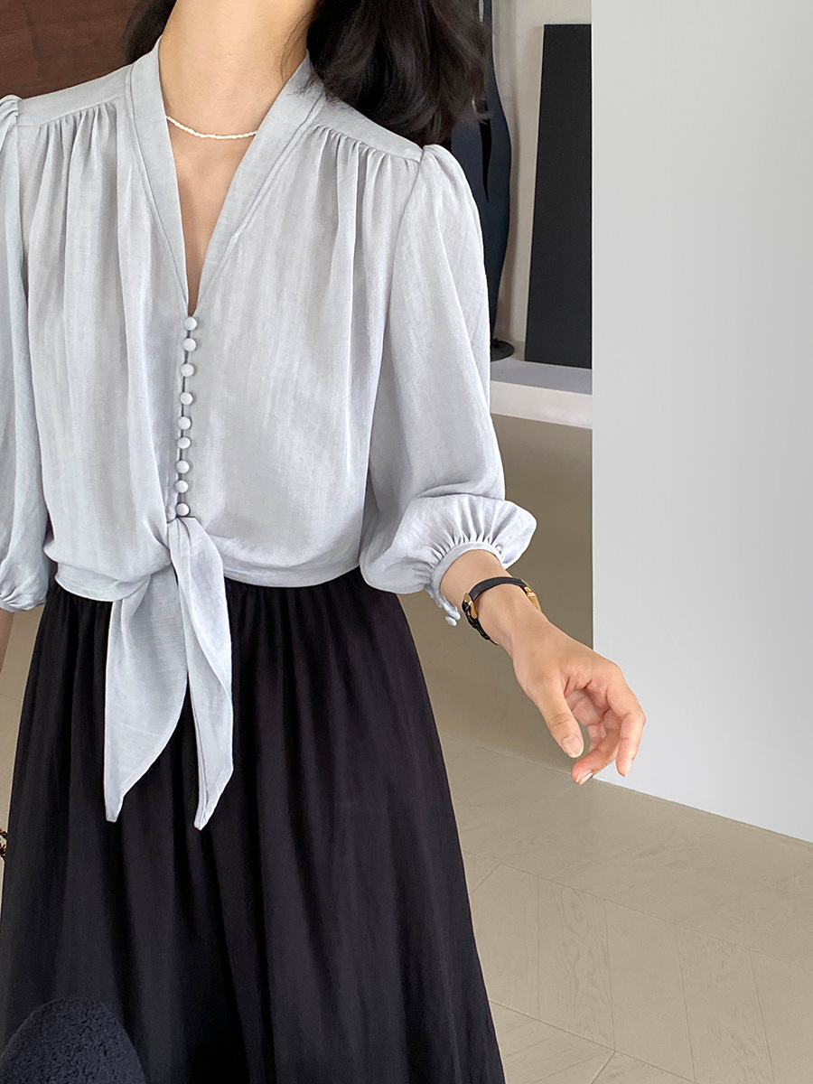 【특가 상품, 반품 불가】강저우 프렌치 스타일 끈끈이 V넥 셔츠 여성 여름 랜턴 슬리브 블라우스 1618