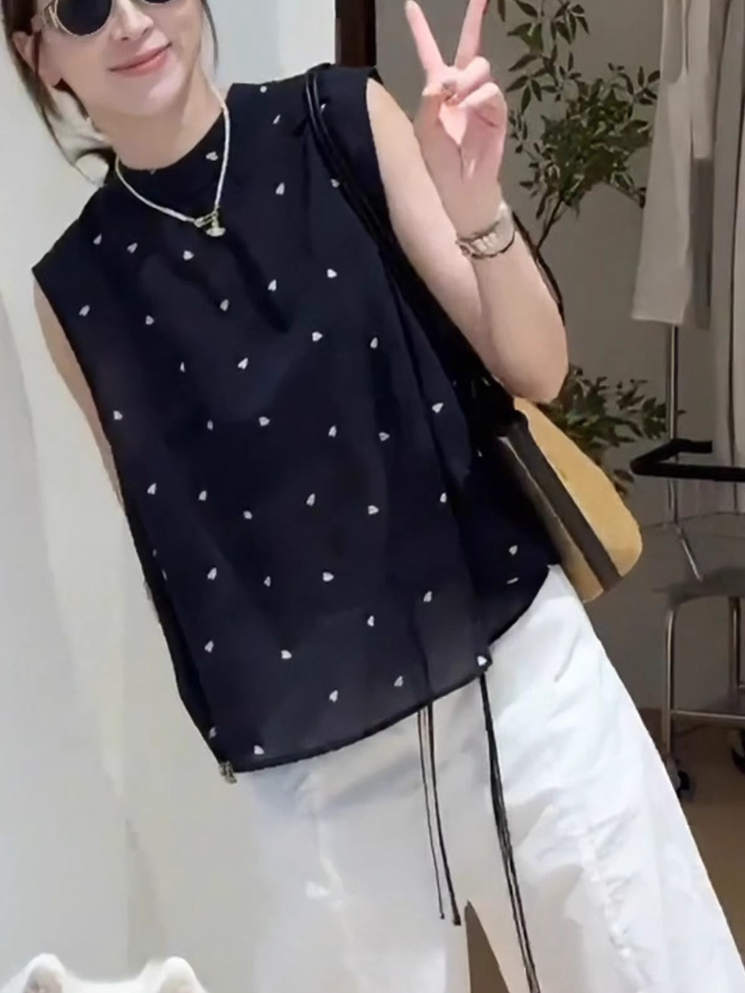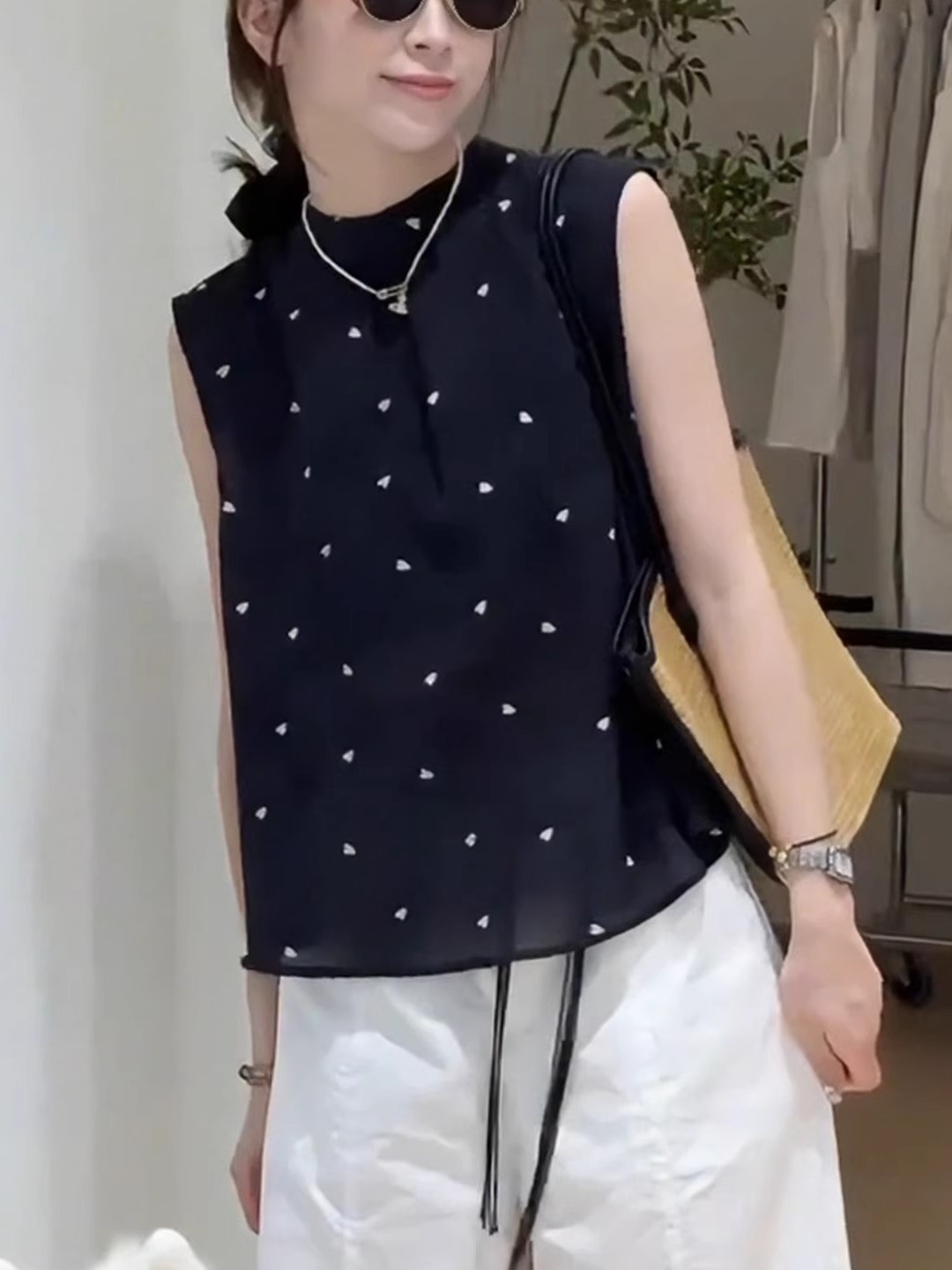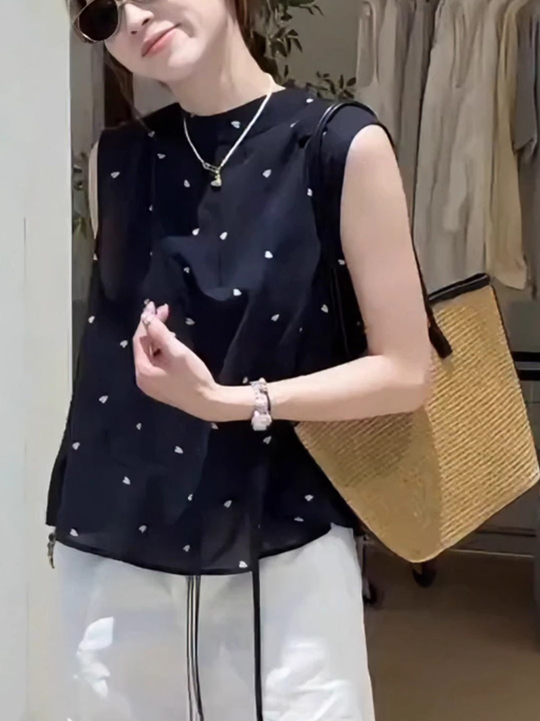 여성을위한 프랑스 복고풍 폴카 도트 라운드 넥 민소매 쉬폰 셔츠 2025 새로운 디자인 세련되고 아름다운 조끼 탑