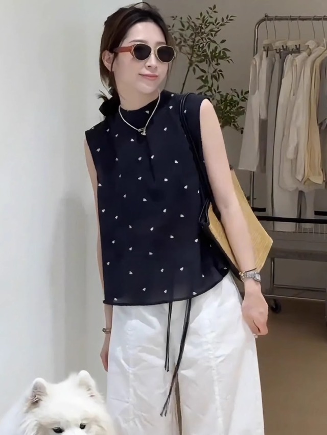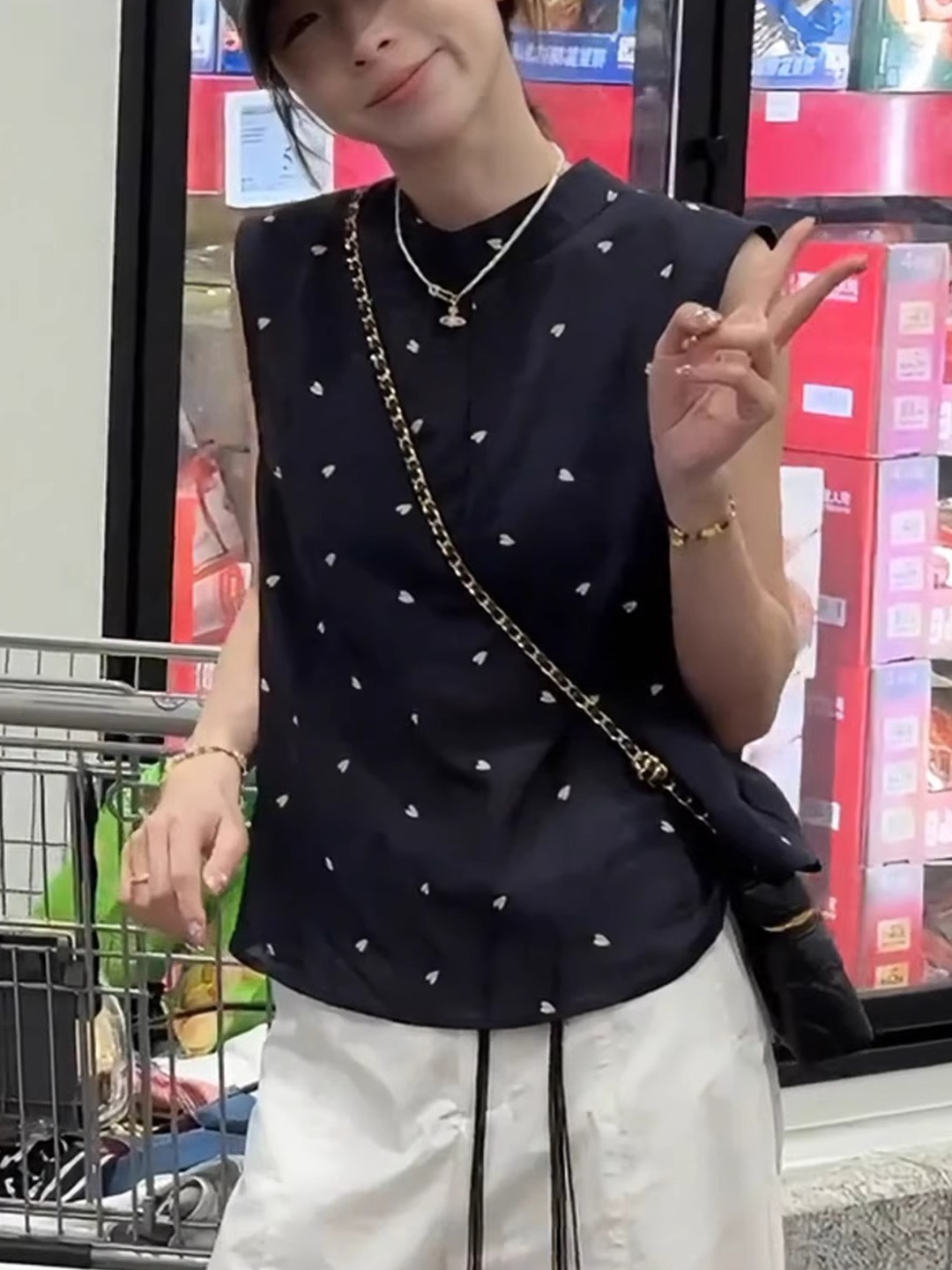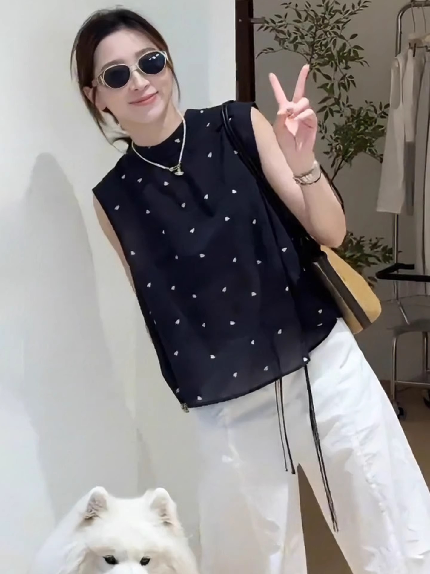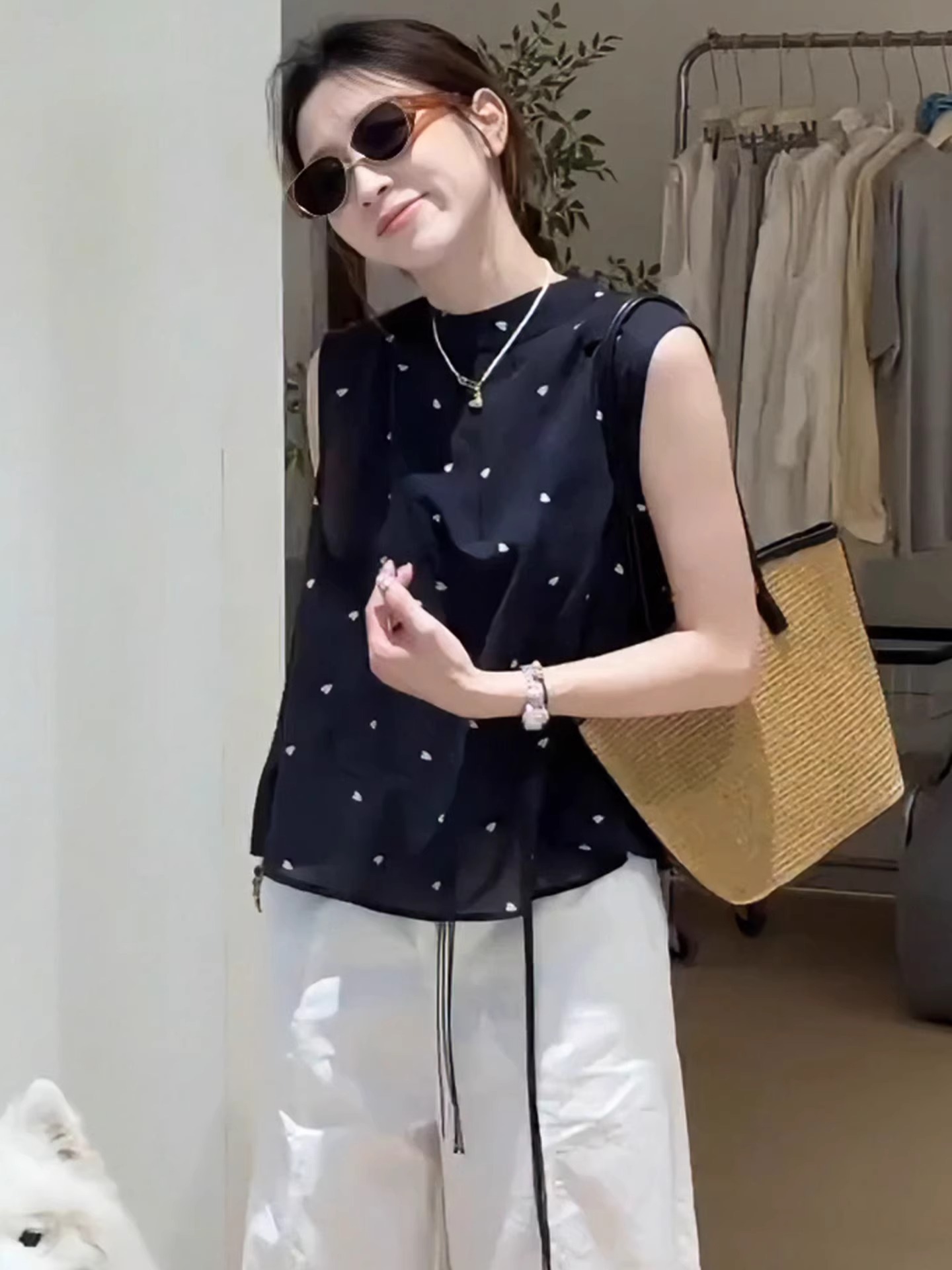 여성을위한 프랑스 복고풍 폴카 도트 라운드 넥 민소매 쉬폰 셔츠 2025 새로운 디자인 세련되고 아름다운 조끼 탑