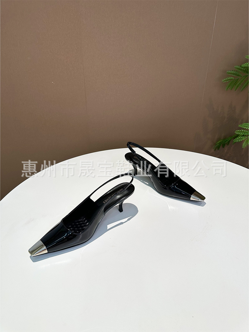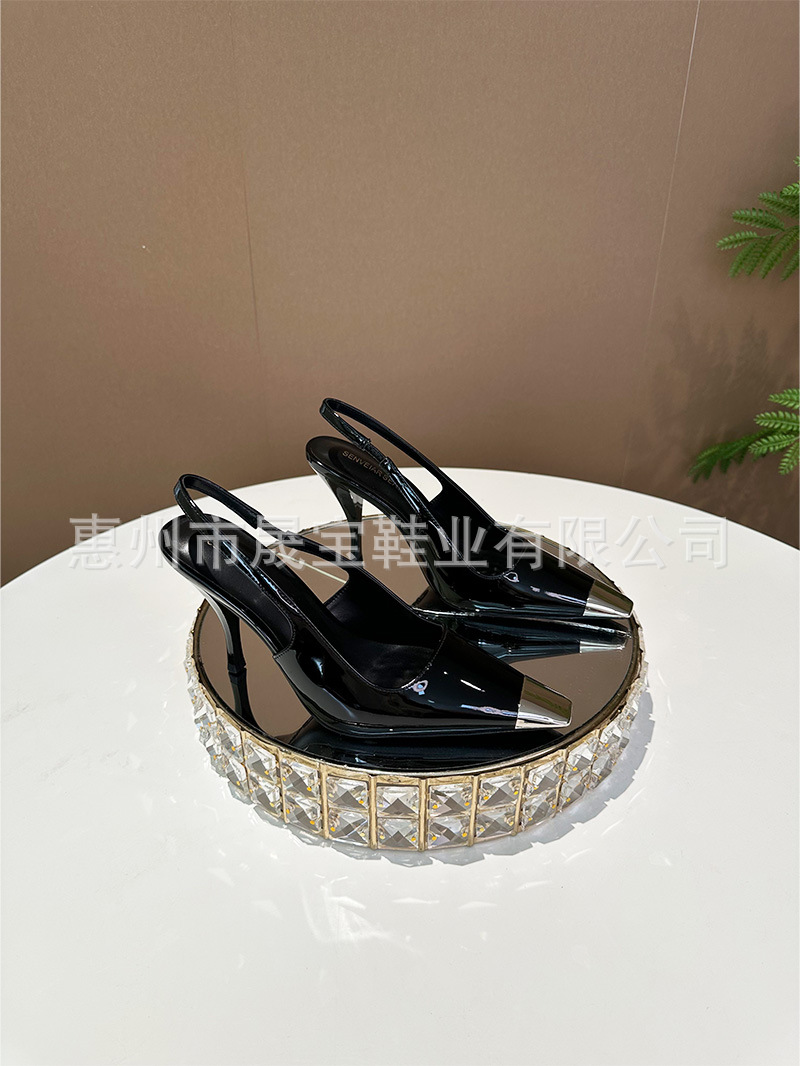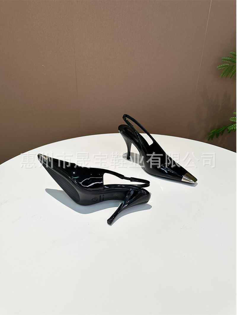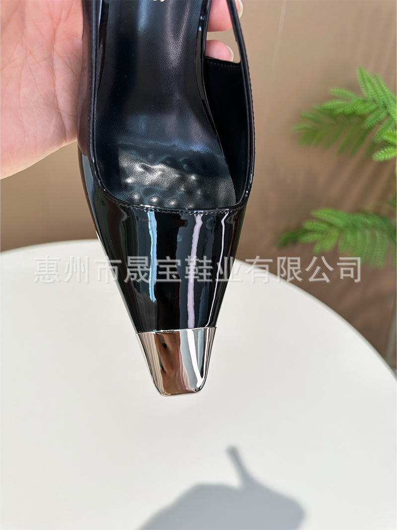 Yangshulin Baotou 샌들 여름 새로운 금속 철제 발가락 신발 여성 블랙 섹시한 특허 가죽 Pu Caiying 하이힐