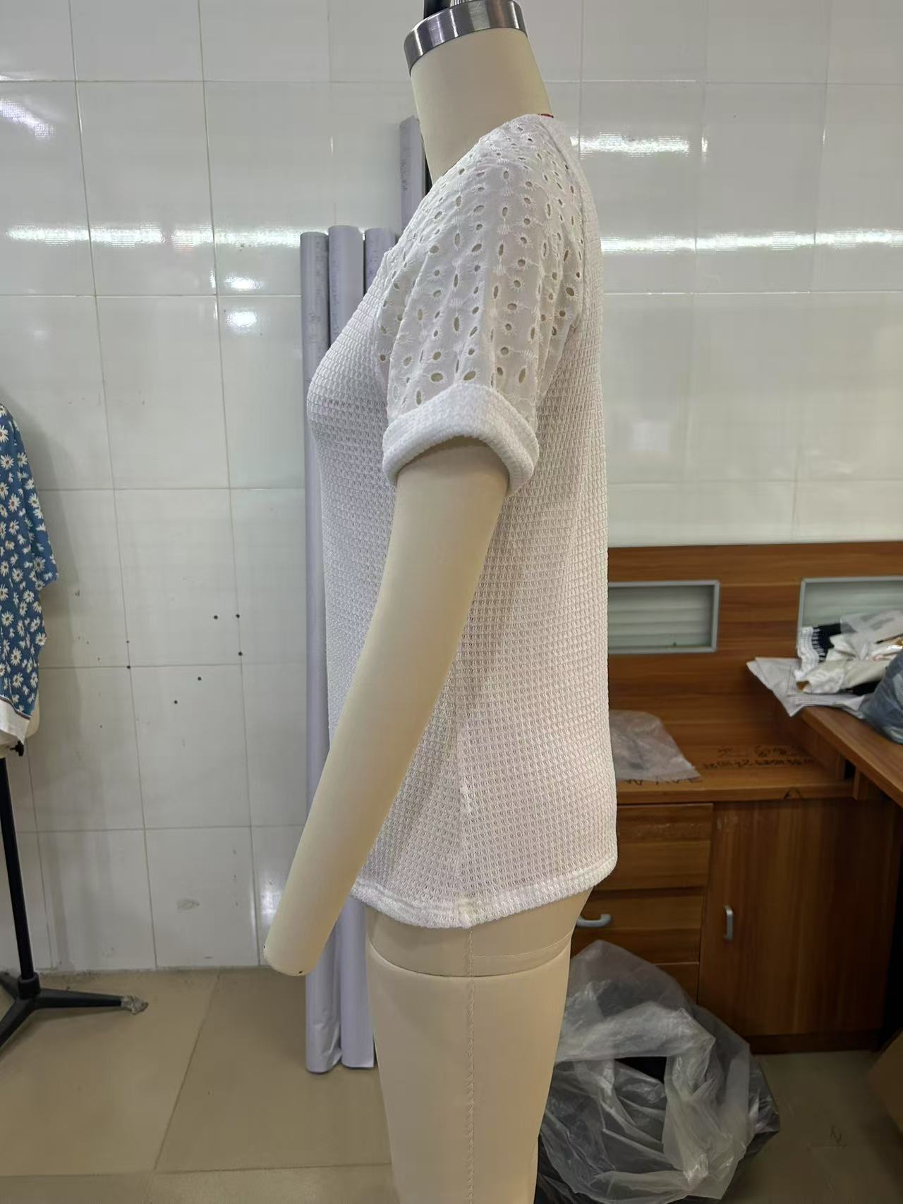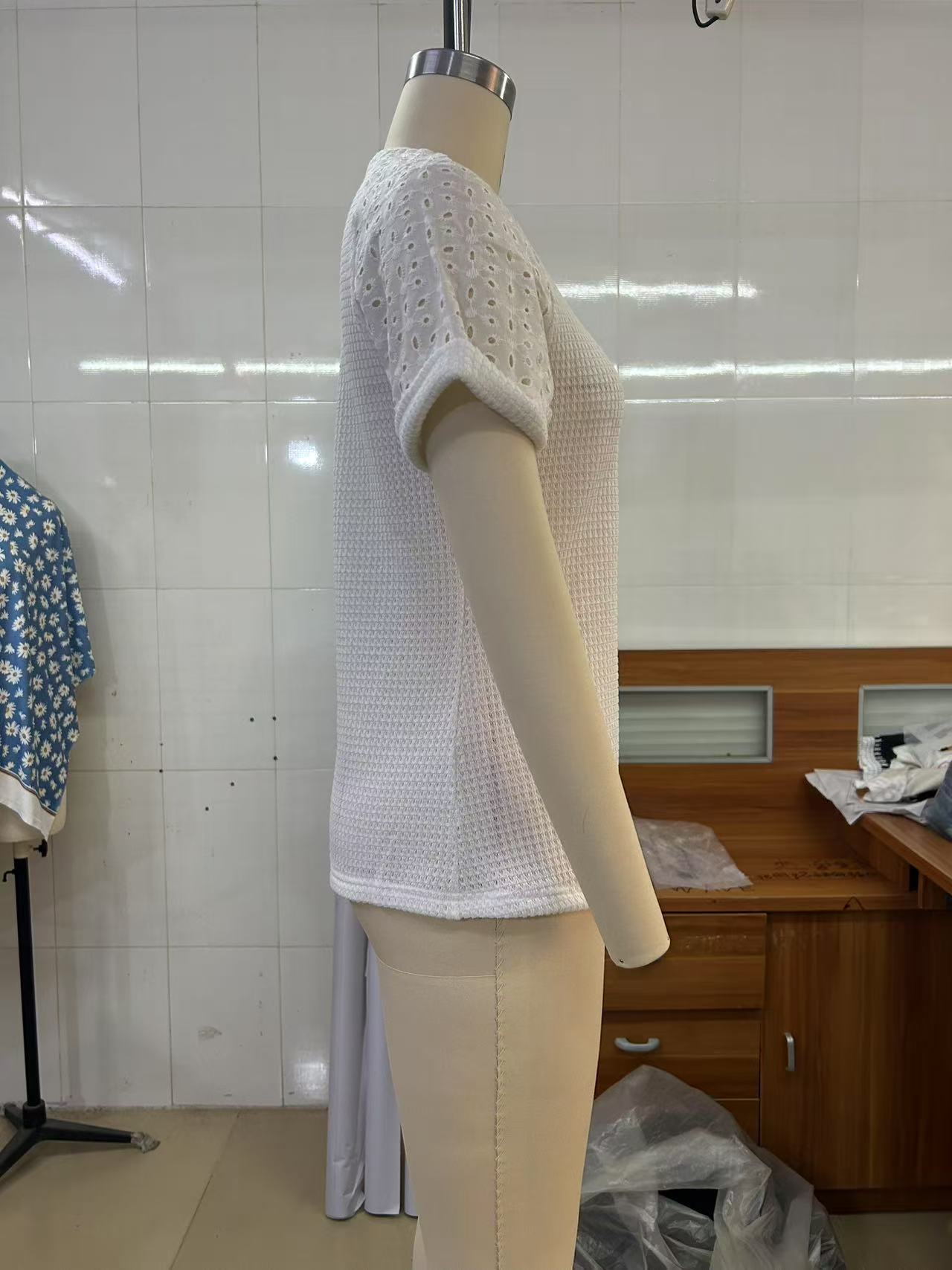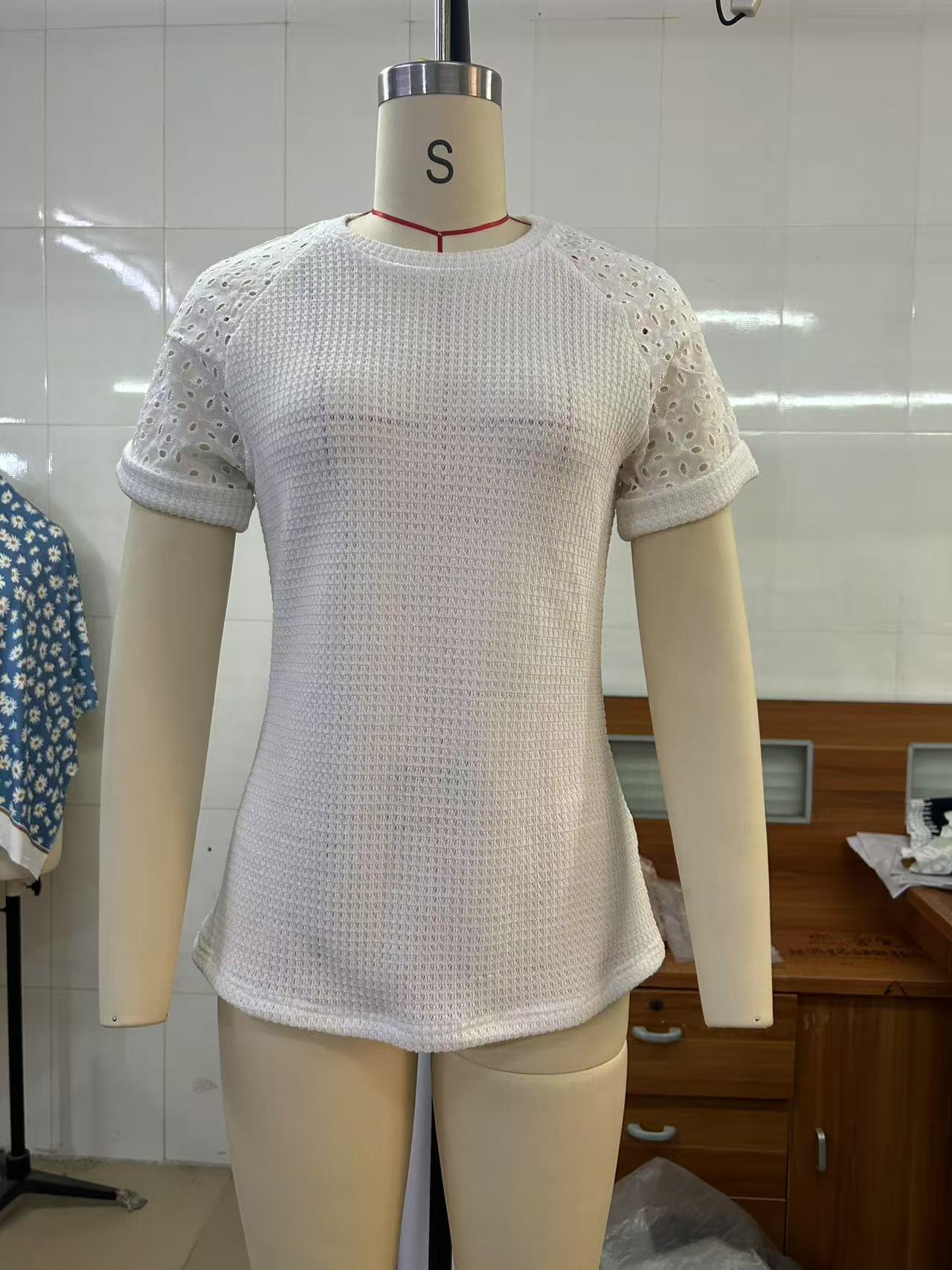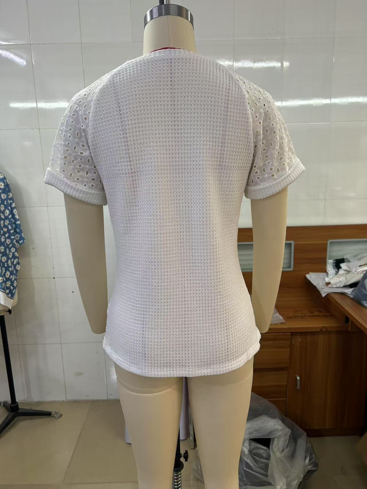 아마존 핫셀링 2026 유럽 및 미국 신상품 크로스보더 봄여름 라운드넥 레이스 스티치 반팔 티셔츠 여성복스토어 가기