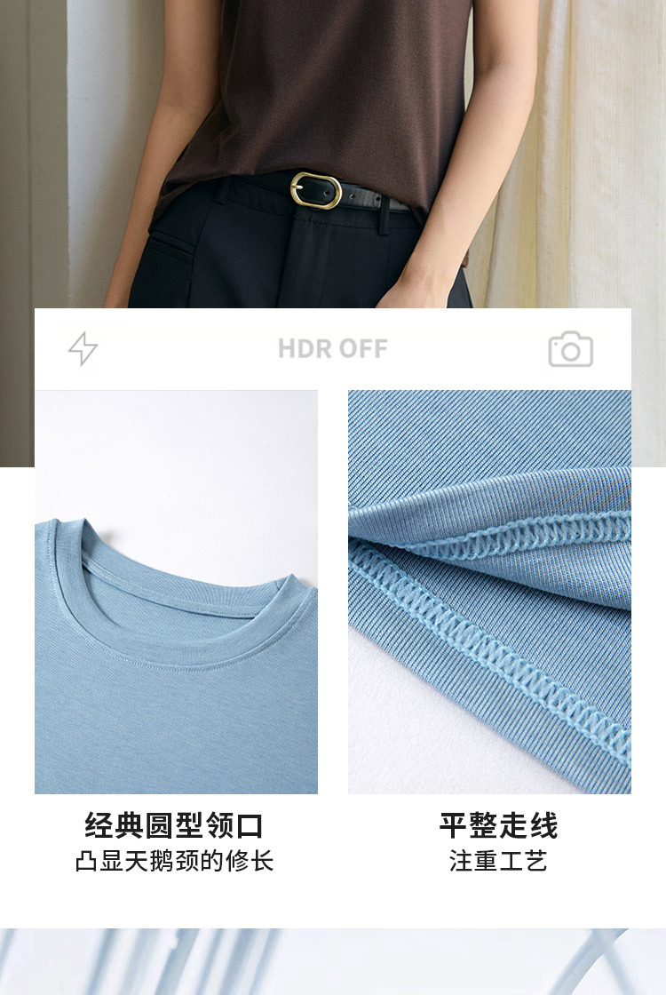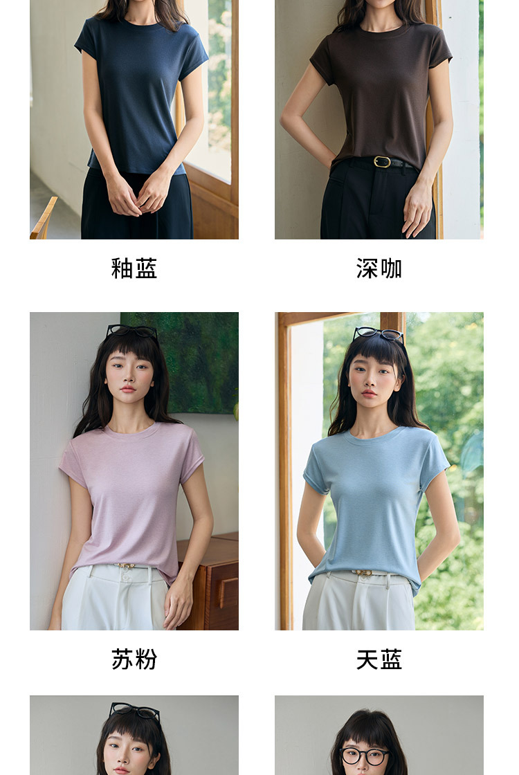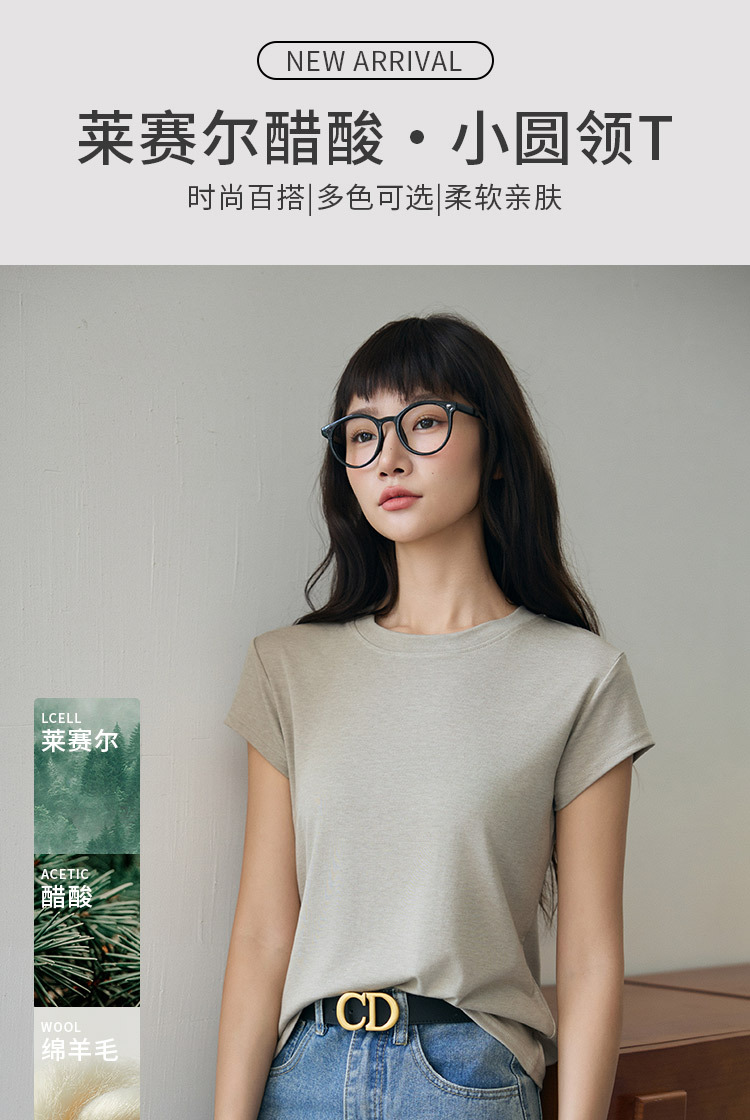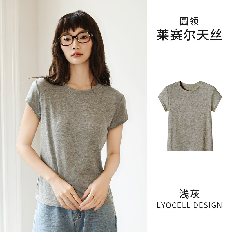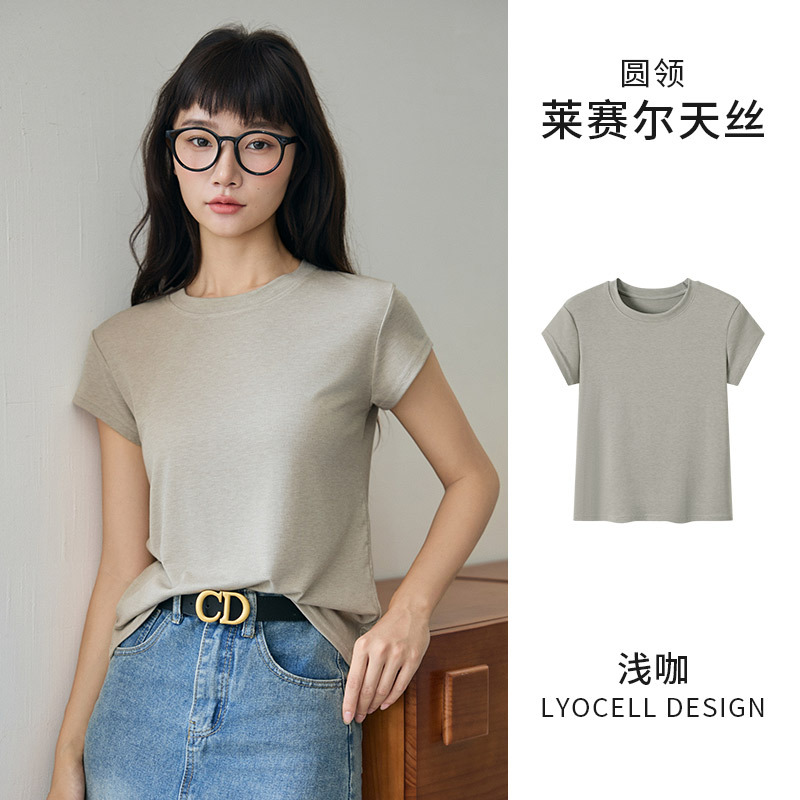 9962 Lyocell 라운드 넥 반팔 티셔츠 여성 여름 얇은 오른쪽 어깨 슬림 피트 아세테이트 울 다용도 탑스토어 가기