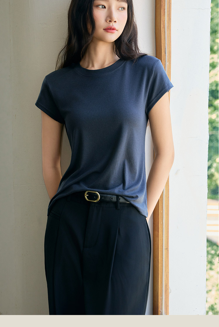 9962 Lyocell 라운드 넥 반팔 티셔츠 여성 여름 얇은 오른쪽 어깨 슬림 피트 아세테이트 울 다용도 탑