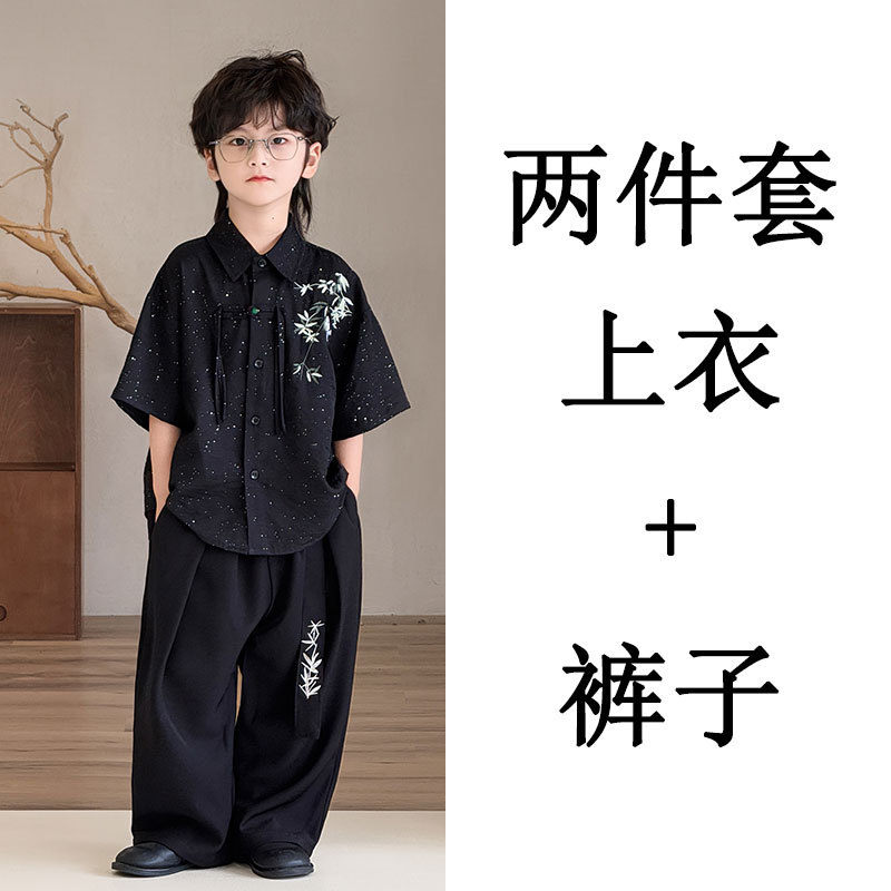 2025년 여름 인기 상품 소년용 블랙 앤티크 반팔 대나무 자수 + 루즈한 와이드 팬츠 트렌디한 드롭쉬핑