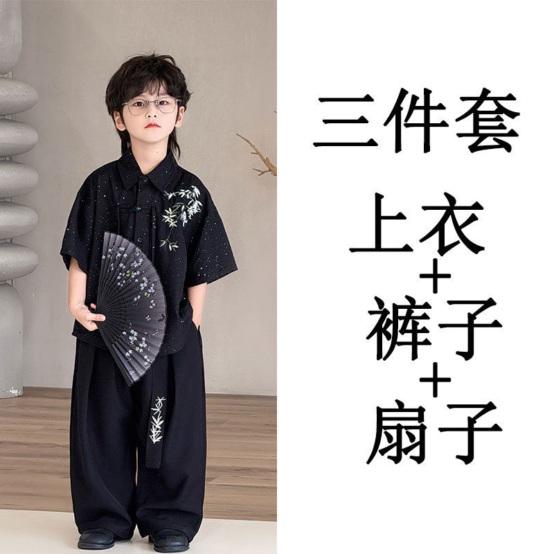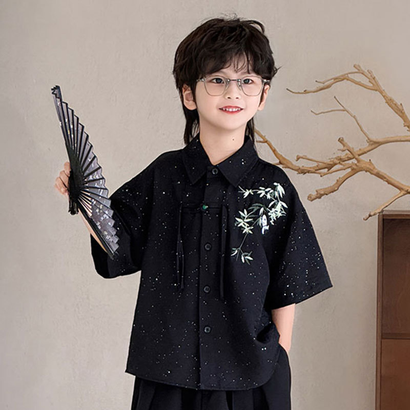 2025년 여름 인기 상품 소년용 블랙 앤티크 반팔 대나무 자수 + 루즈한 와이드 팬츠 트렌디한 드롭쉬핑스토어 가기