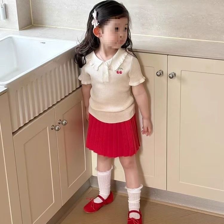 한국 아동복 여아 작은 향기 슈트 2025 여름 신작 중소형 아동 스타일 반팔 스웨터 주름 스커트